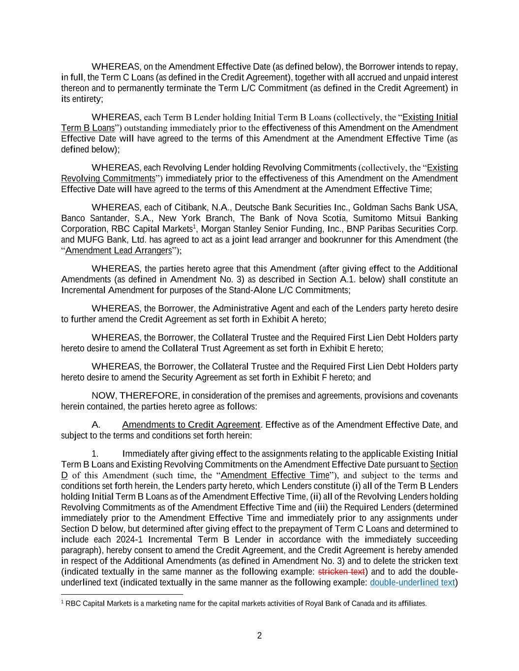 2 WHEREAS, on the Amendment Effective Date (as defined below), the Borrower intends to repay, in full, the Term C Loans (as defined in the Credit Agreement), together with all accrued and unpaid interest thereon and to permanently terminate the Term L/C Commitment (as defined in the Credit Agreement) in its entirety; WHEREAS, each Term B Lender holding Initial Term B Loans (collectively, the “Existing Initial Term B Loans”) outstanding immediately prior to the effectiveness of this Amendment on the Amendment Effective Date will have agreed to the terms of this Amendment at the Amendment Effective Time (as defined below); WHEREAS, each Revolving Lender holding Revolving Commitments (collectively, the “Existing Revolving Commitments”) immediately prior to the effectiveness of this Amendment on the Amendment Effective Date will have agreed to the terms of this Amendment at the Amendment Effective Time; WHEREAS, each of Citibank, N.A., Deutsche Bank Securities Inc., Goldman Sachs Bank USA, Banco Santander, S.A., New York Branch, The Bank of Nova Scotia, Sumitomo Mitsui Banking Corporation, RBC Capital Markets1, Morgan Stanley Senior Funding, Inc., BNP Paribas Securities Corp. and MUFG Bank, Ltd. has agreed to act as a joint lead arranger and bookrunner for this Amendment (the “Amendment Lead Arrangers”); WHEREAS, the parties hereto agree that this Amendment (after giving effect to the Additional Amendments (as defined in Amendment No. 3) as described in Section A.1. below) shall constitute an Incremental Amendment for purposes of the Stand-Alone L/C Commitments; WHEREAS, the Borrower, the Administrative Agent and each of the Lenders party hereto desire to further amend the Credit Agreement as set forth in Exhibit A hereto; WHEREAS, the Borrower, the Collateral Trustee and the Required First Lien Debt Holders party hereto desire to amend the Collateral Trust Agreement as set forth in Exhibit E hereto; WHEREAS, the Borrower, the Collateral Trustee and the Required First Lien Debt Holders party hereto desire to amend the Security Agreement as set forth in Exhibit F hereto; and NOW, THEREFORE, in consideration of the premises and agreements, provisions and covenants herein contained, the parties hereto agree as follows: A. Amendments to Credit Agreement. Effective as of the Amendment Effective Date, and subject to the terms and conditions set forth herein: 1. Immediately after giving effect to the assignments relating to the applicable Existing Initial Term B Loans and Existing Revolving Commitments on the Amendment Effective Date pursuant to Section D of this Amendment (such time, the “Amendment Effective Time”), and subject to the terms and conditions set forth herein, the Lenders party hereto, which Lenders constitute (i) all of the Term B Lenders holding Initial Term B Loans as of the Amendment Effective Time, (ii) all of the Revolving Lenders holding Revolving Commitments as of the Amendment Effective Time and (iii) the Required Lenders (determined immediately prior to the Amendment Effective Time and immediately prior to any assignments under Section D below, but determined after giving effect to the prepayment of Term C Loans and determined to include each 2024-1 Incremental Term B Lender in accordance with the immediately succeeding paragraph), hereby consent to amend the Credit Agreement, and the Credit Agreement is hereby amended in respect of the Additional Amendments (as defined in Amendment No. 3) and to delete the stricken text (indicated textually in the same manner as the following example: stricken text) and to add the double- underlined text (indicated textually in the same manner as the following example: double-underlined text) 1 RBC Capital Markets is a marketing name for the capital markets activities of Royal Bank of Canada and its affiliates.