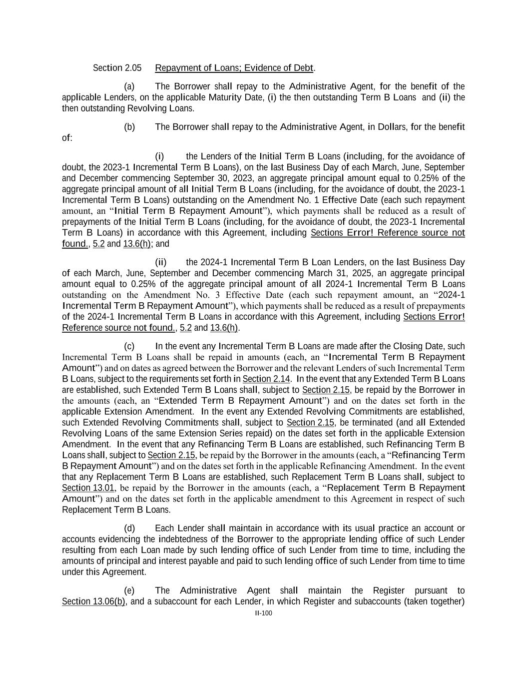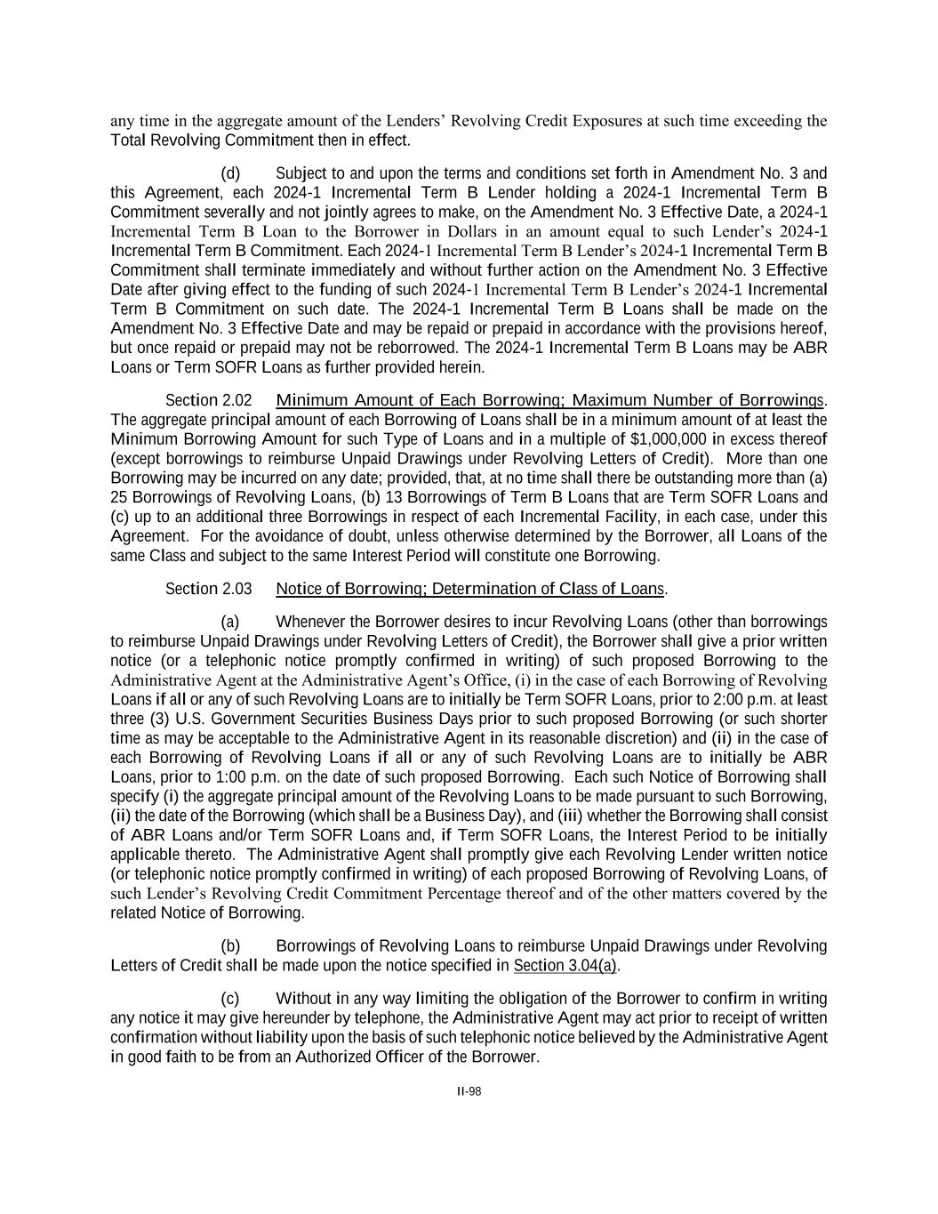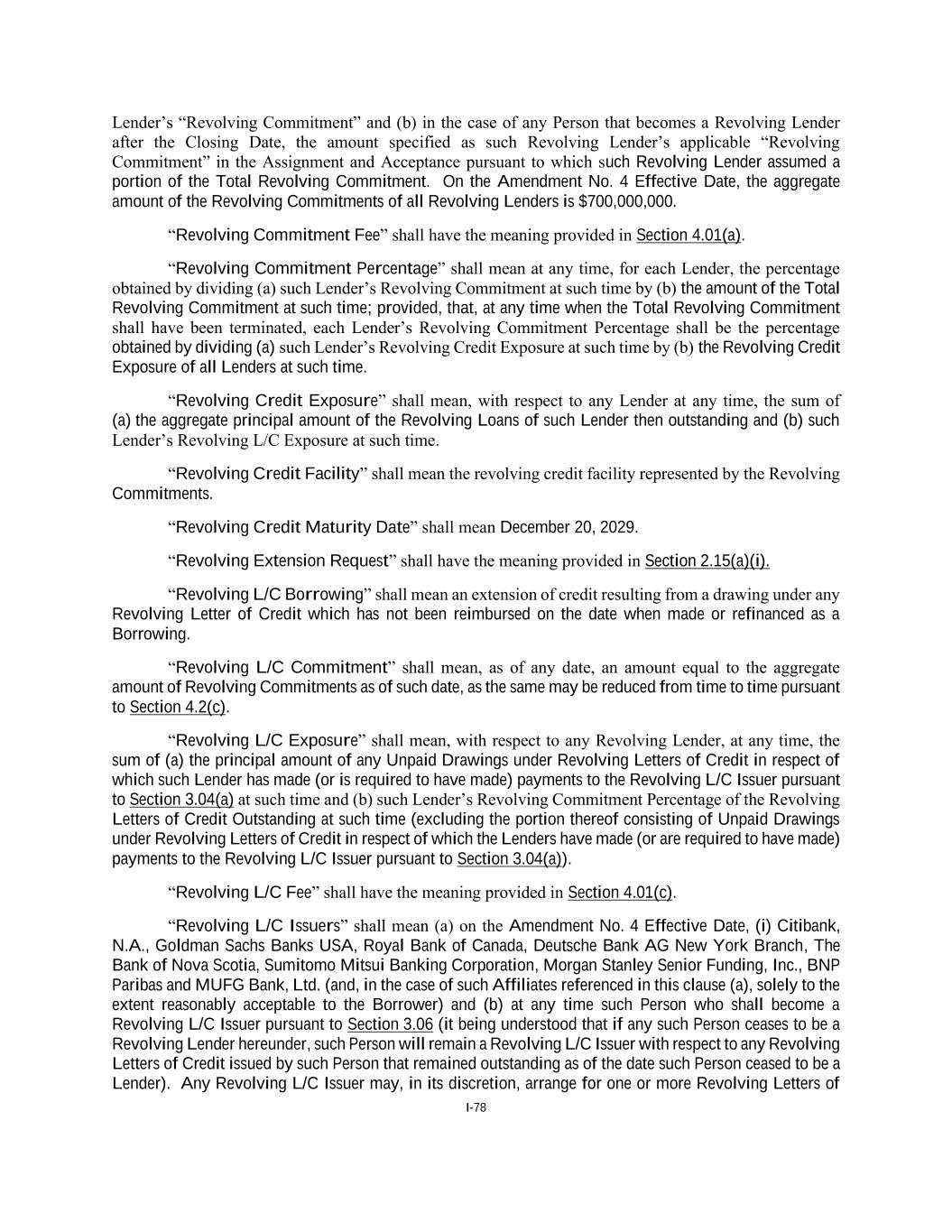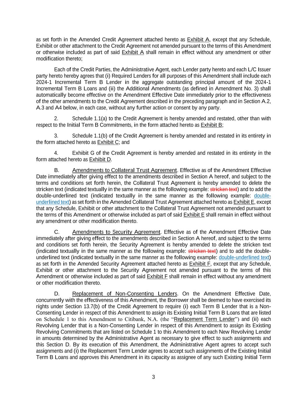 3 as set forth in the Amended Credit Agreement attached hereto as Exhibit A, except that any Schedule, Exhibit or other attachment to the Credit Agreement not amended pursuant to the terms of this Amendment or otherwise included as part of said Exhibit A shall remain in effect without any amendment or other modification thereto; Each of the Credit Parties, the Administrative Agent, each Lender party hereto and each L/C Issuer party hereto hereby agrees that (i) Required Lenders for all purposes of this Amendment shall include each 2024-1 Incremental Term B Lender in the aggregate outstanding principal amount of the 2024-1 Incremental Term B Loans and (ii) the Additional Amendments (as defined in Amendment No. 3) shall automatically become effective on the Amendment Effective Date immediately prior to the effectiveness of the other amendments to the Credit Agreement described in the preceding paragraph and in Section A.2, A.3 and A4 below, in each case, without any further action or consent by any party. 2. Schedule 1.1(a) to the Credit Agreement is hereby amended and restated, other than with respect to the Initial Term B Commitments, in the form attached hereto as Exhibit B; 3. Schedule 1.1(b) of the Credit Agreement is hereby amended and restated in its entirety in the form attached hereto as Exhibit C; and 4. Exhibit G of the Credit Agreement is hereby amended and restated in its entirety in the form attached hereto as Exhibit D. B. Amendments to Collateral Trust Agreement. Effective as of the Amendment Effective Date immediately after giving effect to the amendments described in Section A hereof, and subject to the terms and conditions set forth herein, the Collateral Trust Agreement is hereby amended to delete the stricken text (indicated textually in the same manner as the following example: stricken text) and to add the double-underlined text (indicated textually in the same manner as the following example: double- underlined text) as set forth in the Amended Collateral Trust Agreement attached hereto as Exhibit E, except that any Schedule, Exhibit or other attachment to the Collateral Trust Agreement not amended pursuant to the terms of this Amendment or otherwise included as part of said Exhibit E shall remain in effect without any amendment or other modification thereto. C. Amendments to Security Agreement. Effective as of the Amendment Effective Date immediately after giving effect to the amendments described in Section A hereof, and subject to the terms and conditions set forth herein, the Security Agreement is hereby amended to delete the stricken text (indicated textually in the same manner as the following example: stricken text) and to add the double- underlined text (indicated textually in the same manner as the following example: double-underlined text) as set forth in the Amended Security Agreement attached hereto as Exhibit F, except that any Schedule, Exhibit or other attachment to the Security Agreement not amended pursuant to the terms of this Amendment or otherwise included as part of said Exhibit F shall remain in effect without any amendment or other modification thereto. D. Replacement of Non-Consenting Lenders. On the Amendment Effective Date, concurrently with the effectiveness of this Amendment, the Borrower shall be deemed to have exercised its rights under Section 13.7(b) of the Credit Agreement to require (i) each Term B Lender that is a Non- Consenting Lender in respect of this Amendment to assign its Existing Initial Term B Loans that are listed on Schedule 1 to this Amendment to Citibank, N.A. (the “Replacement Term Lender”) and (ii) each Revolving Lender that is a Non-Consenting Lender in respect of this Amendment to assign its Existing Revolving Commitments that are listed on Schedule 1 to this Amendment to each New Revolving Lender in amounts determined by the Administrative Agent as necessary to give effect to such assignments and this Section D. By its execution of this Amendment, the Administrative Agent agrees to accept such assignments and (i) the Replacement Term Lender agrees to accept such assignments of the Existing Initial Term B Loans and approves this Amendment in its capacity as assignee of any such Existing Initial Term