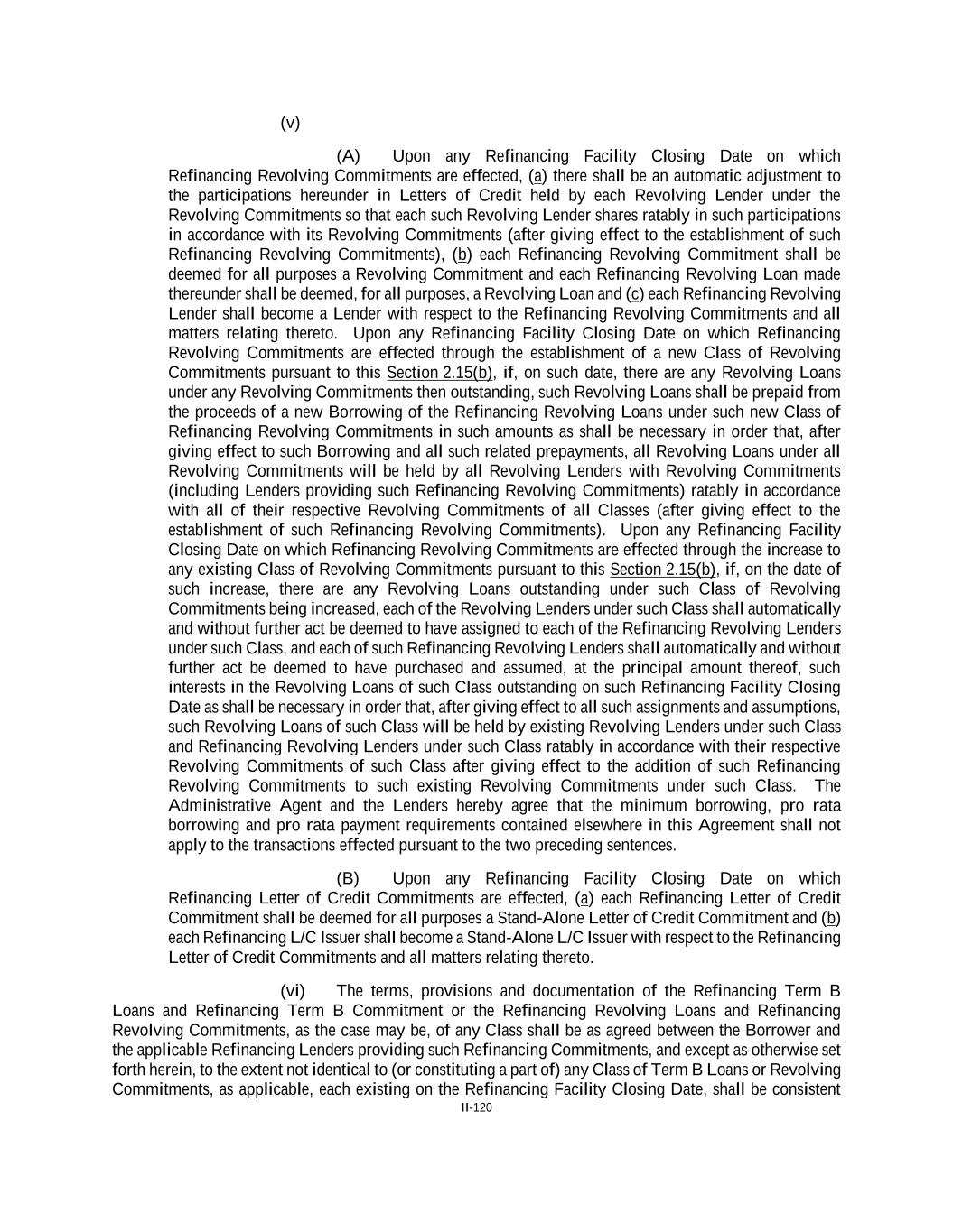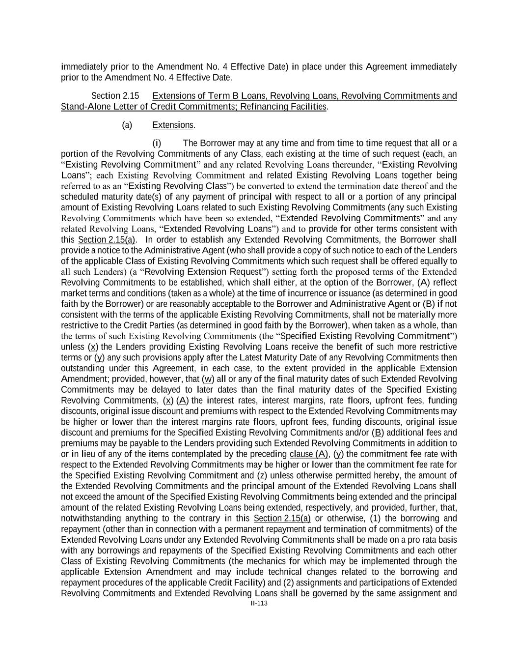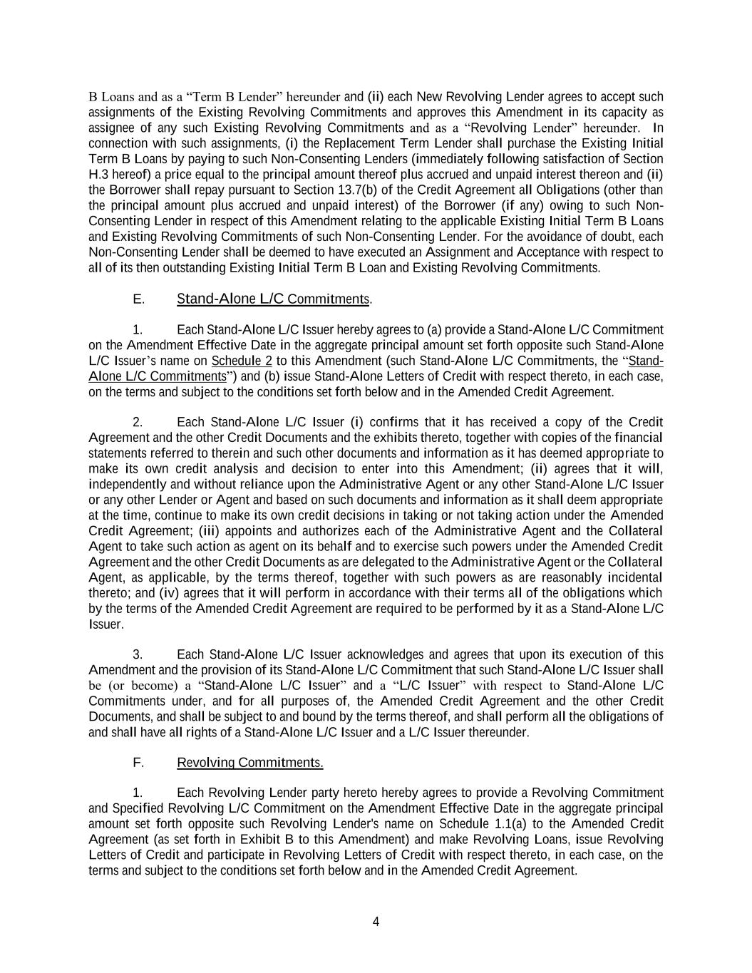 4 B Loans and as a “Term B Lender” hereunder and (ii) each New Revolving Lender agrees to accept such assignments of the Existing Revolving Commitments and approves this Amendment in its capacity as assignee of any such Existing Revolving Commitments and as a “Revolving Lender” hereunder. In connection with such assignments, (i) the Replacement Term Lender shall purchase the Existing Initial Term B Loans by paying to such Non-Consenting Lenders (immediately following satisfaction of Section H.3 hereof) a price equal to the principal amount thereof plus accrued and unpaid interest thereon and (ii) the Borrower shall repay pursuant to Section 13.7(b) of the Credit Agreement all Obligations (other than the principal amount plus accrued and unpaid interest) of the Borrower (if any) owing to such Non- Consenting Lender in respect of this Amendment relating to the applicable Existing Initial Term B Loans and Existing Revolving Commitments of such Non-Consenting Lender. For the avoidance of doubt, each Non-Consenting Lender shall be deemed to have executed an Assignment and Acceptance with respect to all of its then outstanding Existing Initial Term B Loan and Existing Revolving Commitments. E. Stand-Alone L/C Commitments. 1. Each Stand-Alone L/C Issuer hereby agrees to (a) provide a Stand-Alone L/C Commitment on the Amendment Effective Date in the aggregate principal amount set forth opposite such Stand-Alone L/C Issuer’s name on Schedule 2 to this Amendment (such Stand-Alone L/C Commitments, the “Stand- Alone L/C Commitments”) and (b) issue Stand-Alone Letters of Credit with respect thereto, in each case, on the terms and subject to the conditions set forth below and in the Amended Credit Agreement. 2. Each Stand-Alone L/C Issuer (i) confirms that it has received a copy of the Credit Agreement and the other Credit Documents and the exhibits thereto, together with copies of the financial statements referred to therein and such other documents and information as it has deemed appropriate to make its own credit analysis and decision to enter into this Amendment; (ii) agrees that it will, independently and without reliance upon the Administrative Agent or any other Stand-Alone L/C Issuer or any other Lender or Agent and based on such documents and information as it shall deem appropriate at the time, continue to make its own credit decisions in taking or not taking action under the Amended Credit Agreement; (iii) appoints and authorizes each of the Administrative Agent and the Collateral Agent to take such action as agent on its behalf and to exercise such powers under the Amended Credit Agreement and the other Credit Documents as are delegated to the Administrative Agent or the Collateral Agent, as applicable, by the terms thereof, together with such powers as are reasonably incidental thereto; and (iv) agrees that it will perform in accordance with their terms all of the obligations which by the terms of the Amended Credit Agreement are required to be performed by it as a Stand-Alone L/C Issuer. 3. Each Stand-Alone L/C Issuer acknowledges and agrees that upon its execution of this Amendment and the provision of its Stand-Alone L/C Commitment that such Stand-Alone L/C Issuer shall be (or become) a “Stand-Alone L/C Issuer” and a “L/C Issuer” with respect to Stand-Alone L/C Commitments under, and for all purposes of, the Amended Credit Agreement and the other Credit Documents, and shall be subject to and bound by the terms thereof, and shall perform all the obligations of and shall have all rights of a Stand-Alone L/C Issuer and a L/C Issuer thereunder. F. Revolving Commitments. 1. Each Revolving Lender party hereto hereby agrees to provide a Revolving Commitment and Specified Revolving L/C Commitment on the Amendment Effective Date in the aggregate principal amount set forth opposite such Revolving Lender's name on Schedule 1.1(a) to the Amended Credit Agreement (as set forth in Exhibit B to this Amendment) and make Revolving Loans, issue Revolving Letters of Credit and participate in Revolving Letters of Credit with respect thereto, in each case, on the terms and subject to the conditions set forth below and in the Amended Credit Agreement.