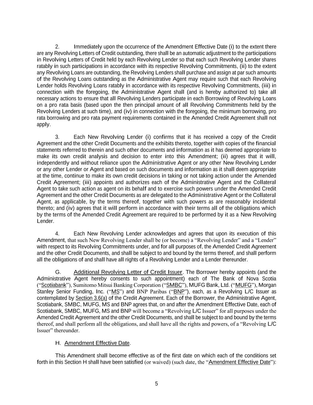 5 2. Immediately upon the occurrence of the Amendment Effective Date (i) to the extent there are any Revolving Letters of Credit outstanding, there shall be an automatic adjustment to the participations in Revolving Letters of Credit held by each Revolving Lender so that each such Revolving Lender shares ratably in such participations in accordance with its respective Revolving Commitments, (ii) to the extent any Revolving Loans are outstanding, the Revolving Lenders shall purchase and assign at par such amounts of the Revolving Loans outstanding as the Administrative Agent may require such that each Revolving Lender holds Revolving Loans ratably in accordance with its respective Revolving Commitments, (iii) in connection with the foregoing, the Administrative Agent shall (and is hereby authorized to) take all necessary actions to ensure that all Revolving Lenders participate in each Borrowing of Revolving Loans on a pro rata basis (based upon the then principal amount of all Revolving Commitments held by the Revolving Lenders at such time), and (iv) in connection with the foregoing, the minimum borrowing, pro rata borrowing and pro rata payment requirements contained in the Amended Credit Agreement shall not apply. 3. Each New Revolving Lender (i) confirms that it has received a copy of the Credit Agreement and the other Credit Documents and the exhibits thereto, together with copies of the financial statements referred to therein and such other documents and information as it has deemed appropriate to make its own credit analysis and decision to enter into this Amendment; (ii) agrees that it will, independently and without reliance upon the Administrative Agent or any other New Revolving Lender or any other Lender or Agent and based on such documents and information as it shall deem appropriate at the time, continue to make its own credit decisions in taking or not taking action under the Amended Credit Agreement; (iii) appoints and authorizes each of the Administrative Agent and the Collateral Agent to take such action as agent on its behalf and to exercise such powers under the Amended Credit Agreement and the other Credit Documents as are delegated to the Administrative Agent or the Collateral Agent, as applicable, by the terms thereof, together with such powers as are reasonably incidental thereto; and (iv) agrees that it will perform in accordance with their terms all of the obligations which by the terms of the Amended Credit Agreement are required to be performed by it as a New Revolving Lender. 4. Each New Revolving Lender acknowledges and agrees that upon its execution of this Amendment, that such New Revolving Lender shall be (or become) a “Revolving Lender” and a “Lender” with respect to its Revolving Commitments under, and for all purposes of, the Amended Credit Agreement and the other Credit Documents, and shall be subject to and bound by the terms thereof, and shall perform all the obligations of and shall have all rights of a Revolving Lender and a Lender thereunder. G. Additional Revolving Letter of Credit Issuer. The Borrower hereby appoints (and the Administrative Agent hereby consents to such appointment) each of The Bank of Nova Scotia (“Scotiabank”), Sumitomo Mitsui Banking Corporation (“SMBC”), MUFG Bank, Ltd. (“MUFG”), Morgan Stanley Senior Funding, Inc. (“MS”) and BNP Paribas (“BNP”), each, as a Revolving L/C Issuer as contemplated by Section 3.6(a) of the Credit Agreement. Each of the Borrower, the Administrative Agent, Scotiabank, SMBC, MUFG, MS and BNP agrees that, on and after the Amendment Effective Date, each of Scotiabank, SMBC, MUFG, MS and BNP will become a “Revolving L/C Issuer” for all purposes under the Amended Credit Agreement and the other Credit Documents, and shall be subject to and bound by the terms thereof, and shall perform all the obligations, and shall have all the rights and powers, of a “Revolving L/C Issuer” thereunder. H. Amendment Effective Date. This Amendment shall become effective as of the first date on which each of the conditions set forth in this Section H shall have been satisfied (or waived) (such date, the “Amendment Effective Date”):