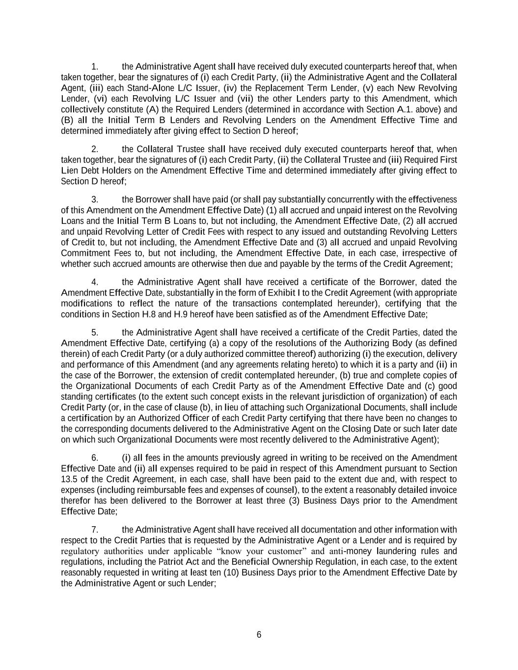 6 1. the Administrative Agent shall have received duly executed counterparts hereof that, when taken together, bear the signatures of (i) each Credit Party, (ii) the Administrative Agent and the Collateral Agent, (iii) each Stand-Alone L/C Issuer, (iv) the Replacement Term Lender, (v) each New Revolving Lender, (vi) each Revolving L/C Issuer and (vii) the other Lenders party to this Amendment, which collectively constitute (A) the Required Lenders (determined in accordance with Section A.1. above) and (B) all the Initial Term B Lenders and Revolving Lenders on the Amendment Effective Time and determined immediately after giving effect to Section D hereof; 2. the Collateral Trustee shall have received duly executed counterparts hereof that, when taken together, bear the signatures of (i) each Credit Party, (ii) the Collateral Trustee and (iii) Required First Lien Debt Holders on the Amendment Effective Time and determined immediately after giving effect to Section D hereof; 3. the Borrower shall have paid (or shall pay substantially concurrently with the effectiveness of this Amendment on the Amendment Effective Date) (1) all accrued and unpaid interest on the Revolving Loans and the Initial Term B Loans to, but not including, the Amendment Effective Date, (2) all accrued and unpaid Revolving Letter of Credit Fees with respect to any issued and outstanding Revolving Letters of Credit to, but not including, the Amendment Effective Date and (3) all accrued and unpaid Revolving Commitment Fees to, but not including, the Amendment Effective Date, in each case, irrespective of whether such accrued amounts are otherwise then due and payable by the terms of the Credit Agreement; 4. the Administrative Agent shall have received a certificate of the Borrower, dated the Amendment Effective Date, substantially in the form of Exhibit I to the Credit Agreement (with appropriate modifications to reflect the nature of the transactions contemplated hereunder), certifying that the conditions in Section H.8 and H.9 hereof have been satisfied as of the Amendment Effective Date; 5. the Administrative Agent shall have received a certificate of the Credit Parties, dated the Amendment Effective Date, certifying (a) a copy of the resolutions of the Authorizing Body (as defined therein) of each Credit Party (or a duly authorized committee thereof) authorizing (i) the execution, delivery and performance of this Amendment (and any agreements relating hereto) to which it is a party and (ii) in the case of the Borrower, the extension of credit contemplated hereunder, (b) true and complete copies of the Organizational Documents of each Credit Party as of the Amendment Effective Date and (c) good standing certificates (to the extent such concept exists in the relevant jurisdiction of organization) of each Credit Party (or, in the case of clause (b), in lieu of attaching such Organizational Documents, shall include a certification by an Authorized Officer of each Credit Party certifying that there have been no changes to the corresponding documents delivered to the Administrative Agent on the Closing Date or such later date on which such Organizational Documents were most recently delivered to the Administrative Agent); 6. (i) all fees in the amounts previously agreed in writing to be received on the Amendment Effective Date and (ii) all expenses required to be paid in respect of this Amendment pursuant to Section 13.5 of the Credit Agreement, in each case, shall have been paid to the extent due and, with respect to expenses (including reimbursable fees and expenses of counsel), to the extent a reasonably detailed invoice therefor has been delivered to the Borrower at least three (3) Business Days prior to the Amendment Effective Date; 7. the Administrative Agent shall have received all documentation and other information with respect to the Credit Parties that is requested by the Administrative Agent or a Lender and is required by regulatory authorities under applicable “know your customer” and anti-money laundering rules and regulations, including the Patriot Act and the Beneficial Ownership Regulation, in each case, to the extent reasonably requested in writing at least ten (10) Business Days prior to the Amendment Effective Date by the Administrative Agent or such Lender;