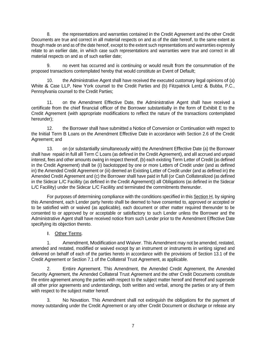 7 8. the representations and warranties contained in the Credit Agreement and the other Credit Documents are true and correct in all material respects on and as of the date hereof, to the same extent as though made on and as of the date hereof, except to the extent such representations and warranties expressly relate to an earlier date, in which case such representations and warranties were true and correct in all material respects on and as of such earlier date; 9. no event has occurred and is continuing or would result from the consummation of the proposed transactions contemplated hereby that would constitute an Event of Default; 10. the Administrative Agent shall have received the executed customary legal opinions of (a) White & Case LLP, New York counsel to the Credit Parties and (b) Fitzpatrick Lentz & Bubba, P.C., Pennsylvania counsel to the Credit Parties; 11. on the Amendment Effective Date, the Administrative Agent shall have received a certificate from the chief financial officer of the Borrower substantially in the form of Exhibit E to the Credit Agreement (with appropriate modifications to reflect the nature of the transactions contemplated hereunder); 12. the Borrower shall have submitted a Notice of Conversion or Continuation with respect to the Initial Term B Loans on the Amendment Effective Date in accordance with Section 2.6 of the Credit Agreement; and 13. on (or substantially simultaneously with) the Amendment Effective Date (a) the Borrower shall have repaid in full all Term C Loans (as defined in the Credit Agreement), and all accrued and unpaid interest, fees and other amounts owing in respect thereof, (b) each existing Term Letter of Credit (as defined in the Credit Agreement) shall be (i) backstopped by one or more Letters of Credit under (and as defined in) the Amended Credit Agreement or (ii) deemed an Existing Letter of Credit under (and as defined in) the Amended Credit Agreement and (c) the Borrower shall have paid in full (or Cash Collateralized (as defined in the Sidecar L/C Facility (as defined in the Credit Agreement)) all Obligations (as defined in the Sidecar L/C Facility) under the Sidecar L/C Facility and terminated the commitments thereunder. For purposes of determining compliance with the conditions specified in this Section H, by signing this Amendment, each Lender party hereto shall be deemed to have consented to, approved or accepted or to be satisfied with or waived (as applicable), each document or other matter required thereunder to be consented to or approved by or acceptable or satisfactory to such Lender unless the Borrower and the Administrative Agent shall have received notice from such Lender prior to the Amendment Effective Date specifying its objection thereto. I. Other Terms. 1. Amendment, Modification and Waiver. This Amendment may not be amended, restated, amended and restated, modified or waived except by an instrument or instruments in writing signed and delivered on behalf of each of the parties hereto in accordance with the provisions of Section 13.1 of the Credit Agreement or Section 7.1 of the Collateral Trust Agreement, as applicable. 2. Entire Agreement. This Amendment, the Amended Credit Agreement, the Amended Security Agreement, the Amended Collateral Trust Agreement and the other Credit Documents constitute the entire agreement among the parties with respect to the subject matter hereof and thereof and supersede all other prior agreements and understandings, both written and verbal, among the parties or any of them with respect to the subject matter hereof. 3. No Novation. This Amendment shall not extinguish the obligations for the payment of money outstanding under the Credit Agreement or any other Credit Document or discharge or release any