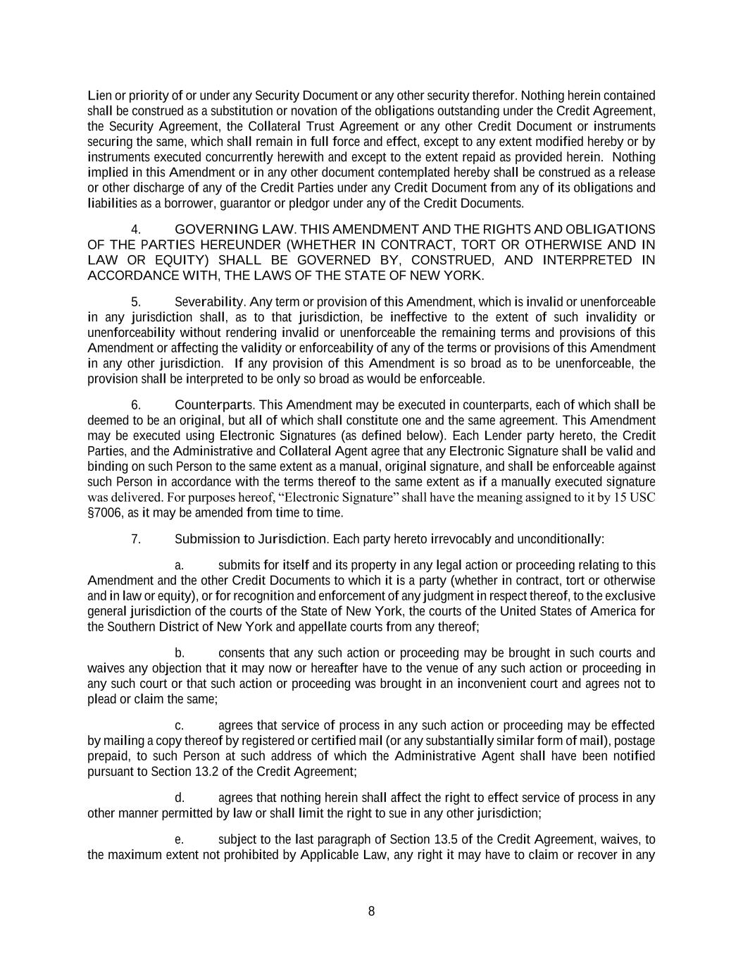 8 Lien or priority of or under any Security Document or any other security therefor. Nothing herein contained shall be construed as a substitution or novation of the obligations outstanding under the Credit Agreement, the Security Agreement, the Collateral Trust Agreement or any other Credit Document or instruments securing the same, which shall remain in full force and effect, except to any extent modified hereby or by instruments executed concurrently herewith and except to the extent repaid as provided herein. Nothing implied in this Amendment or in any other document contemplated hereby shall be construed as a release or other discharge of any of the Credit Parties under any Credit Document from any of its obligations and liabilities as a borrower, guarantor or pledgor under any of the Credit Documents. 4. GOVERNING LAW. THIS AMENDMENT AND THE RIGHTS AND OBLIGATIONS OF THE PARTIES HEREUNDER (WHETHER IN CONTRACT, TORT OR OTHERWISE AND IN LAW OR EQUITY) SHALL BE GOVERNED BY, CONSTRUED, AND INTERPRETED IN ACCORDANCE WITH, THE LAWS OF THE STATE OF NEW YORK. 5. Severability. Any term or provision of this Amendment, which is invalid or unenforceable in any jurisdiction shall, as to that jurisdiction, be ineffective to the extent of such invalidity or unenforceability without rendering invalid or unenforceable the remaining terms and provisions of this Amendment or affecting the validity or enforceability of any of the terms or provisions of this Amendment in any other jurisdiction. If any provision of this Amendment is so broad as to be unenforceable, the provision shall be interpreted to be only so broad as would be enforceable. 6. Counterparts. This Amendment may be executed in counterparts, each of which shall be deemed to be an original, but all of which shall constitute one and the same agreement. This Amendment may be executed using Electronic Signatures (as defined below). Each Lender party hereto, the Credit Parties, and the Administrative and Collateral Agent agree that any Electronic Signature shall be valid and binding on such Person to the same extent as a manual, original signature, and shall be enforceable against such Person in accordance with the terms thereof to the same extent as if a manually executed signature was delivered. For purposes hereof, “Electronic Signature” shall have the meaning assigned to it by 15 USC §7006, as it may be amended from time to time. 7. Submission to Jurisdiction. Each party hereto irrevocably and unconditionally: a. submits for itself and its property in any legal action or proceeding relating to this Amendment and the other Credit Documents to which it is a party (whether in contract, tort or otherwise and in law or equity), or for recognition and enforcement of any judgment in respect thereof, to the exclusive general jurisdiction of the courts of the State of New York, the courts of the United States of America for the Southern District of New York and appellate courts from any thereof; b. consents that any such action or proceeding may be brought in such courts and waives any objection that it may now or hereafter have to the venue of any such action or proceeding in any such court or that such action or proceeding was brought in an inconvenient court and agrees not to plead or claim the same; c. agrees that service of process in any such action or proceeding may be effected by mailing a copy thereof by registered or certified mail (or any substantially similar form of mail), postage prepaid, to such Person at such address of which the Administrative Agent shall have been notified pursuant to Section 13.2 of the Credit Agreement; d. agrees that nothing herein shall affect the right to effect service of process in any other manner permitted by law or shall limit the right to sue in any other jurisdiction; e. subject to the last paragraph of Section 13.5 of the Credit Agreement, waives, to the maximum extent not prohibited by Applicable Law, any right it may have to claim or recover in any