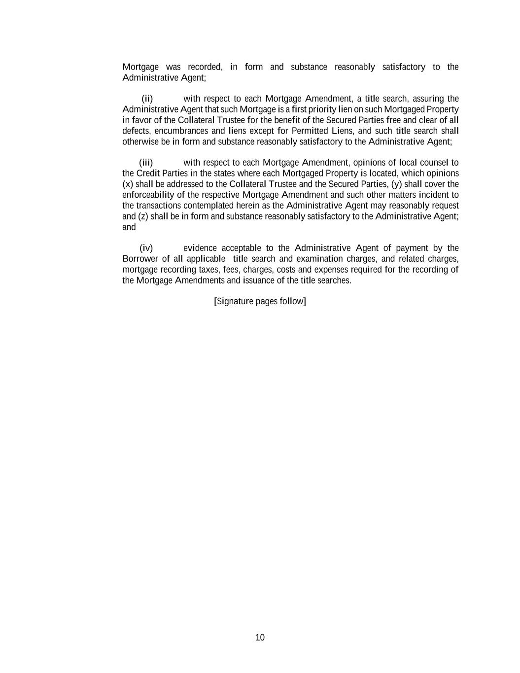 10 Mortgage was recorded, in form and substance reasonably satisfactory to the Administrative Agent; (ii) with respect to each Mortgage Amendment, a title search, assuring the Administrative Agent that such Mortgage is a first priority lien on such Mortgaged Property in favor of the Collateral Trustee for the benefit of the Secured Parties free and clear of all defects, encumbrances and liens except for Permitted Liens, and such title search shall otherwise be in form and substance reasonably satisfactory to the Administrative Agent; (iii) with respect to each Mortgage Amendment, opinions of local counsel to the Credit Parties in the states where each Mortgaged Property is located, which opinions (x) shall be addressed to the Collateral Trustee and the Secured Parties, (y) shall cover the enforceability of the respective Mortgage Amendment and such other matters incident to the transactions contemplated herein as the Administrative Agent may reasonably request and (z) shall be in form and substance reasonably satisfactory to the Administrative Agent; and (iv) evidence acceptable to the Administrative Agent of payment by the Borrower of all applicable title search and examination charges, and related charges, mortgage recording taxes, fees, charges, costs and expenses required for the recording of the Mortgage Amendments and issuance of the title searches. [Signature pages follow]