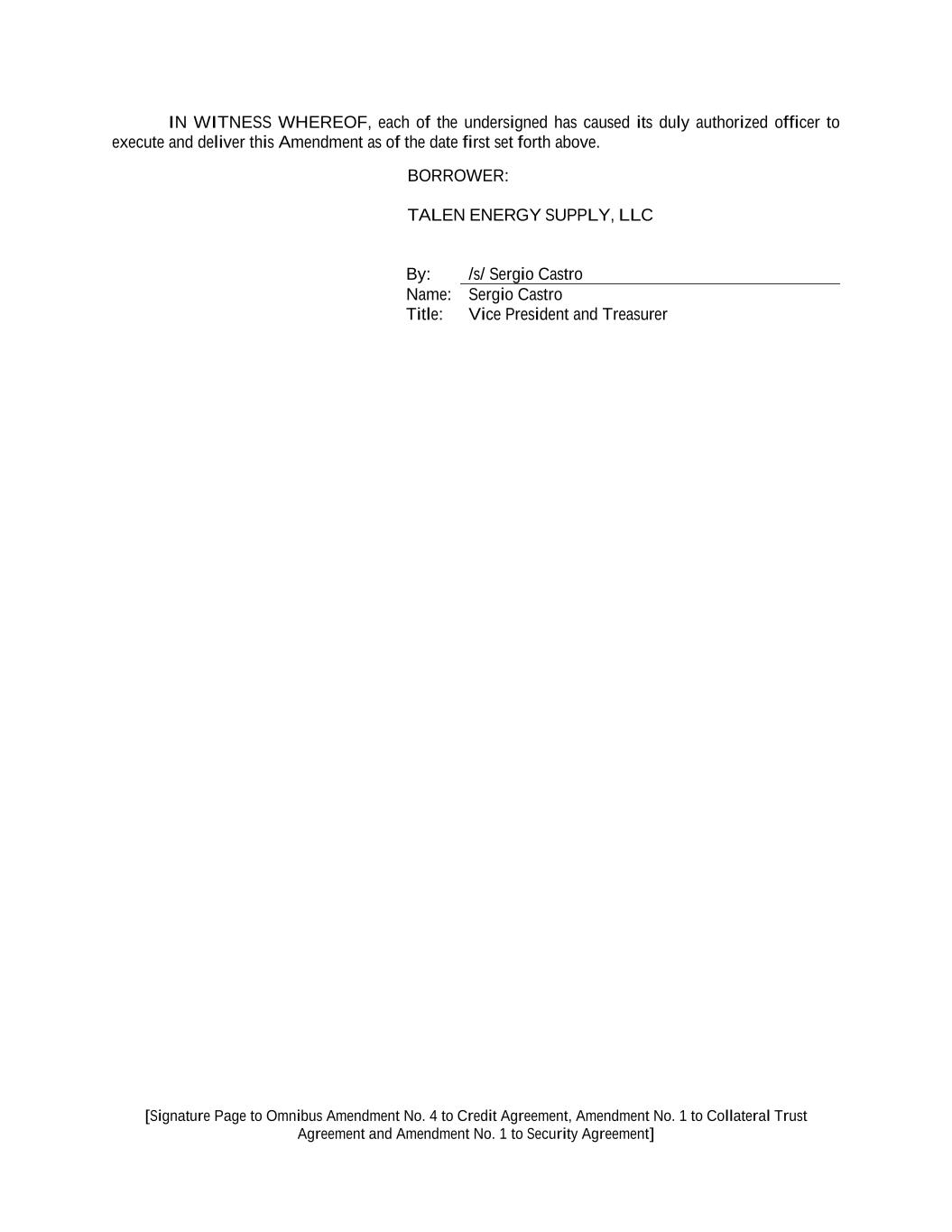 [Signature Page to Omnibus Amendment No. 4 to Credit Agreement, Amendment No. 1 to Collateral Trust Agreement and Amendment No. 1 to Security Agreement] IN WITNESS WHEREOF, each of the undersigned has caused its duly authorized officer to execute and deliver this Amendment as of the date first set forth above. BORROWER: TALEN ENERGY SUPPLY, LLC By: /s/ Sergio Castro Name: Sergio Castro Title: Vice President and Treasurer