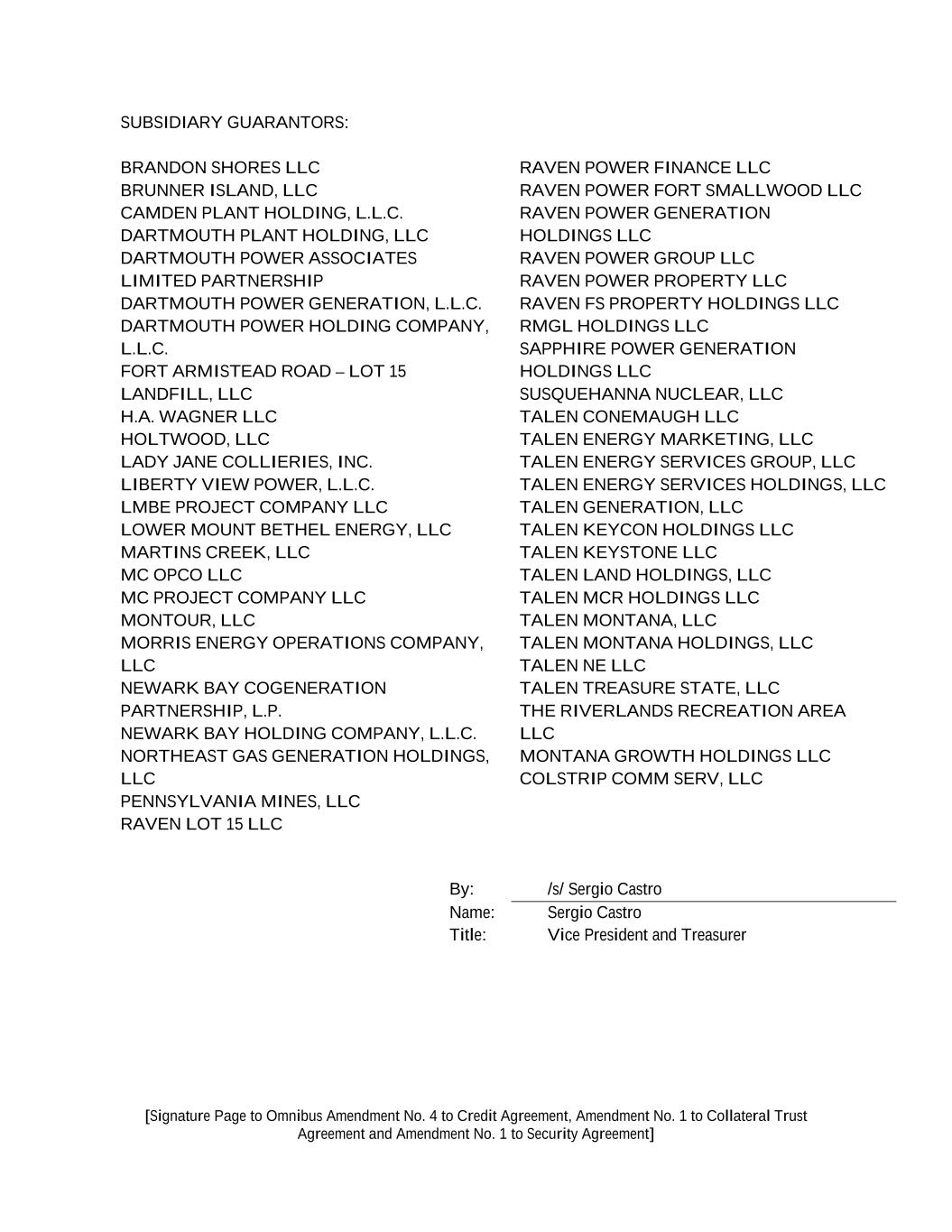 [Signature Page to Omnibus Amendment No. 4 to Credit Agreement, Amendment No. 1 to Collateral Trust Agreement and Amendment No. 1 to Security Agreement] SUBSIDIARY GUARANTORS: BRANDON SHORES LLC RAVEN POWER FINANCE LLC BRUNNER ISLAND, LLC CAMDEN PLANT HOLDING, L.L.C. DARTMOUTH PLANT HOLDING, LLC DARTMOUTH POWER ASSOCIATES LIMITED PARTNERSHIP DARTMOUTH POWER GENERATION, L.L.C. DARTMOUTH POWER HOLDING COMPANY, L.L.C. FORT ARMISTEAD ROAD – LOT 15 LANDFILL, LLC H.A. WAGNER LLC HOLTWOOD, LLC LADY JANE COLLIERIES, INC. LIBERTY VIEW POWER, L.L.C. LMBE PROJECT COMPANY LLC LOWER MOUNT BETHEL ENERGY, LLC MARTINS CREEK, LLC MC OPCO LLC MC PROJECT COMPANY LLC MONTOUR, LLC MORRIS ENERGY OPERATIONS COMPANY, LLC NEWARK BAY COGENERATION PARTNERSHIP, L.P. NEWARK BAY HOLDING COMPANY, L.L.C. NORTHEAST GAS GENERATION HOLDINGS, LLC PENNSYLVANIA MINES, LLC RAVEN LOT 15 LLC RAVEN POWER FORT SMALLWOOD LLC RAVEN POWER GENERATION HOLDINGS LLC RAVEN POWER GROUP LLC RAVEN POWER PROPERTY LLC RAVEN FS PROPERTY HOLDINGS LLC RMGL HOLDINGS LLC SAPPHIRE POWER GENERATION HOLDINGS LLC SUSQUEHANNA NUCLEAR, LLC TALEN CONEMAUGH LLC TALEN ENERGY MARKETING, LLC TALEN ENERGY SERVICES GROUP, LLC TALEN ENERGY SERVICES HOLDINGS, LLC TALEN GENERATION, LLC TALEN KEYCON HOLDINGS LLC TALEN KEYSTONE LLC TALEN LAND HOLDINGS, LLC TALEN MCR HOLDINGS LLC TALEN MONTANA, LLC TALEN MONTANA HOLDINGS, LLC TALEN NE LLC TALEN TREASURE STATE, LLC THE RIVERLANDS RECREATION AREA LLC MONTANA GROWTH HOLDINGS LLC COLSTRIP COMM SERV, LLC By: /s/ Sergio Castro Name: Sergio Castro Title: Vice President and Treasurer