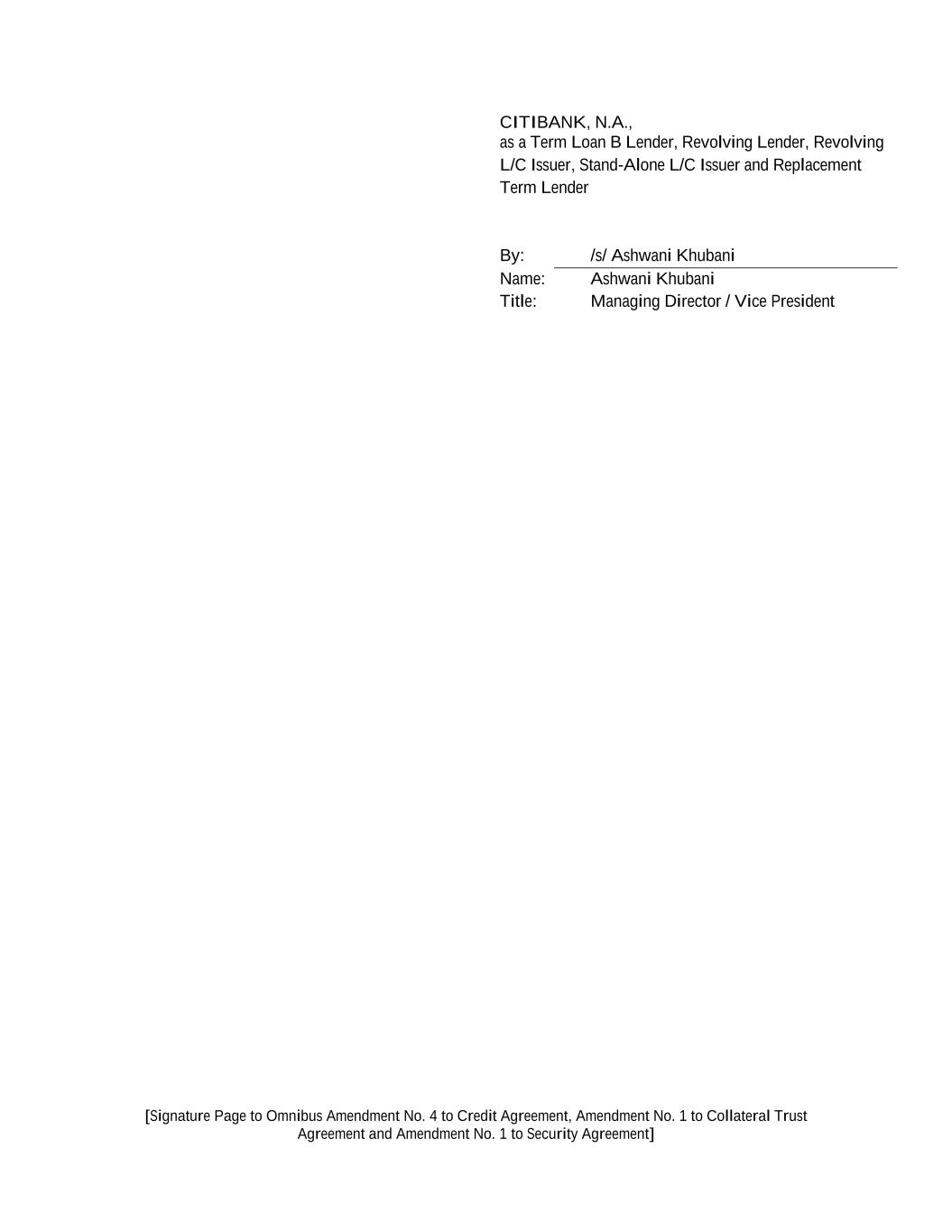 [Signature Page to Omnibus Amendment No. 4 to Credit Agreement, Amendment No. 1 to Collateral Trust Agreement and Amendment No. 1 to Security Agreement] CITIBANK, N.A., as a Term Loan B Lender, Revolving Lender, Revolving L/C Issuer, Stand-Alone L/C Issuer and Replacement Term Lender By: /s/ Ashwani Khubani Name: Ashwani Khubani Title: Managing Director / Vice President