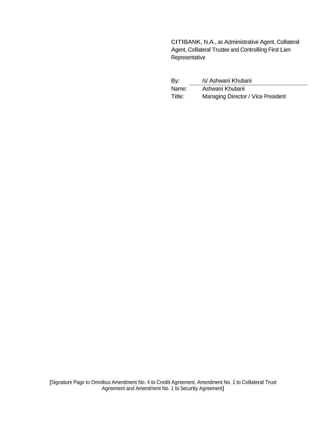[Signature Page to Omnibus Amendment No. 4 to Credit Agreement, Amendment No. 1 to Collateral Trust Agreement and Amendment No. 1 to Security Agreement] CITIBANK, N.A., as Administrative Agent, Collateral Agent, Collateral Trustee and Controlling First Lien Representative By: /s/ Ashwani Khubani Name: Ashwani Khubani Title: Managing Director / Vice President