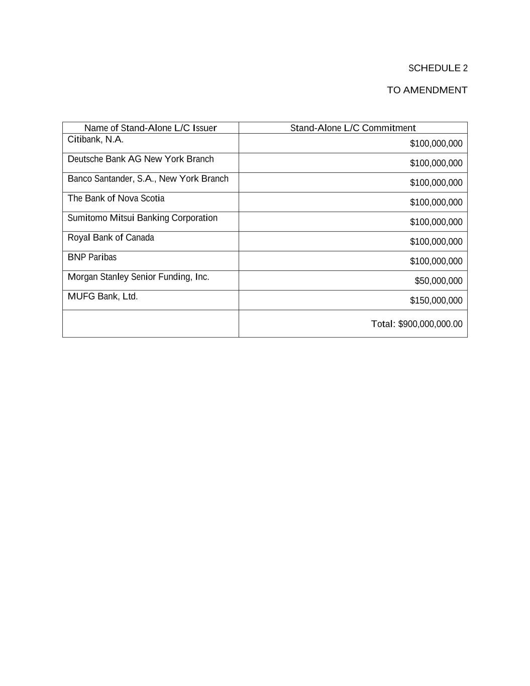 SCHEDULE 2 TO AMENDMENT Name of Stand-Alone L/C Issuer Stand-Alone L/C Commitment Citibank, N.A. $100,000,000 Deutsche Bank AG New York Branch $100,000,000 Banco Santander, S.A., New York Branch $100,000,000 The Bank of Nova Scotia $100,000,000 Sumitomo Mitsui Banking Corporation $100,000,000 Royal Bank of Canada $100,000,000 BNP Paribas $100,000,000 Morgan Stanley Senior Funding, Inc. $50,000,000 MUFG Bank, Ltd. $150,000,000 Total: $900,000,000.00