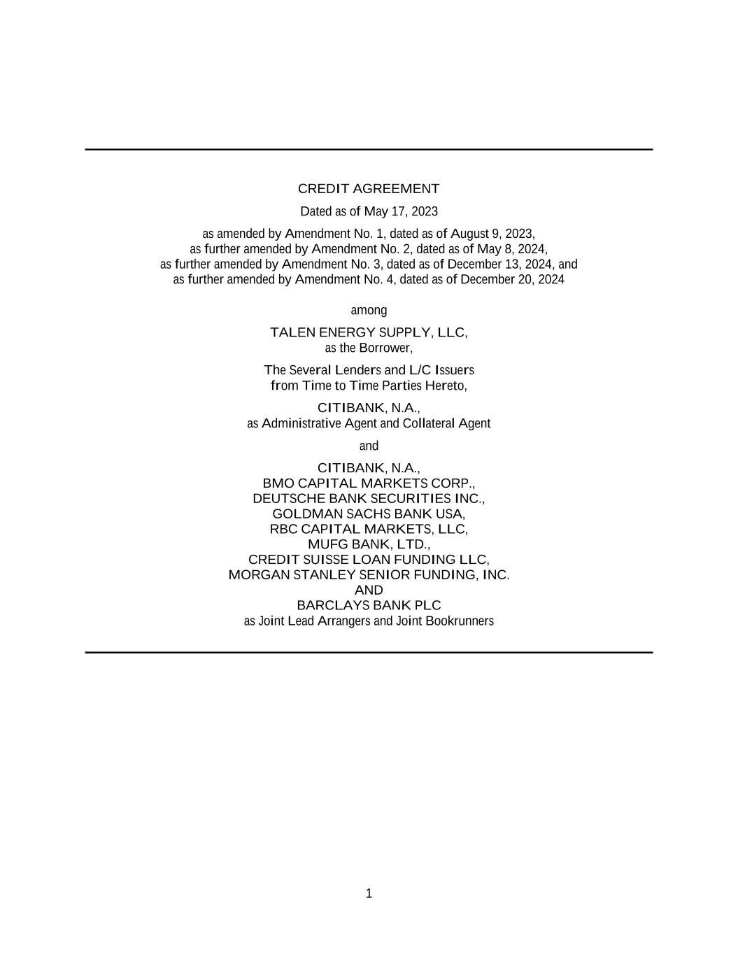 1 CREDIT AGREEMENT Dated as of May 17, 2023 as amended by Amendment No. 1, dated as of August 9, 2023, as further amended by Amendment No. 2, dated as of May 8, 2024, as further amended by Amendment No. 3, dated as of December 13, 2024, and as further amended by Amendment No. 4, dated as of December 20, 2024 among TALEN ENERGY SUPPLY, LLC, as the Borrower, The Several Lenders and L/C Issuers from Time to Time Parties Hereto, CITIBANK, N.A., as Administrative Agent and Collateral Agent and CITIBANK, N.A., BMO CAPITAL MARKETS CORP., DEUTSCHE BANK SECURITIES INC., GOLDMAN SACHS BANK USA, RBC CAPITAL MARKETS, LLC, MUFG BANK, LTD., CREDIT SUISSE LOAN FUNDING LLC, MORGAN STANLEY SENIOR FUNDING, INC. AND BARCLAYS BANK PLC as Joint Lead Arrangers and Joint Bookrunners