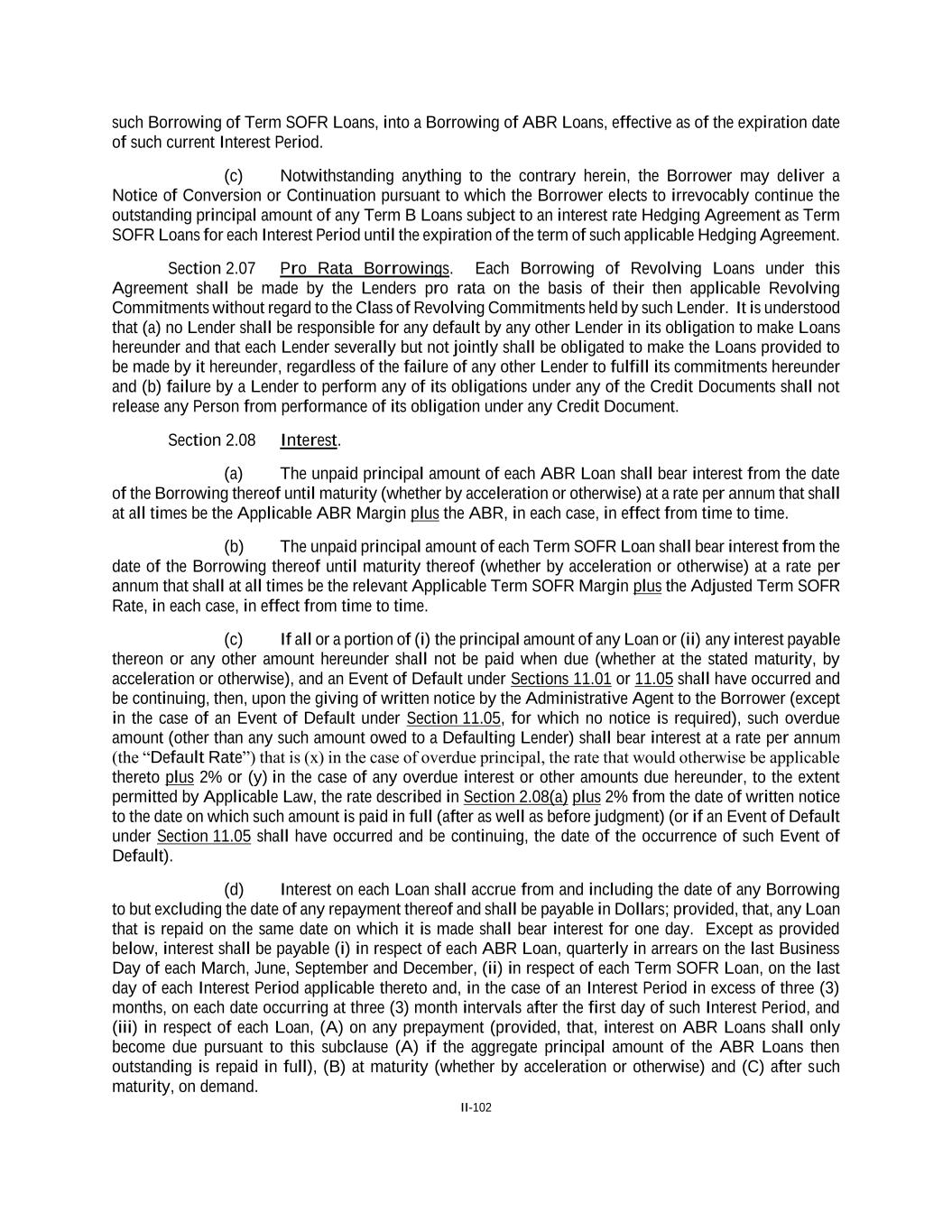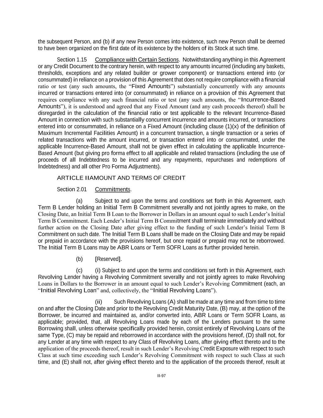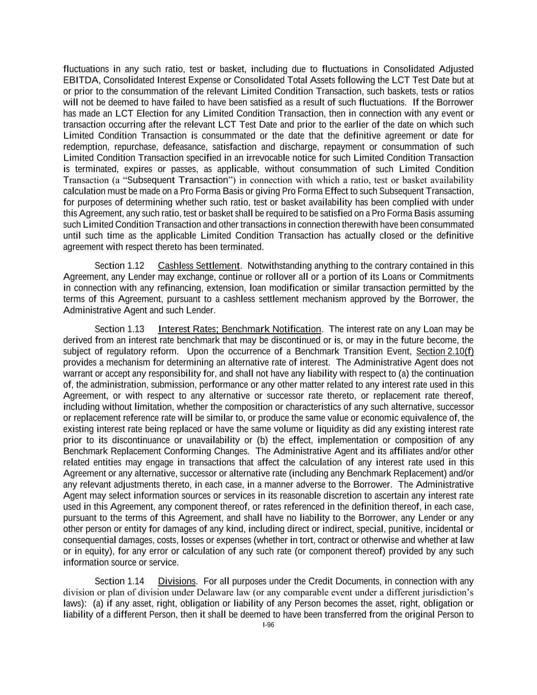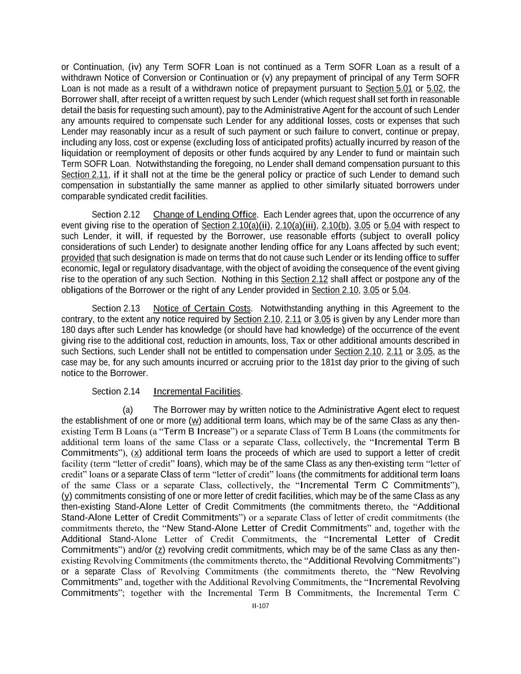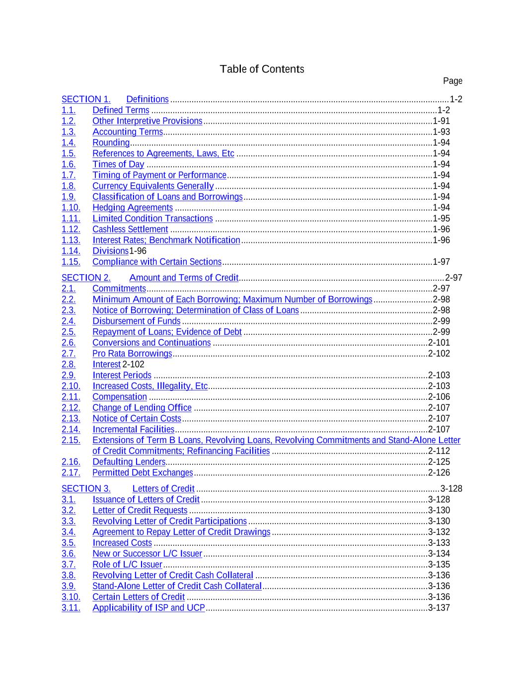 Table of Contents Page SECTION 1. Definitions ...................................................................................................................... 1-2 1.1. Defined Terms ......................................................................................................................... 1-2 1.2. Other Interpretive Provisions ................................................................................................. 1-91 1.3. Accounting Terms .................................................................................................................. 1-93 1.4. Rounding ................................................................................................................................ 1-94 1.5. References to Agreements, Laws, Etc ................................................................................... 1-94 1.6. Times of Day ......................................................................................................................... 1-94 1.7. Timing of Payment or Performance ....................................................................................... 1-94 1.8. Currency Equivalents Generally ............................................................................................ 1-94 1.9. Classification of Loans and Borrowings ................................................................................ 1-94 1.10. Hedging Agreements ............................................................................................................. 1-94 1.11. Limited Condition Transactions ............................................................................................ 1-95 1.12. Cashless Settlement ............................................................................................................... 1-96 1.13. Interest Rates; Benchmark Notification ................................................................................. 1-96 1.14. Divisions 1-96 1.15. Compliance with Certain Sections ......................................................................................... 1-97 SECTION 2. Amount and Terms of Credit ....................................................................................... 2-97 2.1. Commitments ......................................................................................................................... 2-97 2.2. Minimum Amount of Each Borrowing; Maximum Number of Borrowings ......................... 2-98 2.3. Notice of Borrowing; Determination of Class of Loans ........................................................ 2-98 2.4. Disbursement of Funds .......................................................................................................... 2-99 2.5. Repayment of Loans; Evidence of Debt ................................................................................ 2-99 2.6. Conversions and Continuations ........................................................................................... 2-101 2.7. Pro Rata Borrowings ............................................................................................................ 2-102 2.8. Interest 2-102 2.9. Interest Periods .................................................................................................................... 2-103 2.10. Increased Costs, Illegality, Etc ............................................................................................. 2-103 2.11. Compensation ...................................................................................................................... 2-106 2.12. Change of Lending Office ................................................................................................... 2-107 2.13. Notice of Certain Costs ........................................................................................................ 2-107 2.14. Incremental Facilities ........................................................................................................... 2-107 2.15. Extensions of Term B Loans, Revolving Loans, Revolving Commitments and Stand-Alone Letter of Credit Commitments; Refinancing Facilities .................................................................. 2-112 2.16. Defaulting Lenders............................................................................................................... 2-125 2.17. Permitted Debt Exchanges ................................................................................................... 2-126 SECTION 3. Letters of Credit ....................................................................................................... 3-128 3.1. Issuance of Letters of Credit ................................................................................................ 3-128 3.2. Letter of Credit Requests ..................................................................................................... 3-130 3.3. Revolving Letter of Credit Participations ............................................................................ 3-130 3.4. Agreement to Repay Letter of Credit Drawings .................................................................. 3-132 3.5. Increased Costs .................................................................................................................... 3-133 3.6. New or Successor L/C Issuer ............................................................................................... 3-134 3.7. Role of L/C Issuer ................................................................................................................ 3-135 3.8. Revolving Letter of Credit Cash Collateral ......................................................................... 3-136 3.9. Stand-Alone Letter of Credit Cash Collateral ...................................................................... 3-136 3.10. Certain Letters of Credit ...................................................................................................... 3-136