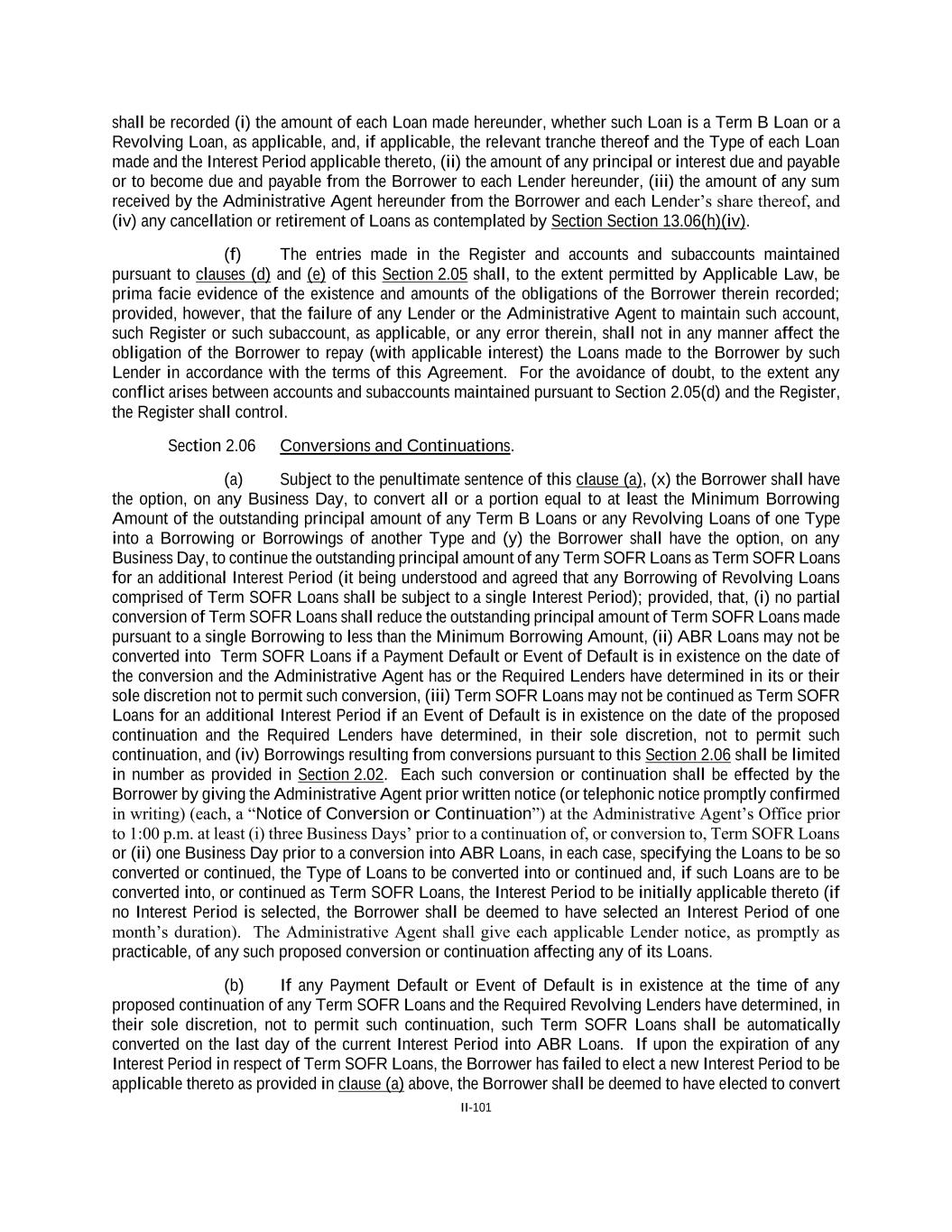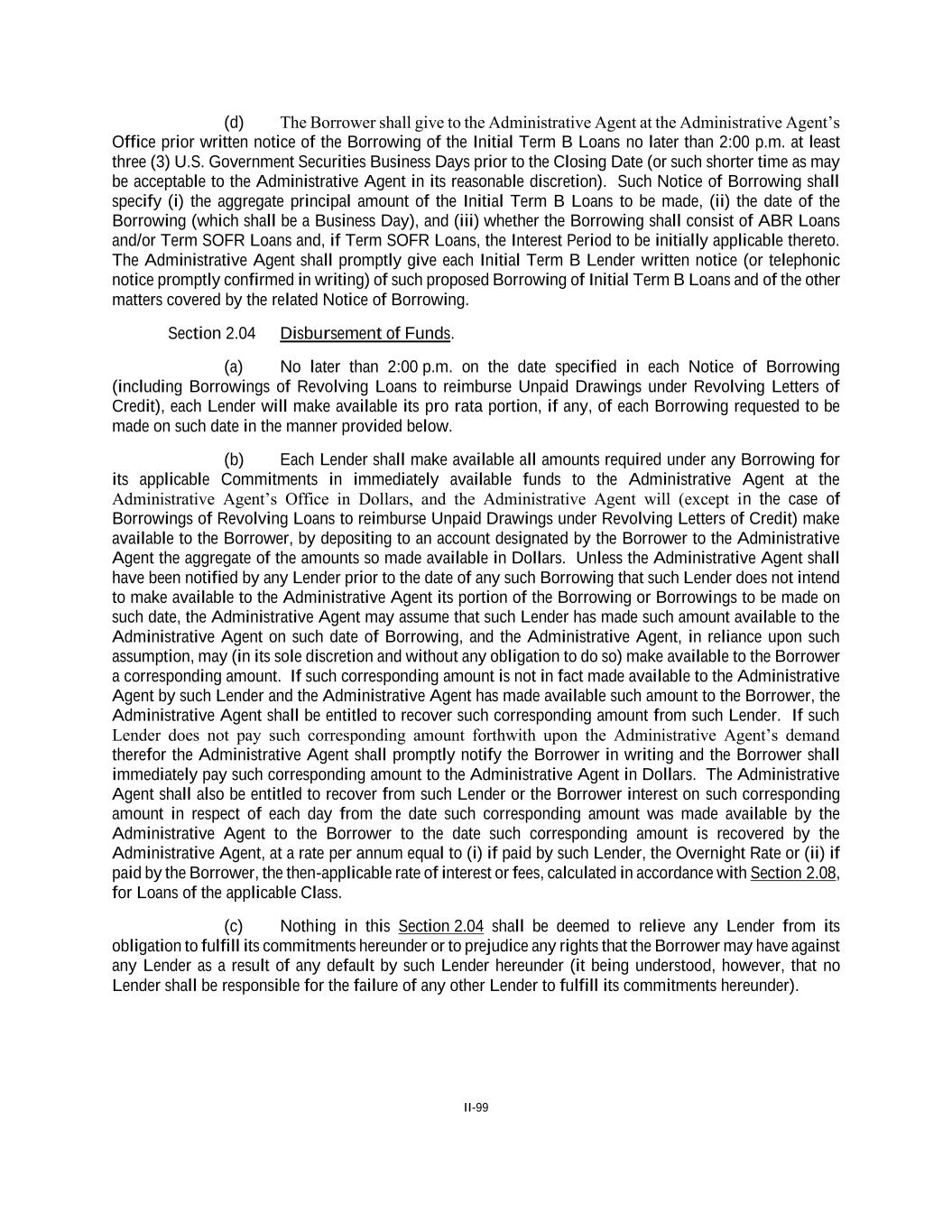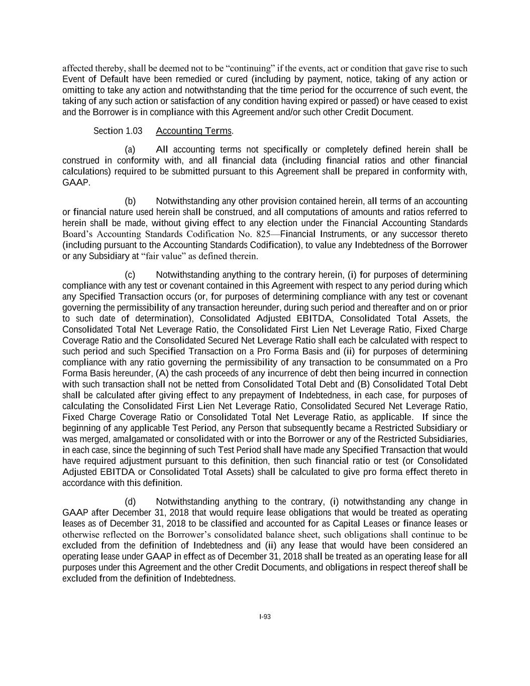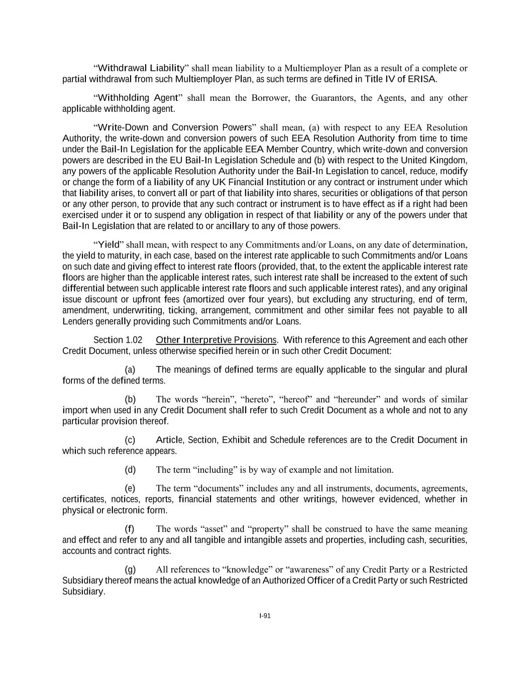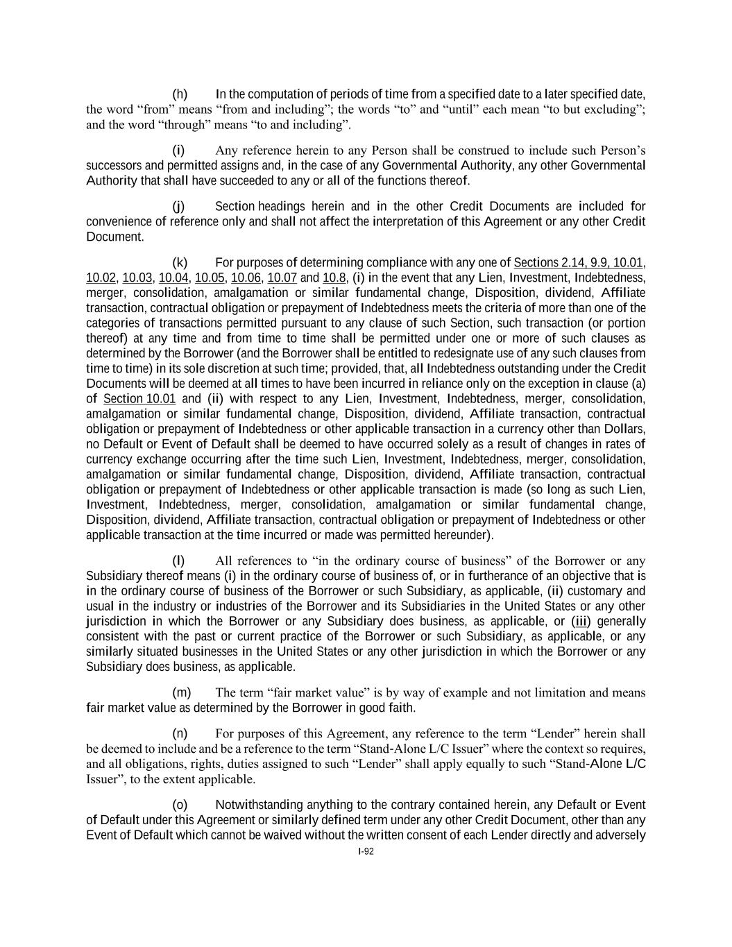 Table of Contents Page SECTION 1. Definitions ...................................................................................................................... 1-2 1.1. Defined Terms ......................................................................................................................... 1-2 1.2. Other Interpretive Provisions ................................................................................................. 1-91 1.3. Accounting Terms .................................................................................................................. 1-93 1.4. Rounding ................................................................................................................................ 1-94 1.5. References to Agreements, Laws, Etc ................................................................................... 1-94 1.6. Times of Day ......................................................................................................................... 1-94 1.7. Timing of Payment or Performance ....................................................................................... 1-94 1.8. Currency Equivalents Generally ............................................................................................ 1-94 1.9. Classification of Loans and Borrowings ................................................................................ 1-94 1.10. Hedging Agreements ............................................................................................................. 1-94 1.11. Limited Condition Transactions ............................................................................................ 1-95 1.12. Cashless Settlement ............................................................................................................... 1-96 1.13. Interest Rates; Benchmark Notification ................................................................................. 1-96 1.14. Divisions 1-96 1.15. Compliance with Certain Sections ......................................................................................... 1-97 SECTION 2. Amount and Terms of Credit ....................................................................................... 2-97 2.1. Commitments ......................................................................................................................... 2-97 2.2. Minimum Amount of Each Borrowing; Maximum Number of Borrowings ......................... 2-98 2.3. Notice of Borrowing; Determination of Class of Loans ........................................................ 2-98 2.4. Disbursement of Funds .......................................................................................................... 2-99 2.5. Repayment of Loans; Evidence of Debt ................................................................................ 2-99 2.6. Conversions and Continuations ........................................................................................... 2-101 2.7. Pro Rata Borrowings ............................................................................................................ 2-102 2.8. Interest 2-102 2.9. Interest Periods .................................................................................................................... 2-103 2.10. Increased Costs, Illegality, Etc ............................................................................................. 2-103 2.11. Compensation ...................................................................................................................... 2-106 2.12. Change of Lending Office ................................................................................................... 2-107 2.13. Notice of Certain Costs ........................................................................................................ 2-107 2.14. Incremental Facilities ........................................................................................................... 2-107 2.15. Extensions of Term B Loans, Revolving Loans, Revolving Commitments and Stand-Alone Letter of Credit Commitments; Refinancing Facilities .................................................................. 2-112 2.16. Defaulting Lenders............................................................................................................... 2-125 2.17. Permitted Debt Exchanges ................................................................................................... 2-126 SECTION 3. Letters of Credit ....................................................................................................... 3-128 3.1. Issuance of Letters of Credit ................................................................................................ 3-128 3.2. Letter of Credit Requests ..................................................................................................... 3-130 3.3. Revolving Letter of Credit Participations ............................................................................ 3-130 3.4. Agreement to Repay Letter of Credit Drawings .................................................................. 3-132 3.5. Increased Costs .................................................................................................................... 3-133 3.6. New or Successor L/C Issuer ............................................................................................... 3-134 3.7. Role of L/C Issuer ................................................................................................................ 3-135 3.8. Revolving Letter of Credit Cash Collateral ......................................................................... 3-136 3.9. Stand-Alone Letter of Credit Cash Collateral ...................................................................... 3-136 3.10. Certain Letters of Credit ...................................................................................................... 3-136