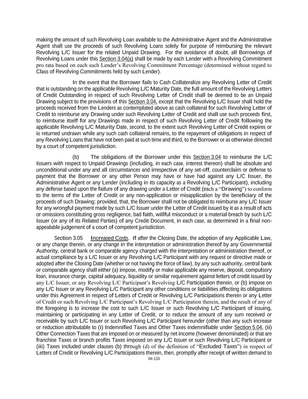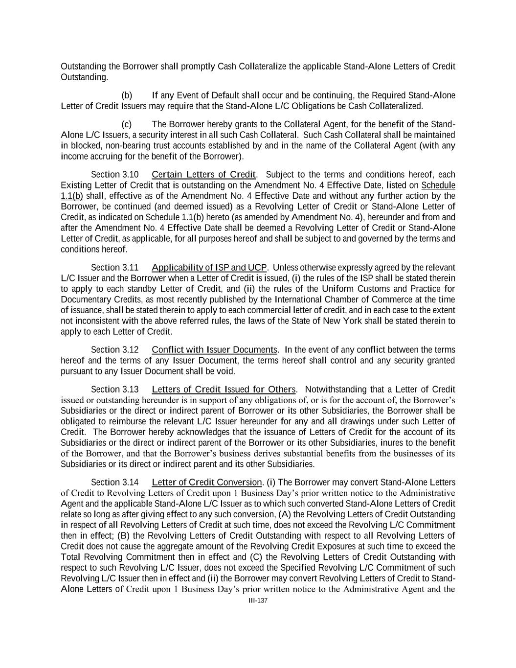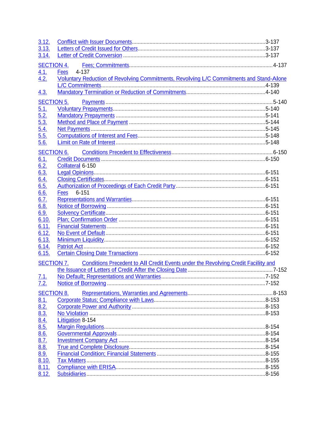 3.12. Conflict with Issuer Documents ........................................................................................... 3-137 3.13. Letters of Credit Issued for Others ....................................................................................... 3-137 3.14. Letter of Credit Conversion ................................................................................................. 3-137 SECTION 4. Fees; Commitments.................................................................................................. 4-137 4.1. Fees 4-137 4.2. Voluntary Reduction of Revolving Commitments, Revolving L/C Commitments and Stand-Alone L/C Commitments ................................................................................................................ 4-139 4.3. Mandatory Termination or Reduction of Commitments ...................................................... 4-140 SECTION 5. Payments .................................................................................................................. 5-140 5.1. Voluntary Prepayments ........................................................................................................ 5-140 5.2. Mandatory Prepayments ...................................................................................................... 5-141 5.3. Method and Place of Payment ............................................................................................. 5-144 5.4. Net Payments ....................................................................................................................... 5-145 5.5. Computations of Interest and Fees ....................................................................................... 5-148 5.6. Limit on Rate of Interest ...................................................................................................... 5-148 SECTION 6. Conditions Precedent to Effectiveness ..................................................................... 6-150 6.1. Credit Documents ................................................................................................................ 6-150 6.2. Collateral 6-150 6.3. Legal Opinions ..................................................................................................................... 6-151 6.4. Closing Certificates .............................................................................................................. 6-151 6.5. Authorization of Proceedings of Each Credit Party ............................................................. 6-151 6.6. Fees 6-151 6.7. Representations and Warranties ........................................................................................... 6-151 6.8. Notice of Borrowing ............................................................................................................ 6-151 6.9. Solvency Certificate ............................................................................................................. 6-151 6.10. Plan; Confirmation Order .................................................................................................... 6-151 6.11. Financial Statements ............................................................................................................ 6-151 6.12. No Event of Default ............................................................................................................. 6-151 6.13. Minimum Liquidity .............................................................................................................. 6-152 6.14. Patriot Act ............................................................................................................................ 6-152 6.15. Certain Closing Date Transactions ...................................................................................... 6-152 SECTION 7. Conditions Precedent to All Credit Events under the Revolving Credit Facility and the Issuance of Letters of Credit After the Closing Date .......................................................... 7-152 7.1. No Default; Representations and Warranties ....................................................................... 7-152 7.2. Notice of Borrowing ............................................................................................................ 7-152 SECTION 8. Representations, Warranties and Agreements .......................................................... 8-153 8.1. Corporate Status; Compliance with Laws ............................................................................ 8-153 8.2. Corporate Power and Authority ........................................................................................... 8-153 8.3. No Violation ........................................................................................................................ 8-153 8.4. Litigation 8-154 8.5. Margin Regulations .............................................................................................................. 8-154 8.6. Governmental Approvals ..................................................................................................... 8-154 8.7. Investment Company Act .................................................................................................... 8-154 8.8. True and Complete Disclosure ............................................................................................. 8-154 8.9. Financial Condition; Financial Statements .......................................................................... 8-155 8.10. Tax Matters .......................................................................................................................... 8-155 8.11. Compliance with ERISA...................................................................................................... 8-155 8.12. Subsidiaries .......................................................................................................................... 8-156