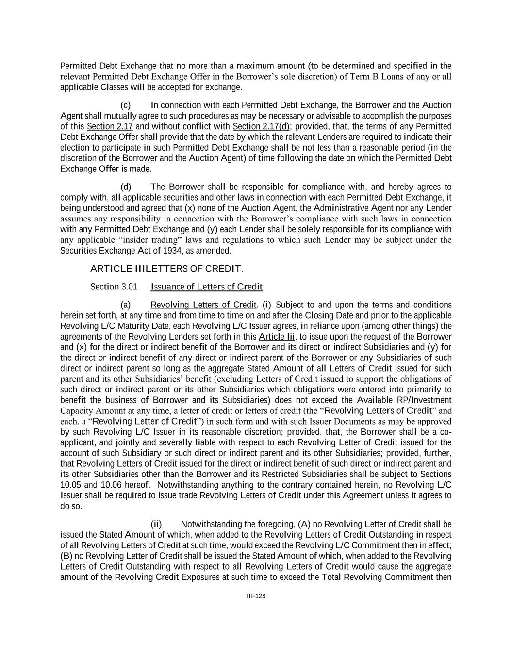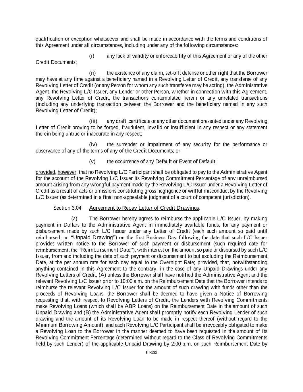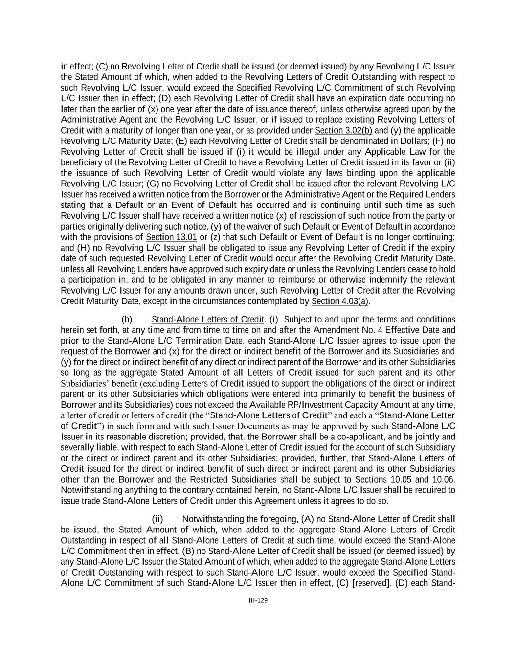 3.12. Conflict with Issuer Documents ........................................................................................... 3-137 3.13. Letters of Credit Issued for Others ....................................................................................... 3-137 3.14. Letter of Credit Conversion ................................................................................................. 3-137 SECTION 4. Fees; Commitments.................................................................................................. 4-137 4.1. Fees 4-137 4.2. Voluntary Reduction of Revolving Commitments, Revolving L/C Commitments and Stand-Alone L/C Commitments ................................................................................................................ 4-139 4.3. Mandatory Termination or Reduction of Commitments ...................................................... 4-140 SECTION 5. Payments .................................................................................................................. 5-140 5.1. Voluntary Prepayments ........................................................................................................ 5-140 5.2. Mandatory Prepayments ...................................................................................................... 5-141 5.3. Method and Place of Payment ............................................................................................. 5-144 5.4. Net Payments ....................................................................................................................... 5-145 5.5. Computations of Interest and Fees ....................................................................................... 5-148 5.6. Limit on Rate of Interest ...................................................................................................... 5-148 SECTION 6. Conditions Precedent to Effectiveness ..................................................................... 6-150 6.1. Credit Documents ................................................................................................................ 6-150 6.2. Collateral 6-150 6.3. Legal Opinions ..................................................................................................................... 6-151 6.4. Closing Certificates .............................................................................................................. 6-151 6.5. Authorization of Proceedings of Each Credit Party ............................................................. 6-151 6.6. Fees 6-151 6.7. Representations and Warranties ........................................................................................... 6-151 6.8. Notice of Borrowing ............................................................................................................ 6-151 6.9. Solvency Certificate ............................................................................................................. 6-151 6.10. Plan; Confirmation Order .................................................................................................... 6-151 6.11. Financial Statements ............................................................................................................ 6-151 6.12. No Event of Default ............................................................................................................. 6-151 6.13. Minimum Liquidity .............................................................................................................. 6-152 6.14. Patriot Act ............................................................................................................................ 6-152 6.15. Certain Closing Date Transactions ...................................................................................... 6-152 SECTION 7. Conditions Precedent to All Credit Events under the Revolving Credit Facility and the Issuance of Letters of Credit After the Closing Date .......................................................... 7-152 7.1. No Default; Representations and Warranties ....................................................................... 7-152 7.2. Notice of Borrowing ............................................................................................................ 7-152 SECTION 8. Representations, Warranties and Agreements .......................................................... 8-153 8.1. Corporate Status; Compliance with Laws ............................................................................ 8-153 8.2. Corporate Power and Authority ........................................................................................... 8-153 8.3. No Violation ........................................................................................................................ 8-153 8.4. Litigation 8-154 8.5. Margin Regulations .............................................................................................................. 8-154 8.6. Governmental Approvals ..................................................................................................... 8-154 8.7. Investment Company Act .................................................................................................... 8-154 8.8. True and Complete Disclosure ............................................................................................. 8-154 8.9. Financial Condition; Financial Statements .......................................................................... 8-155 8.10. Tax Matters .......................................................................................................................... 8-155 8.11. Compliance with ERISA...................................................................................................... 8-155 8.12. Subsidiaries .......................................................................................................................... 8-156