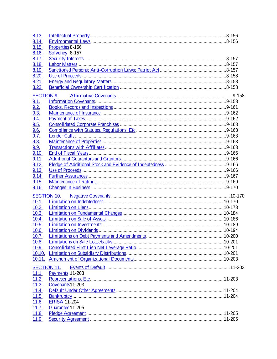 8.13. Intellectual Property ............................................................................................................. 8-156 8.14. Environmental Laws ............................................................................................................ 8-156 8.15. Properties 8-156 8.16. Solvency 8-157 8.17. Security Interests .................................................................................................................. 8-157 8.18. Labor Matters ....................................................................................................................... 8-157 8.19. Sanctioned Persons; Anti-Corruption Laws; Patriot Act ..................................................... 8-157 8.20. Use of Proceeds ................................................................................................................... 8-158 8.21. Energy and Regulatory Matters ........................................................................................... 8-158 8.22. Beneficial Ownership Certification ..................................................................................... 8-158 SECTION 9. Affirmative Covenants ............................................................................................. 9-158 9.1. Information Covenants......................................................................................................... 9-158 9.2. Books, Records and Inspections .......................................................................................... 9-161 9.3. Maintenance of Insurance .................................................................................................... 9-162 9.4. Payment of Taxes ................................................................................................................. 9-162 9.5. Consolidated Corporate Franchises ..................................................................................... 9-163 9.6. Compliance with Statutes, Regulations, Etc ........................................................................ 9-163 9.7. Lender Calls ......................................................................................................................... 9-163 9.8. Maintenance of Properties ................................................................................................... 9-163 9.9. Transactions with Affiliates ................................................................................................. 9-163 9.10. End of Fiscal Years .............................................................................................................. 9-166 9.11. Additional Guarantors and Grantors .................................................................................... 9-166 9.12. Pledge of Additional Stock and Evidence of Indebtedness ................................................. 9-166 9.13. Use of Proceeds ................................................................................................................... 9-166 9.14. Further Assurances............................................................................................................... 9-167 9.15. Maintenance of Ratings ....................................................................................................... 9-169 9.16. Changes in Business ............................................................................................................ 9-170 SECTION 10. Negative Covenants ............................................................................................... 10-170 10.1. Limitation on Indebtedness ................................................................................................ 10-170 10.2. Limitation on Liens ............................................................................................................ 10-178 10.3. Limitation on Fundamental Changes ................................................................................. 10-184 10.4. Limitation on Sale of Assets .............................................................................................. 10-186 10.5. Limitation on Investments ................................................................................................. 10-189 10.6. Limitation on Dividends .................................................................................................... 10-194 10.7. Limitations on Debt Payments and Amendments .............................................................. 10-200 10.8. Limitations on Sale Leasebacks ......................................................................................... 10-201 10.9. Consolidated First Lien Net Leverage Ratio ...................................................................... 10-201 10.10. Limitation on Subsidiary Distributions .............................................................................. 10-201 10.11. Amendment of Organizational Documents ........................................................................ 10-203 SECTION 11. Events of Default ................................................................................................... 11-203 11.1. Payments 11-203 11.2. Representations, Etc ........................................................................................................... 11-203 11.3. Covenants 11-203 11.4. Default Under Other Agreements ...................................................................................... 11-204 11.5. Bankruptcy ......................................................................................................................... 11-204 11.6. ERISA 11-204 11.7. Guarantee 11-205 11.8. Pledge Agreement .............................................................................................................. 11-205 11.9. Security Agreement ........................................................................................................... 11-205