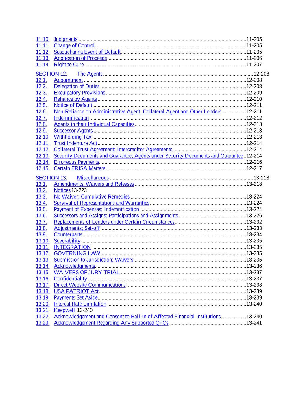 11.10. Judgments .......................................................................................................................... 11-205 11.11. Change of Control .............................................................................................................. 11-205 11.12. Susquehanna Event of Default ........................................................................................... 11-205 11.13. Application of Proceeds ..................................................................................................... 11-206 11.14. Right to Cure ...................................................................................................................... 11-207 SECTION 12. The Agents ............................................................................................................. 12-208 12.1. Appointment ...................................................................................................................... 12-208 12.2. Delegation of Duties .......................................................................................................... 12-208 12.3. Exculpatory Provisions ...................................................................................................... 12-209 12.4. Reliance by Agents ............................................................................................................ 12-210 12.5. Notice of Default................................................................................................................ 12-211 12.6. Non-Reliance on Administrative Agent, Collateral Agent and Other Lenders .................. 12-211 12.7. Indemnification .................................................................................................................. 12-212 12.8. Agents in their Individual Capacities ................................................................................. 12-213 12.9. Successor Agents ............................................................................................................... 12-213 12.10. Withholding Tax ................................................................................................................ 12-213 12.11. Trust Indenture Act ............................................................................................................ 12-214 12.12. Collateral Trust Agreement; Intercreditor Agreements ..................................................... 12-214 12.13. Security Documents and Guarantee; Agents under Security Documents and Guarantee .. 12-214 12.14. Erroneous Payments........................................................................................................... 12-216 12.15. Certain ERISA Matters ...................................................................................................... 12-217 SECTION 13. Miscellaneous ........................................................................................................ 13-218 13.1. Amendments, Waivers and Releases ................................................................................. 13-218 13.2. Notices 13-223 13.3. No Waiver; Cumulative Remedies .................................................................................... 13-224 13.4. Survival of Representations and Warranties ...................................................................... 13-224 13.5. Payment of Expenses; Indemnification ............................................................................. 13-224 13.6. Successors and Assigns; Participations and Assignments ................................................. 13-226 13.7. Replacements of Lenders under Certain Circumstances .................................................... 13-232 13.8. Adjustments; Set-off .......................................................................................................... 13-233 13.9. Counterparts ....................................................................................................................... 13-234 13.10. Severability ........................................................................................................................ 13-235 13.11. INTEGRATION ................................................................................................................ 13-235 13.12. GOVERNING LAW .......................................................................................................... 13-235 13.13. Submission to Jurisdiction; Waivers .................................................................................. 13-235 13.14. Acknowledgments.............................................................................................................. 13-236 13.15. WAIVERS OF JURY TRIAL ........................................................................................... 13-237 13.16. Confidentiality ................................................................................................................... 13-237 13.17. Direct Website Communications ....................................................................................... 13-238 13.18. USA PATRIOT Act ........................................................................................................... 13-239 13.19. Payments Set Aside............................................................................................................ 13-239 13.20. Interest Rate Limitation ..................................................................................................... 13-240 13.21. Keepwell 13-240 13.22. Acknowledgement and Consent to Bail-In of Affected Financial Institutions .................. 13-240 13.23. Acknowledgement Regarding Any Supported QFCs ........................................................ 13-241