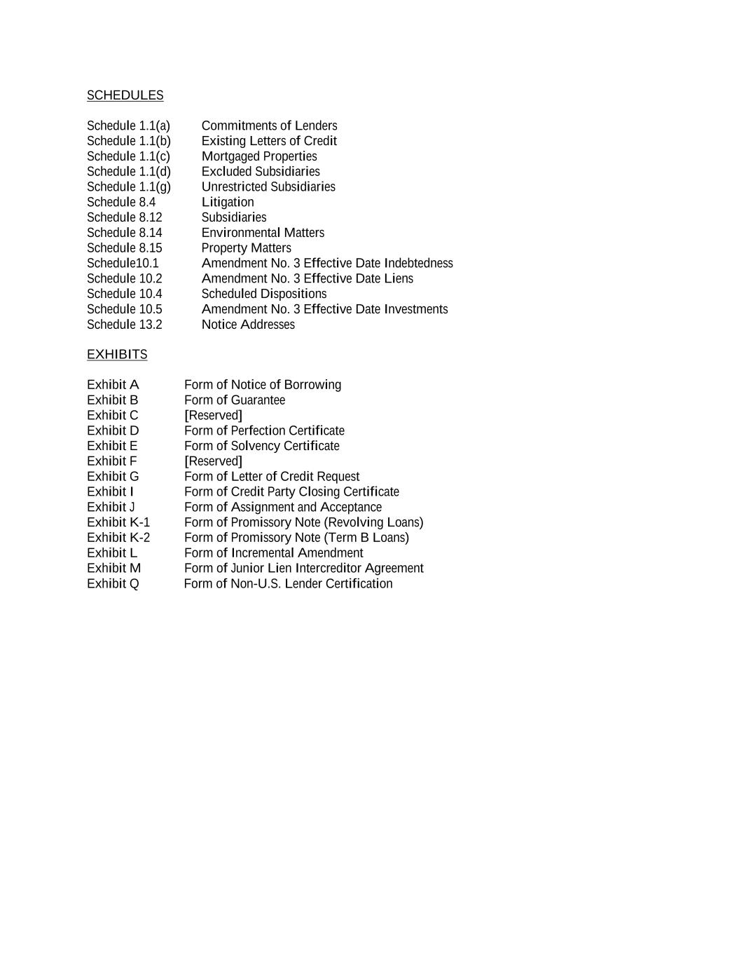 SCHEDULES Schedule 1.1(a) Commitments of Lenders Schedule 1.1(b) Existing Letters of Credit Schedule 1.1(c) Mortgaged Properties Schedule 1.1(d) Excluded Subsidiaries Schedule 1.1(g) Unrestricted Subsidiaries Schedule 8.4 Litigation Schedule 8.12 Subsidiaries Schedule 8.14 Environmental Matters Schedule 8.15 Property Matters Schedule10.1 Amendment No. 3 Effective Date Indebtedness Schedule 10.2 Amendment No. 3 Effective Date Liens Schedule 10.4 Scheduled Dispositions Schedule 10.5 Amendment No. 3 Effective Date Investments Schedule 13.2 Notice Addresses EXHIBITS Exhibit A Form of Notice of Borrowing Exhibit B Form of Guarantee Exhibit C [Reserved] Exhibit D Form of Perfection Certificate Exhibit E Form of Solvency Certificate Exhibit F [Reserved] Exhibit G Form of Letter of Credit Request Exhibit I Form of Credit Party Closing Certificate Exhibit J Form of Assignment and Acceptance Exhibit K-1 Form of Promissory Note (Revolving Loans) Exhibit K-2 Form of Promissory Note (Term B Loans) Exhibit L Form of Incremental Amendment Exhibit M Form of Junior Lien Intercreditor Agreement Exhibit Q Form of Non-U.S. Lender Certification