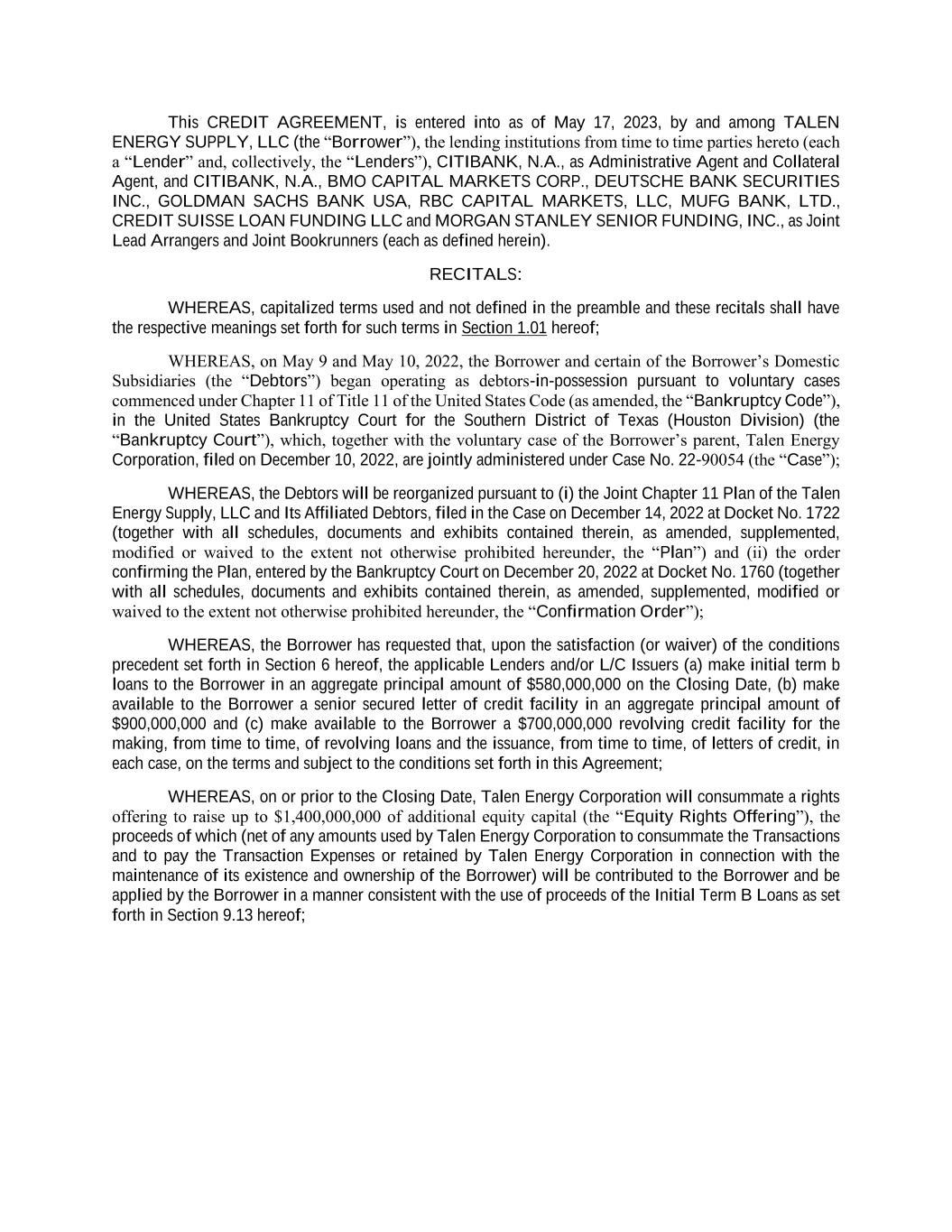 This CREDIT AGREEMENT, is entered into as of May 17, 2023, by and among TALEN ENERGY SUPPLY, LLC (the “Borrower”), the lending institutions from time to time parties hereto (each a “Lender” and, collectively, the “Lenders”), CITIBANK, N.A., as Administrative Agent and Collateral Agent, and CITIBANK, N.A., BMO CAPITAL MARKETS CORP., DEUTSCHE BANK SECURITIES INC., GOLDMAN SACHS BANK USA, RBC CAPITAL MARKETS, LLC, MUFG BANK, LTD., CREDIT SUISSE LOAN FUNDING LLC and MORGAN STANLEY SENIOR FUNDING, INC., as Joint Lead Arrangers and Joint Bookrunners (each as defined herein). RECITALS: WHEREAS, capitalized terms used and not defined in the preamble and these recitals shall have the respective meanings set forth for such terms in Section 1.01 hereof; WHEREAS, on May 9 and May 10, 2022, the Borrower and certain of the Borrower’s Domestic Subsidiaries (the “Debtors”) began operating as debtors-in-possession pursuant to voluntary cases commenced under Chapter 11 of Title 11 of the United States Code (as amended, the “Bankruptcy Code”), in the United States Bankruptcy Court for the Southern District of Texas (Houston Division) (the “Bankruptcy Court”), which, together with the voluntary case of the Borrower’s parent, Talen Energy Corporation, filed on December 10, 2022, are jointly administered under Case No. 22-90054 (the “Case”); WHEREAS, the Debtors will be reorganized pursuant to (i) the Joint Chapter 11 Plan of the Talen Energy Supply, LLC and Its Affiliated Debtors, filed in the Case on December 14, 2022 at Docket No. 1722 (together with all schedules, documents and exhibits contained therein, as amended, supplemented, modified or waived to the extent not otherwise prohibited hereunder, the “Plan”) and (ii) the order confirming the Plan, entered by the Bankruptcy Court on December 20, 2022 at Docket No. 1760 (together with all schedules, documents and exhibits contained therein, as amended, supplemented, modified or waived to the extent not otherwise prohibited hereunder, the “Confirmation Order”); WHEREAS, the Borrower has requested that, upon the satisfaction (or waiver) of the conditions precedent set forth in Section 6 hereof, the applicable Lenders and/or L/C Issuers (a) make initial term b loans to the Borrower in an aggregate principal amount of $580,000,000 on the Closing Date, (b) make available to the Borrower a senior secured letter of credit facility in an aggregate principal amount of $900,000,000 and (c) make available to the Borrower a $700,000,000 revolving credit facility for the making, from time to time, of revolving loans and the issuance, from time to time, of letters of credit, in each case, on the terms and subject to the conditions set forth in this Agreement; WHEREAS, on or prior to the Closing Date, Talen Energy Corporation will consummate a rights offering to raise up to $1,400,000,000 of additional equity capital (the “Equity Rights Offering”), the proceeds of which (net of any amounts used by Talen Energy Corporation to consummate the Transactions and to pay the Transaction Expenses or retained by Talen Energy Corporation in connection with the maintenance of its existence and ownership of the Borrower) will be contributed to the Borrower and be applied by the Borrower in a manner consistent with the use of proceeds of the Initial Term B Loans as set forth in Section 9.13 hereof;