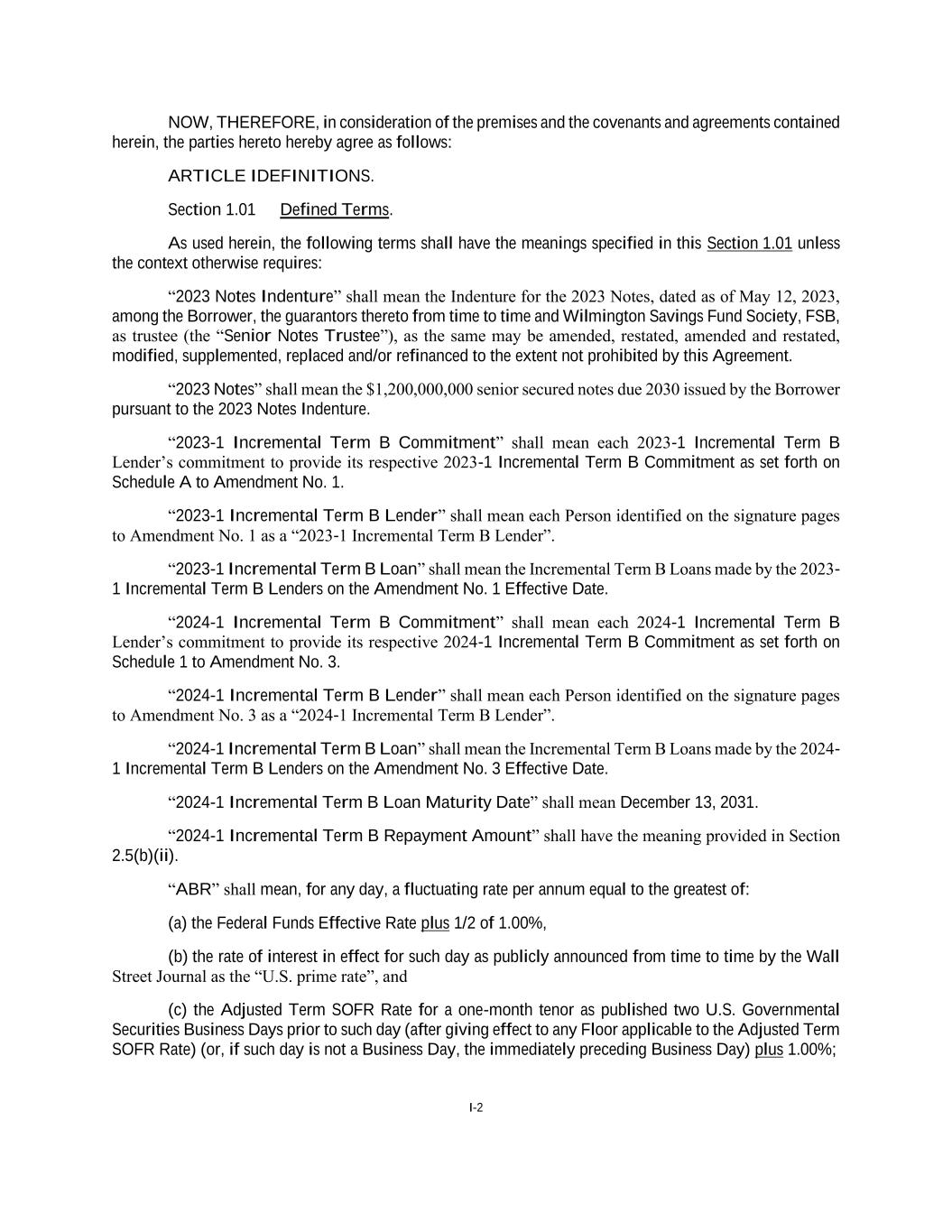 I-2 NOW, THEREFORE, in consideration of the premises and the covenants and agreements contained herein, the parties hereto hereby agree as follows: ARTICLE IDEFINITIONS. Section 1.01 Defined Terms. As used herein, the following terms shall have the meanings specified in this Section 1.01 unless the context otherwise requires: “2023 Notes Indenture” shall mean the Indenture for the 2023 Notes, dated as of May 12, 2023, among the Borrower, the guarantors thereto from time to time and Wilmington Savings Fund Society, FSB, as trustee (the “Senior Notes Trustee”), as the same may be amended, restated, amended and restated, modified, supplemented, replaced and/or refinanced to the extent not prohibited by this Agreement. “2023 Notes” shall mean the $1,200,000,000 senior secured notes due 2030 issued by the Borrower pursuant to the 2023 Notes Indenture. “2023-1 Incremental Term B Commitment” shall mean each 2023-1 Incremental Term B Lender’s commitment to provide its respective 2023-1 Incremental Term B Commitment as set forth on Schedule A to Amendment No. 1. “2023-1 Incremental Term B Lender” shall mean each Person identified on the signature pages to Amendment No. 1 as a “2023-1 Incremental Term B Lender”. “2023-1 Incremental Term B Loan” shall mean the Incremental Term B Loans made by the 2023- 1 Incremental Term B Lenders on the Amendment No. 1 Effective Date. “2024-1 Incremental Term B Commitment” shall mean each 2024-1 Incremental Term B Lender’s commitment to provide its respective 2024-1 Incremental Term B Commitment as set forth on Schedule 1 to Amendment No. 3. “2024-1 Incremental Term B Lender” shall mean each Person identified on the signature pages to Amendment No. 3 as a “2024-1 Incremental Term B Lender”. “2024-1 Incremental Term B Loan” shall mean the Incremental Term B Loans made by the 2024- 1 Incremental Term B Lenders on the Amendment No. 3 Effective Date. “2024-1 Incremental Term B Loan Maturity Date” shall mean December 13, 2031. “2024-1 Incremental Term B Repayment Amount” shall have the meaning provided in Section 2.5(b)(ii). “ABR” shall mean, for any day, a fluctuating rate per annum equal to the greatest of: (a) the Federal Funds Effective Rate plus 1/2 of 1.00%, (b) the rate of interest in effect for such day as publicly announced from time to time by the Wall Street Journal as the “U.S. prime rate”, and (c) the Adjusted Term SOFR Rate for a one-month tenor as published two U.S. Governmental Securities Business Days prior to such day (after giving effect to any Floor applicable to the Adjusted Term SOFR Rate) (or, if such day is not a Business Day, the immediately preceding Business Day) plus 1.00%;