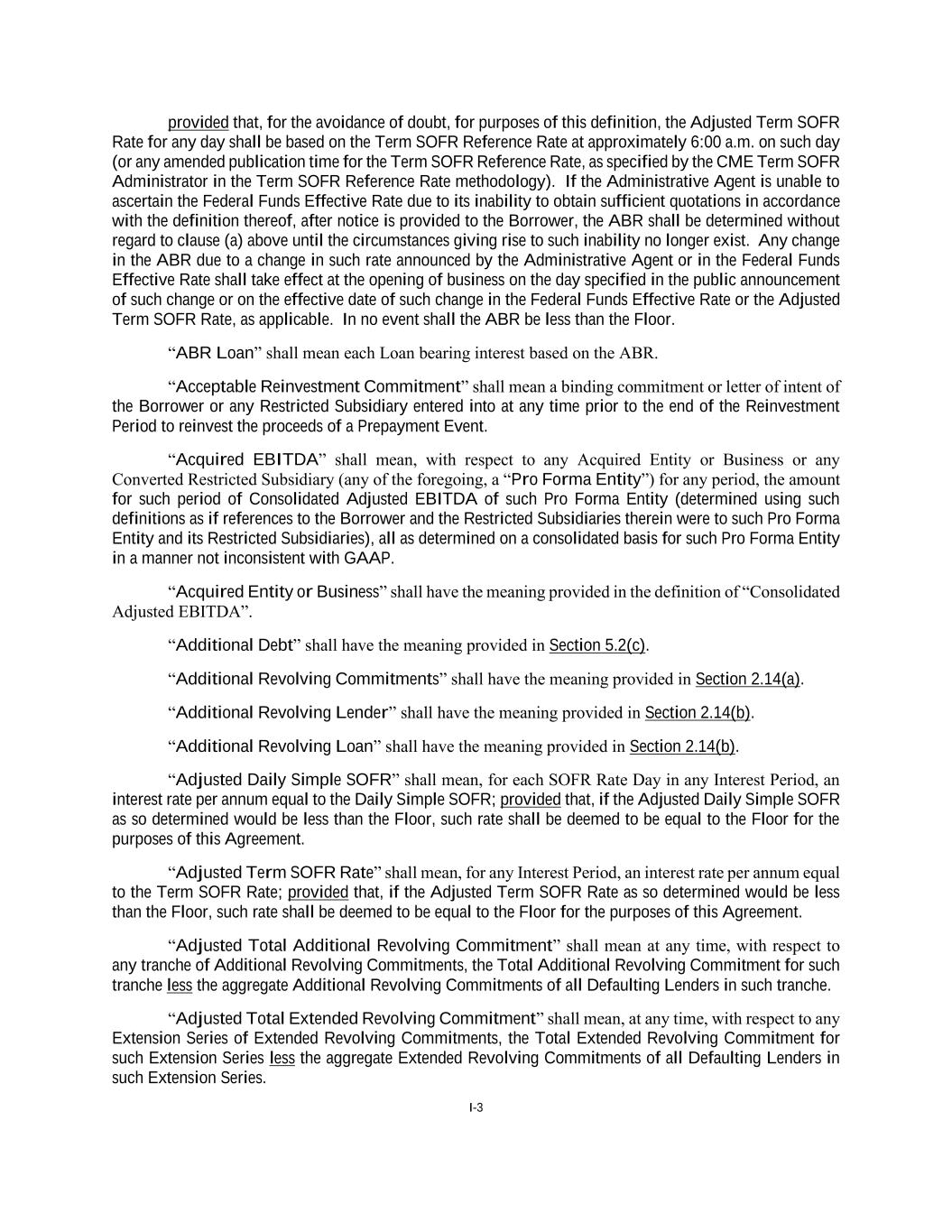 I-3 provided that, for the avoidance of doubt, for purposes of this definition, the Adjusted Term SOFR Rate for any day shall be based on the Term SOFR Reference Rate at approximately 6:00 a.m. on such day (or any amended publication time for the Term SOFR Reference Rate, as specified by the CME Term SOFR Administrator in the Term SOFR Reference Rate methodology). If the Administrative Agent is unable to ascertain the Federal Funds Effective Rate due to its inability to obtain sufficient quotations in accordance with the definition thereof, after notice is provided to the Borrower, the ABR shall be determined without regard to clause (a) above until the circumstances giving rise to such inability no longer exist. Any change in the ABR due to a change in such rate announced by the Administrative Agent or in the Federal Funds Effective Rate shall take effect at the opening of business on the day specified in the public announcement of such change or on the effective date of such change in the Federal Funds Effective Rate or the Adjusted Term SOFR Rate, as applicable. In no event shall the ABR be less than the Floor. “ABR Loan” shall mean each Loan bearing interest based on the ABR. “Acceptable Reinvestment Commitment” shall mean a binding commitment or letter of intent of the Borrower or any Restricted Subsidiary entered into at any time prior to the end of the Reinvestment Period to reinvest the proceeds of a Prepayment Event. “Acquired EBITDA” shall mean, with respect to any Acquired Entity or Business or any Converted Restricted Subsidiary (any of the foregoing, a “Pro Forma Entity”) for any period, the amount for such period of Consolidated Adjusted EBITDA of such Pro Forma Entity (determined using such definitions as if references to the Borrower and the Restricted Subsidiaries therein were to such Pro Forma Entity and its Restricted Subsidiaries), all as determined on a consolidated basis for such Pro Forma Entity in a manner not inconsistent with GAAP. “Acquired Entity or Business” shall have the meaning provided in the definition of “Consolidated Adjusted EBITDA”. “Additional Debt” shall have the meaning provided in Section 5.2(c). “Additional Revolving Commitments” shall have the meaning provided in Section 2.14(a). “Additional Revolving Lender” shall have the meaning provided in Section 2.14(b). “Additional Revolving Loan” shall have the meaning provided in Section 2.14(b). “Adjusted Daily Simple SOFR” shall mean, for each SOFR Rate Day in any Interest Period, an interest rate per annum equal to the Daily Simple SOFR; provided that, if the Adjusted Daily Simple SOFR as so determined would be less than the Floor, such rate shall be deemed to be equal to the Floor for the purposes of this Agreement. “Adjusted Term SOFR Rate” shall mean, for any Interest Period, an interest rate per annum equal to the Term SOFR Rate; provided that, if the Adjusted Term SOFR Rate as so determined would be less than the Floor, such rate shall be deemed to be equal to the Floor for the purposes of this Agreement. “Adjusted Total Additional Revolving Commitment” shall mean at any time, with respect to any tranche of Additional Revolving Commitments, the Total Additional Revolving Commitment for such tranche less the aggregate Additional Revolving Commitments of all Defaulting Lenders in such tranche. “Adjusted Total Extended Revolving Commitment” shall mean, at any time, with respect to any Extension Series of Extended Revolving Commitments, the Total Extended Revolving Commitment for such Extension Series less the aggregate Extended Revolving Commitments of all Defaulting Lenders in such Extension Series.