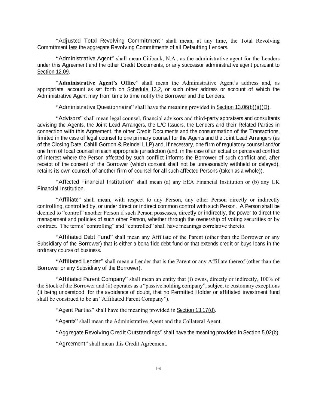 I-4 “Adjusted Total Revolving Commitment” shall mean, at any time, the Total Revolving Commitment less the aggregate Revolving Commitments of all Defaulting Lenders. “Administrative Agent” shall mean Citibank, N.A., as the administrative agent for the Lenders under this Agreement and the other Credit Documents, or any successor administrative agent pursuant to Section 12.09. “Administrative Agent’s Office” shall mean the Administrative Agent’s address and, as appropriate, account as set forth on Schedule 13.2, or such other address or account of which the Administrative Agent may from time to time notify the Borrower and the Lenders. “Administrative Questionnaire” shall have the meaning provided in Section 13.06(b)(ii)(D). “Advisors” shall mean legal counsel, financial advisors and third-party appraisers and consultants advising the Agents, the Joint Lead Arrangers, the L/C Issuers, the Lenders and their Related Parties in connection with this Agreement, the other Credit Documents and the consummation of the Transactions, limited in the case of legal counsel to one primary counsel for the Agents and the Joint Lead Arrangers (as of the Closing Date, Cahill Gordon & Reindel LLP) and, if necessary, one firm of regulatory counsel and/or one firm of local counsel in each appropriate jurisdiction (and, in the case of an actual or perceived conflict of interest where the Person affected by such conflict informs the Borrower of such conflict and, after receipt of the consent of the Borrower (which consent shall not be unreasonably withheld or delayed), retains its own counsel, of another firm of counsel for all such affected Persons (taken as a whole)). “Affected Financial Institution” shall mean (a) any EEA Financial Institution or (b) any UK Financial Institution. “Affiliate” shall mean, with respect to any Person, any other Person directly or indirectly controlling, controlled by, or under direct or indirect common control with such Person. A Person shall be deemed to “control” another Person if such Person possesses, directly or indirectly, the power to direct the management and policies of such other Person, whether through the ownership of voting securities or by contract. The terms “controlling” and “controlled” shall have meanings correlative thereto. “Affiliated Debt Fund” shall mean any Affiliate of the Parent (other than the Borrower or any Subsidiary of the Borrower) that is either a bona fide debt fund or that extends credit or buys loans in the ordinary course of business. “Affiliated Lender” shall mean a Lender that is the Parent or any Affiliate thereof (other than the Borrower or any Subsidiary of the Borrower). “Affiliated Parent Company” shall mean an entity that (i) owns, directly or indirectly, 100% of the Stock of the Borrower and (ii) operates as a “passive holding company”, subject to customary exceptions (it being understood, for the avoidance of doubt, that no Permitted Holder or affiliated investment fund shall be construed to be an “Affiliated Parent Company”). “Agent Parties” shall have the meaning provided in Section 13.17(d). “Agents” shall mean the Administrative Agent and the Collateral Agent. “Aggregate Revolving Credit Outstandings” shall have the meaning provided in Section 5.02(b). “Agreement” shall mean this Credit Agreement.