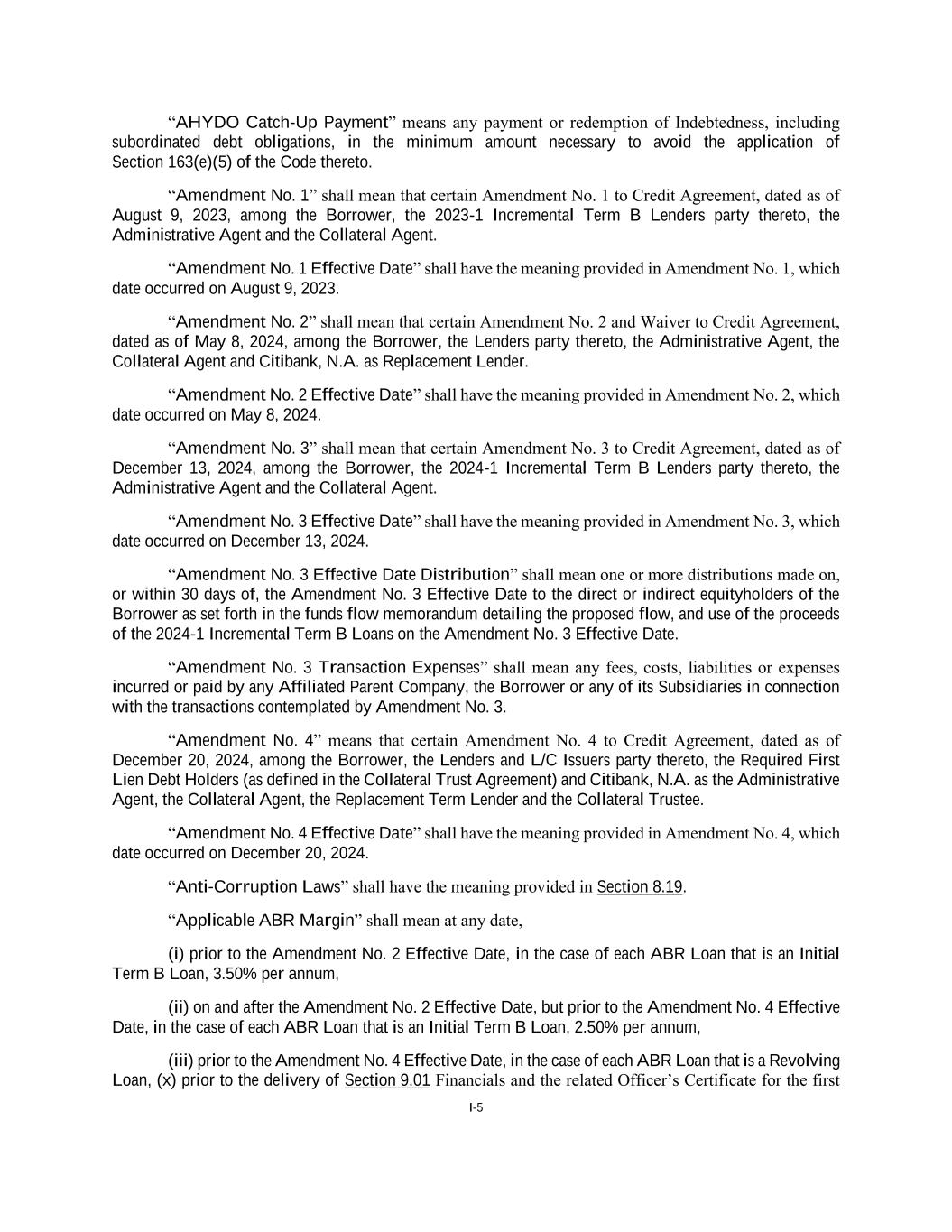 I-5 “AHYDO Catch-Up Payment” means any payment or redemption of Indebtedness, including subordinated debt obligations, in the minimum amount necessary to avoid the application of Section 163(e)(5) of the Code thereto. “Amendment No. 1” shall mean that certain Amendment No. 1 to Credit Agreement, dated as of August 9, 2023, among the Borrower, the 2023-1 Incremental Term B Lenders party thereto, the Administrative Agent and the Collateral Agent. “Amendment No. 1 Effective Date” shall have the meaning provided in Amendment No. 1, which date occurred on August 9, 2023. “Amendment No. 2” shall mean that certain Amendment No. 2 and Waiver to Credit Agreement, dated as of May 8, 2024, among the Borrower, the Lenders party thereto, the Administrative Agent, the Collateral Agent and Citibank, N.A. as Replacement Lender. “Amendment No. 2 Effective Date” shall have the meaning provided in Amendment No. 2, which date occurred on May 8, 2024. “Amendment No. 3” shall mean that certain Amendment No. 3 to Credit Agreement, dated as of December 13, 2024, among the Borrower, the 2024-1 Incremental Term B Lenders party thereto, the Administrative Agent and the Collateral Agent. “Amendment No. 3 Effective Date” shall have the meaning provided in Amendment No. 3, which date occurred on December 13, 2024. “Amendment No. 3 Effective Date Distribution” shall mean one or more distributions made on, or within 30 days of, the Amendment No. 3 Effective Date to the direct or indirect equityholders of the Borrower as set forth in the funds flow memorandum detailing the proposed flow, and use of the proceeds of the 2024-1 Incremental Term B Loans on the Amendment No. 3 Effective Date. “Amendment No. 3 Transaction Expenses” shall mean any fees, costs, liabilities or expenses incurred or paid by any Affiliated Parent Company, the Borrower or any of its Subsidiaries in connection with the transactions contemplated by Amendment No. 3. “Amendment No. 4” means that certain Amendment No. 4 to Credit Agreement, dated as of December 20, 2024, among the Borrower, the Lenders and L/C Issuers party thereto, the Required First Lien Debt Holders (as defined in the Collateral Trust Agreement) and Citibank, N.A. as the Administrative Agent, the Collateral Agent, the Replacement Term Lender and the Collateral Trustee. “Amendment No. 4 Effective Date” shall have the meaning provided in Amendment No. 4, which date occurred on December 20, 2024. “Anti-Corruption Laws” shall have the meaning provided in Section 8.19. “Applicable ABR Margin” shall mean at any date, (i) prior to the Amendment No. 2 Effective Date, in the case of each ABR Loan that is an Initial Term B Loan, 3.50% per annum, (ii) on and after the Amendment No. 2 Effective Date, but prior to the Amendment No. 4 Effective Date, in the case of each ABR Loan that is an Initial Term B Loan, 2.50% per annum, (iii) prior to the Amendment No. 4 Effective Date, in the case of each ABR Loan that is a Revolving Loan, (x) prior to the delivery of Section 9.01 Financials and the related Officer’s Certificate for the first