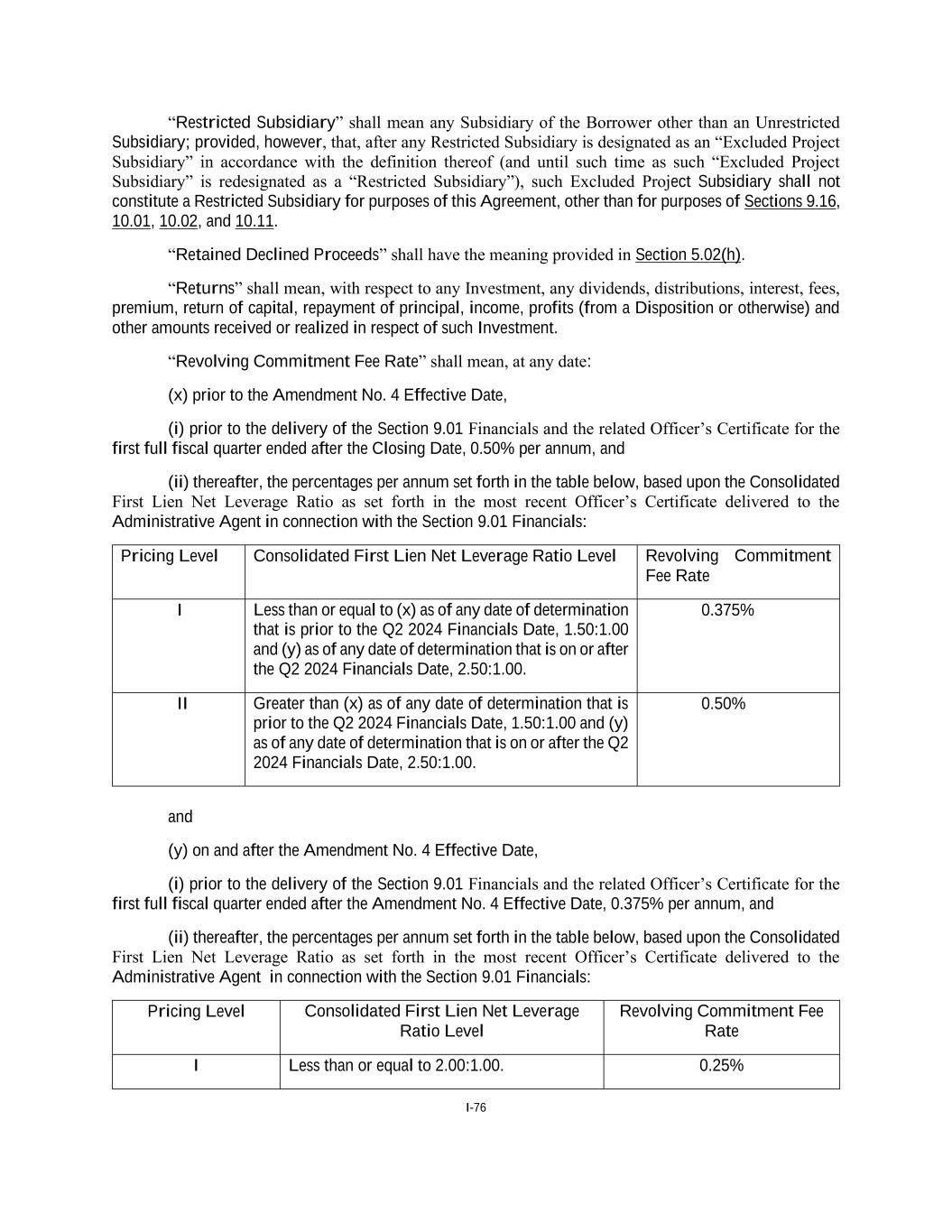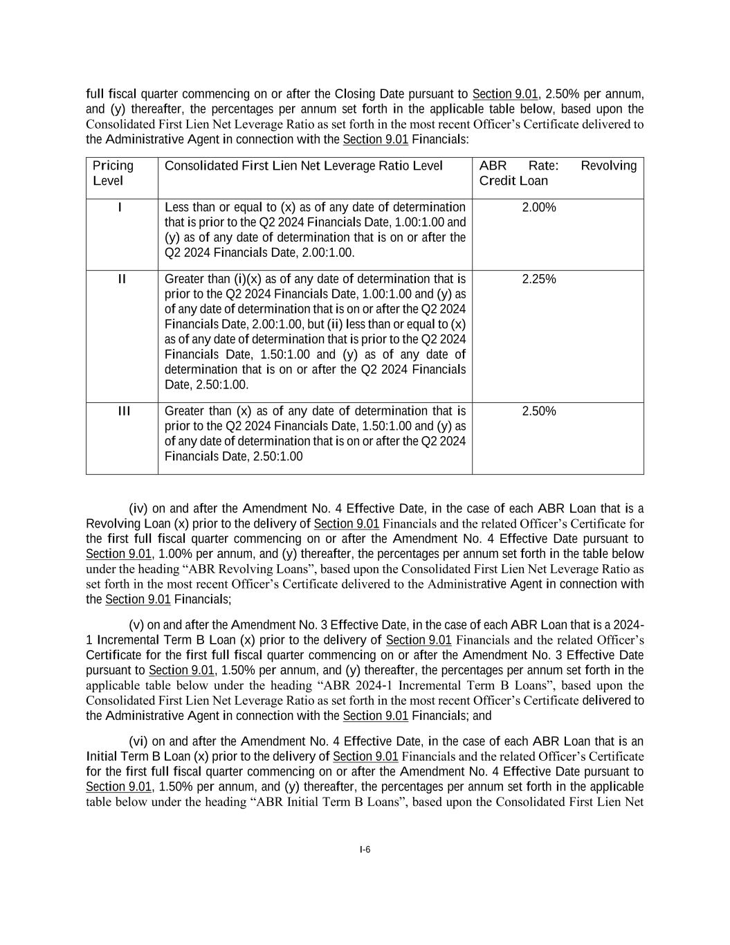 I-6 full fiscal quarter commencing on or after the Closing Date pursuant to Section 9.01, 2.50% per annum, and (y) thereafter, the percentages per annum set forth in the applicable table below, based upon the Consolidated First Lien Net Leverage Ratio as set forth in the most recent Officer’s Certificate delivered to the Administrative Agent in connection with the Section 9.01 Financials: Pricing Level Consolidated First Lien Net Leverage Ratio Level ABR Rate: Revolving Credit Loan I Less than or equal to (x) as of any date of determination that is prior to the Q2 2024 Financials Date, 1.00:1.00 and (y) as of any date of determination that is on or after the Q2 2024 Financials Date, 2.00:1.00. 2.00% II Greater than (i)(x) as of any date of determination that is prior to the Q2 2024 Financials Date, 1.00:1.00 and (y) as of any date of determination that is on or after the Q2 2024 Financials Date, 2.00:1.00, but (ii) less than or equal to (x) as of any date of determination that is prior to the Q2 2024 Financials Date, 1.50:1.00 and (y) as of any date of determination that is on or after the Q2 2024 Financials Date, 2.50:1.00. 2.25% III Greater than (x) as of any date of determination that is prior to the Q2 2024 Financials Date, 1.50:1.00 and (y) as of any date of determination that is on or after the Q2 2024 Financials Date, 2.50:1.00 2.50% (iv) on and after the Amendment No. 4 Effective Date, in the case of each ABR Loan that is a Revolving Loan (x) prior to the delivery of Section 9.01 Financials and the related Officer’s Certificate for the first full fiscal quarter commencing on or after the Amendment No. 4 Effective Date pursuant to Section 9.01, 1.00% per annum, and (y) thereafter, the percentages per annum set forth in the table below under the heading “ABR Revolving Loans”, based upon the Consolidated First Lien Net Leverage Ratio as set forth in the most recent Officer’s Certificate delivered to the Administrative Agent in connection with the Section 9.01 Financials; (v) on and after the Amendment No. 3 Effective Date, in the case of each ABR Loan that is a 2024- 1 Incremental Term B Loan (x) prior to the delivery of Section 9.01 Financials and the related Officer’s Certificate for the first full fiscal quarter commencing on or after the Amendment No. 3 Effective Date pursuant to Section 9.01, 1.50% per annum, and (y) thereafter, the percentages per annum set forth in the applicable table below under the heading “ABR 2024-1 Incremental Term B Loans”, based upon the Consolidated First Lien Net Leverage Ratio as set forth in the most recent Officer’s Certificate delivered to the Administrative Agent in connection with the Section 9.01 Financials; and (vi) on and after the Amendment No. 4 Effective Date, in the case of each ABR Loan that is an Initial Term B Loan (x) prior to the delivery of Section 9.01 Financials and the related Officer’s Certificate for the first full fiscal quarter commencing on or after the Amendment No. 4 Effective Date pursuant to Section 9.01, 1.50% per annum, and (y) thereafter, the percentages per annum set forth in the applicable table below under the heading “ABR Initial Term B Loans”, based upon the Consolidated First Lien Net