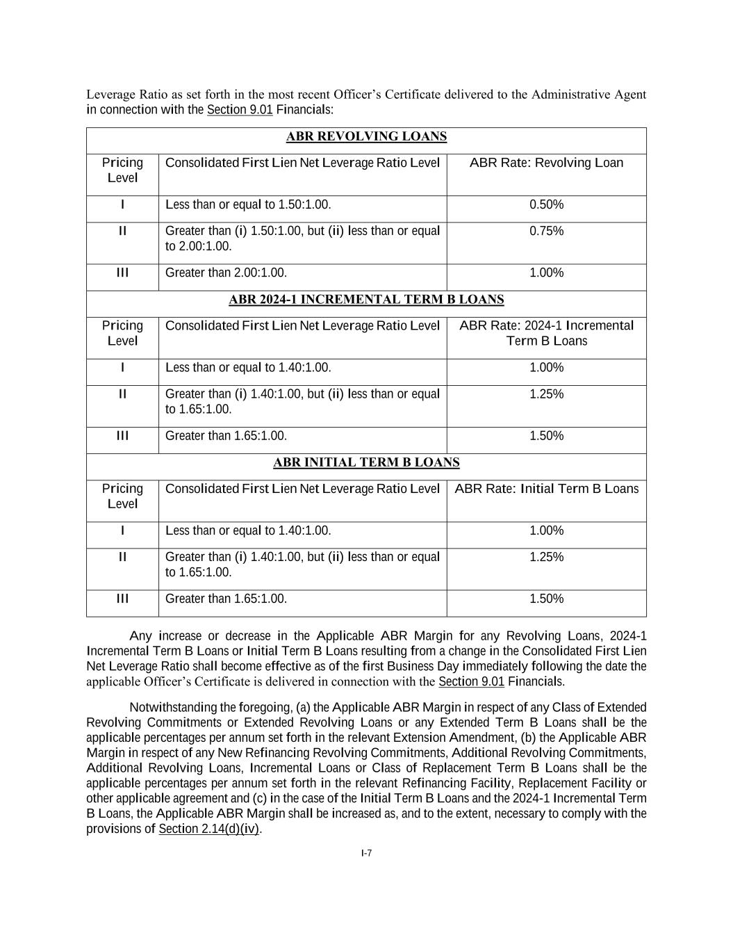 I-7 Leverage Ratio as set forth in the most recent Officer’s Certificate delivered to the Administrative Agent in connection with the Section 9.01 Financials: ABR REVOLVING LOANS Pricing Level Consolidated First Lien Net Leverage Ratio Level ABR Rate: Revolving Loan I Less than or equal to 1.50:1.00. 0.50% II Greater than (i) 1.50:1.00, but (ii) less than or equal to 2.00:1.00. 0.75% III Greater than 2.00:1.00. 1.00% ABR 2024-1 INCREMENTAL TERM B LOANS Pricing Level Consolidated First Lien Net Leverage Ratio Level ABR Rate: 2024-1 Incremental Term B Loans I Less than or equal to 1.40:1.00. 1.00% II Greater than (i) 1.40:1.00, but (ii) less than or equal to 1.65:1.00. 1.25% III Greater than 1.65:1.00. 1.50% ABR INITIAL TERM B LOANS Pricing Level Consolidated First Lien Net Leverage Ratio Level ABR Rate: Initial Term B Loans I Less than or equal to 1.40:1.00. 1.00% II Greater than (i) 1.40:1.00, but (ii) less than or equal to 1.65:1.00. 1.25% III Greater than 1.65:1.00. 1.50% Any increase or decrease in the Applicable ABR Margin for any Revolving Loans, 2024-1 Incremental Term B Loans or Initial Term B Loans resulting from a change in the Consolidated First Lien Net Leverage Ratio shall become effective as of the first Business Day immediately following the date the applicable Officer’s Certificate is delivered in connection with the Section 9.01 Financials. Notwithstanding the foregoing, (a) the Applicable ABR Margin in respect of any Class of Extended Revolving Commitments or Extended Revolving Loans or any Extended Term B Loans shall be the applicable percentages per annum set forth in the relevant Extension Amendment, (b) the Applicable ABR Margin in respect of any New Refinancing Revolving Commitments, Additional Revolving Commitments, Additional Revolving Loans, Incremental Loans or Class of Replacement Term B Loans shall be the applicable percentages per annum set forth in the relevant Refinancing Facility, Replacement Facility or other applicable agreement and (c) in the case of the Initial Term B Loans and the 2024-1 Incremental Term B Loans, the Applicable ABR Margin shall be increased as, and to the extent, necessary to comply with the provisions of Section 2.14(d)(iv).
