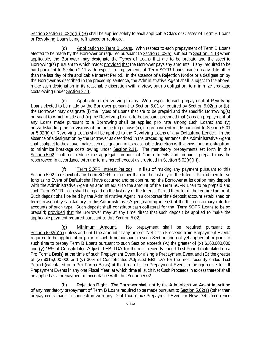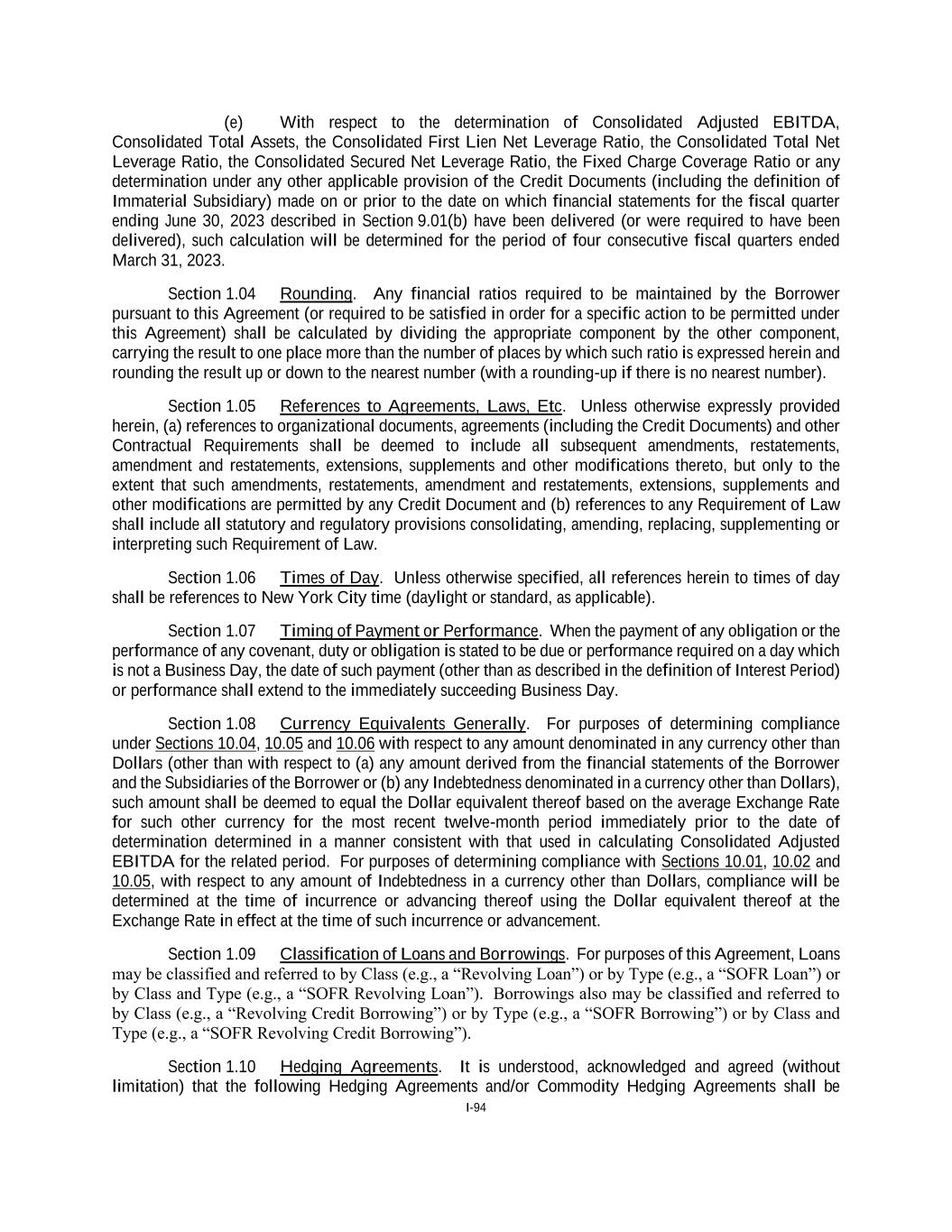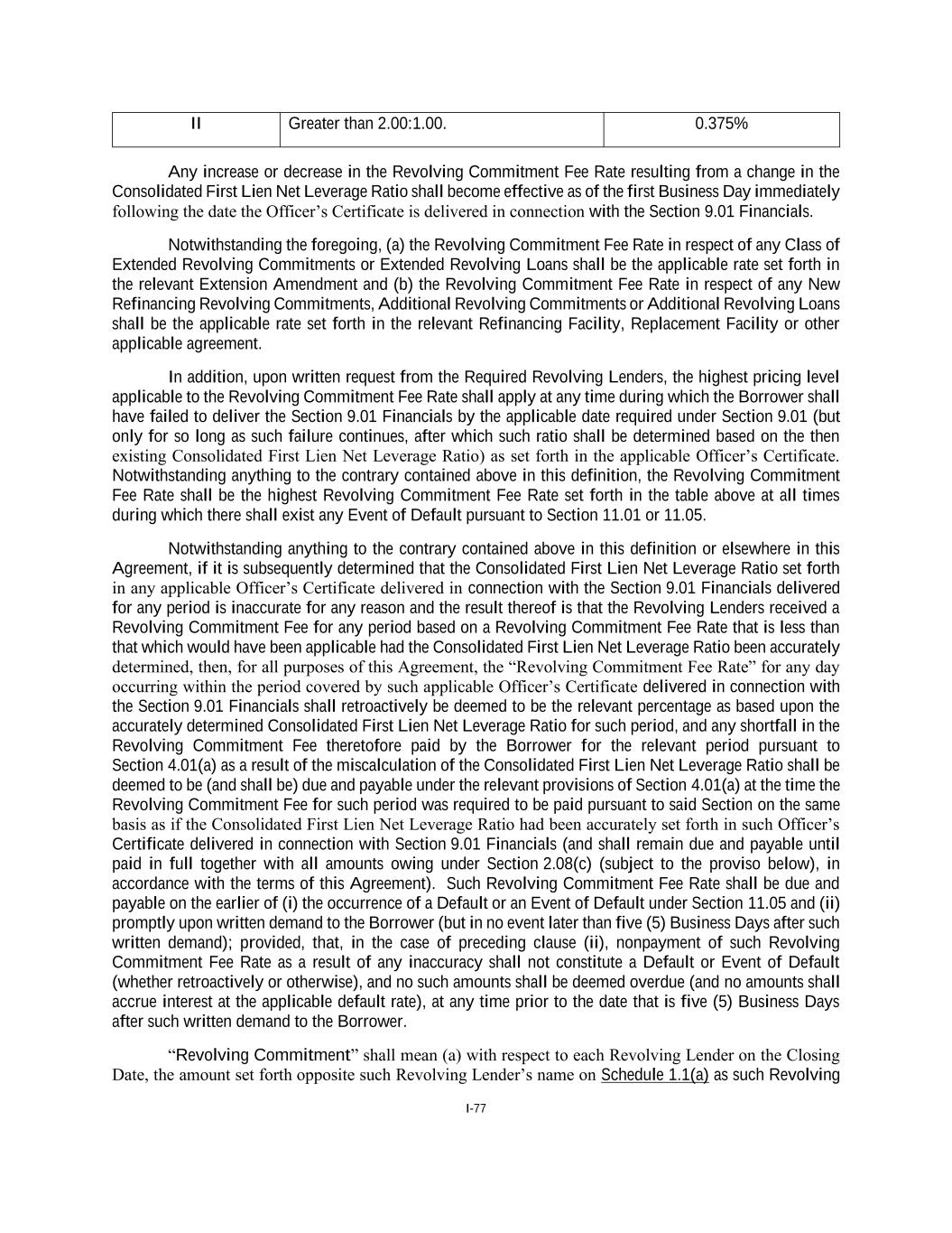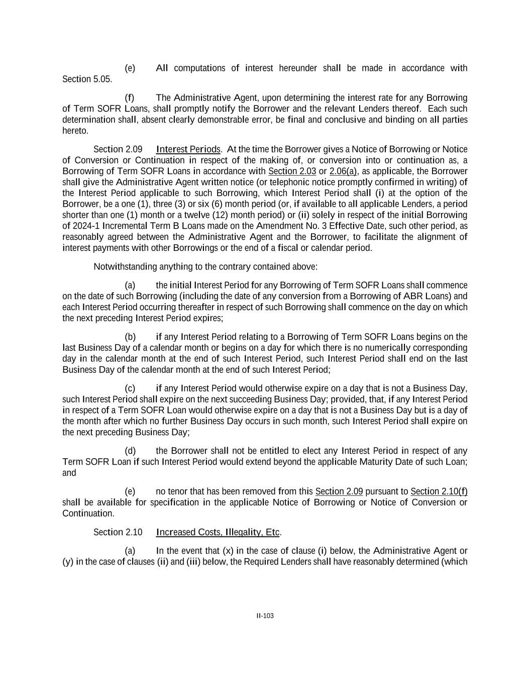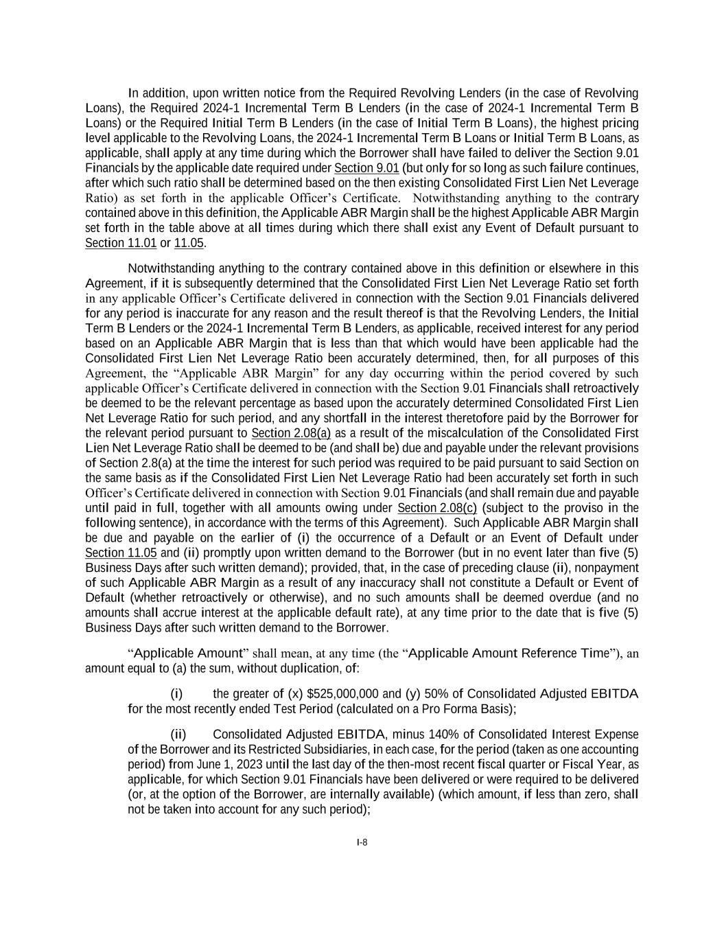 I-8 In addition, upon written notice from the Required Revolving Lenders (in the case of Revolving Loans), the Required 2024-1 Incremental Term B Lenders (in the case of 2024-1 Incremental Term B Loans) or the Required Initial Term B Lenders (in the case of Initial Term B Loans), the highest pricing level applicable to the Revolving Loans, the 2024-1 Incremental Term B Loans or Initial Term B Loans, as applicable, shall apply at any time during which the Borrower shall have failed to deliver the Section 9.01 Financials by the applicable date required under Section 9.01 (but only for so long as such failure continues, after which such ratio shall be determined based on the then existing Consolidated First Lien Net Leverage Ratio) as set forth in the applicable Officer’s Certificate. Notwithstanding anything to the contrary contained above in this definition, the Applicable ABR Margin shall be the highest Applicable ABR Margin set forth in the table above at all times during which there shall exist any Event of Default pursuant to Section 11.01 or 11.05. Notwithstanding anything to the contrary contained above in this definition or elsewhere in this Agreement, if it is subsequently determined that the Consolidated First Lien Net Leverage Ratio set forth in any applicable Officer’s Certificate delivered in connection with the Section 9.01 Financials delivered for any period is inaccurate for any reason and the result thereof is that the Revolving Lenders, the Initial Term B Lenders or the 2024-1 Incremental Term B Lenders, as applicable, received interest for any period based on an Applicable ABR Margin that is less than that which would have been applicable had the Consolidated First Lien Net Leverage Ratio been accurately determined, then, for all purposes of this Agreement, the “Applicable ABR Margin” for any day occurring within the period covered by such applicable Officer’s Certificate delivered in connection with the Section 9.01 Financials shall retroactively be deemed to be the relevant percentage as based upon the accurately determined Consolidated First Lien Net Leverage Ratio for such period, and any shortfall in the interest theretofore paid by the Borrower for the relevant period pursuant to Section 2.08(a) as a result of the miscalculation of the Consolidated First Lien Net Leverage Ratio shall be deemed to be (and shall be) due and payable under the relevant provisions of Section 2.8(a) at the time the interest for such period was required to be paid pursuant to said Section on the same basis as if the Consolidated First Lien Net Leverage Ratio had been accurately set forth in such Officer’s Certificate delivered in connection with Section 9.01 Financials (and shall remain due and payable until paid in full, together with all amounts owing under Section 2.08(c) (subject to the proviso in the following sentence), in accordance with the terms of this Agreement). Such Applicable ABR Margin shall be due and payable on the earlier of (i) the occurrence of a Default or an Event of Default under Section 11.05 and (ii) promptly upon written demand to the Borrower (but in no event later than five (5) Business Days after such written demand); provided, that, in the case of preceding clause (ii), nonpayment of such Applicable ABR Margin as a result of any inaccuracy shall not constitute a Default or Event of Default (whether retroactively or otherwise), and no such amounts shall be deemed overdue (and no amounts shall accrue interest at the applicable default rate), at any time prior to the date that is five (5) Business Days after such written demand to the Borrower. “Applicable Amount” shall mean, at any time (the “Applicable Amount Reference Time”), an amount equal to (a) the sum, without duplication, of: (i) the greater of (x) $525,000,000 and (y) 50% of Consolidated Adjusted EBITDA for the most recently ended Test Period (calculated on a Pro Forma Basis); (ii) Consolidated Adjusted EBITDA, minus 140% of Consolidated Interest Expense of the Borrower and its Restricted Subsidiaries, in each case, for the period (taken as one accounting period) from June 1, 2023 until the last day of the then-most recent fiscal quarter or Fiscal Year, as applicable, for which Section 9.01 Financials have been delivered or were required to be delivered (or, at the option of the Borrower, are internally available) (which amount, if less than zero, shall not be taken into account for any such period);