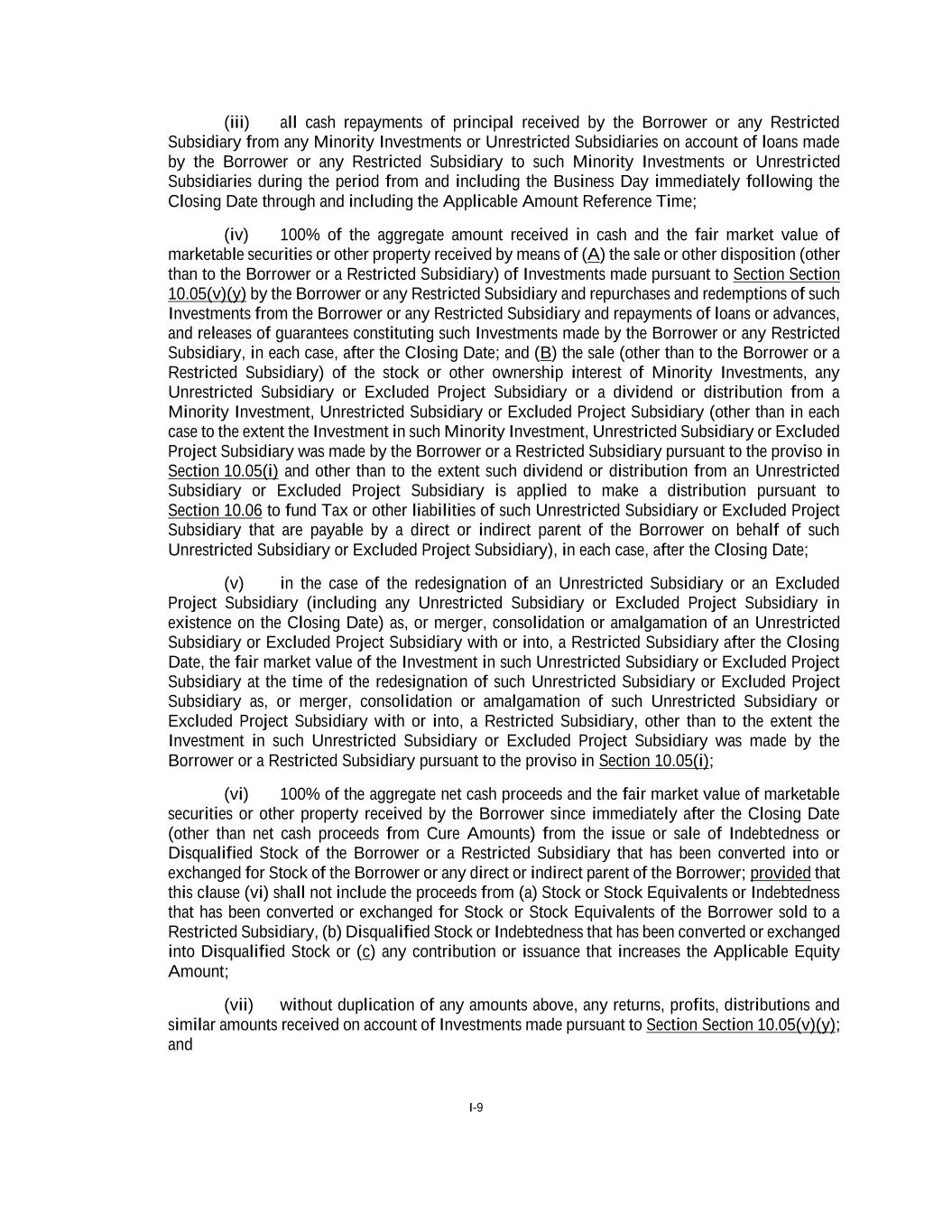 I-9 (iii) all cash repayments of principal received by the Borrower or any Restricted Subsidiary from any Minority Investments or Unrestricted Subsidiaries on account of loans made by the Borrower or any Restricted Subsidiary to such Minority Investments or Unrestricted Subsidiaries during the period from and including the Business Day immediately following the Closing Date through and including the Applicable Amount Reference Time; (iv) 100% of the aggregate amount received in cash and the fair market value of marketable securities or other property received by means of (A) the sale or other disposition (other than to the Borrower or a Restricted Subsidiary) of Investments made pursuant to Section Section 10.05(v)(y) by the Borrower or any Restricted Subsidiary and repurchases and redemptions of such Investments from the Borrower or any Restricted Subsidiary and repayments of loans or advances, and releases of guarantees constituting such Investments made by the Borrower or any Restricted Subsidiary, in each case, after the Closing Date; and (B) the sale (other than to the Borrower or a Restricted Subsidiary) of the stock or other ownership interest of Minority Investments, any Unrestricted Subsidiary or Excluded Project Subsidiary or a dividend or distribution from a Minority Investment, Unrestricted Subsidiary or Excluded Project Subsidiary (other than in each case to the extent the Investment in such Minority Investment, Unrestricted Subsidiary or Excluded Project Subsidiary was made by the Borrower or a Restricted Subsidiary pursuant to the proviso in Section 10.05(i) and other than to the extent such dividend or distribution from an Unrestricted Subsidiary or Excluded Project Subsidiary is applied to make a distribution pursuant to Section 10.06 to fund Tax or other liabilities of such Unrestricted Subsidiary or Excluded Project Subsidiary that are payable by a direct or indirect parent of the Borrower on behalf of such Unrestricted Subsidiary or Excluded Project Subsidiary), in each case, after the Closing Date; (v) in the case of the redesignation of an Unrestricted Subsidiary or an Excluded Project Subsidiary (including any Unrestricted Subsidiary or Excluded Project Subsidiary in existence on the Closing Date) as, or merger, consolidation or amalgamation of an Unrestricted Subsidiary or Excluded Project Subsidiary with or into, a Restricted Subsidiary after the Closing Date, the fair market value of the Investment in such Unrestricted Subsidiary or Excluded Project Subsidiary at the time of the redesignation of such Unrestricted Subsidiary or Excluded Project Subsidiary as, or merger, consolidation or amalgamation of such Unrestricted Subsidiary or Excluded Project Subsidiary with or into, a Restricted Subsidiary, other than to the extent the Investment in such Unrestricted Subsidiary or Excluded Project Subsidiary was made by the Borrower or a Restricted Subsidiary pursuant to the proviso in Section 10.05(i); (vi) 100% of the aggregate net cash proceeds and the fair market value of marketable securities or other property received by the Borrower since immediately after the Closing Date (other than net cash proceeds from Cure Amounts) from the issue or sale of Indebtedness or Disqualified Stock of the Borrower or a Restricted Subsidiary that has been converted into or exchanged for Stock of the Borrower or any direct or indirect parent of the Borrower; provided that this clause (vi) shall not include the proceeds from (a) Stock or Stock Equivalents or Indebtedness that has been converted or exchanged for Stock or Stock Equivalents of the Borrower sold to a Restricted Subsidiary, (b) Disqualified Stock or Indebtedness that has been converted or exchanged into Disqualified Stock or (c) any contribution or issuance that increases the Applicable Equity Amount; (vii) without duplication of any amounts above, any returns, profits, distributions and similar amounts received on account of Investments made pursuant to Section Section 10.05(v)(y); and