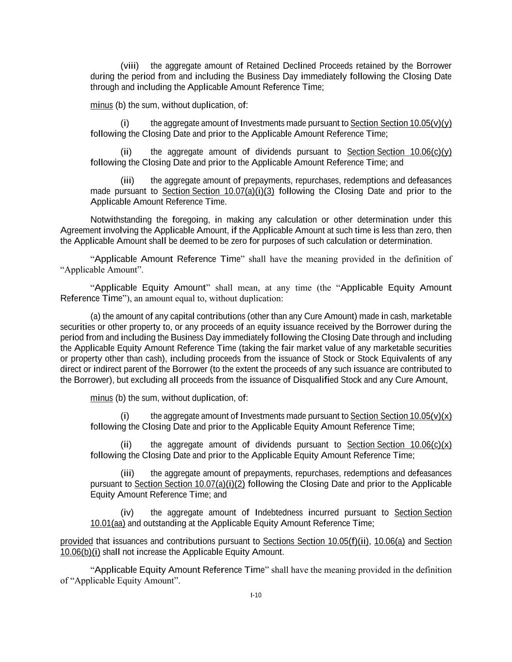 I-10 (viii) the aggregate amount of Retained Declined Proceeds retained by the Borrower during the period from and including the Business Day immediately following the Closing Date through and including the Applicable Amount Reference Time; minus (b) the sum, without duplication, of: (i) the aggregate amount of Investments made pursuant to Section Section 10.05(v)(y) following the Closing Date and prior to the Applicable Amount Reference Time; (ii) the aggregate amount of dividends pursuant to Section Section 10.06(c)(y) following the Closing Date and prior to the Applicable Amount Reference Time; and (iii) the aggregate amount of prepayments, repurchases, redemptions and defeasances made pursuant to Section Section 10.07(a)(i)(3) following the Closing Date and prior to the Applicable Amount Reference Time. Notwithstanding the foregoing, in making any calculation or other determination under this Agreement involving the Applicable Amount, if the Applicable Amount at such time is less than zero, then the Applicable Amount shall be deemed to be zero for purposes of such calculation or determination. “Applicable Amount Reference Time” shall have the meaning provided in the definition of “Applicable Amount”. “Applicable Equity Amount” shall mean, at any time (the “Applicable Equity Amount Reference Time”), an amount equal to, without duplication: (a) the amount of any capital contributions (other than any Cure Amount) made in cash, marketable securities or other property to, or any proceeds of an equity issuance received by the Borrower during the period from and including the Business Day immediately following the Closing Date through and including the Applicable Equity Amount Reference Time (taking the fair market value of any marketable securities or property other than cash), including proceeds from the issuance of Stock or Stock Equivalents of any direct or indirect parent of the Borrower (to the extent the proceeds of any such issuance are contributed to the Borrower), but excluding all proceeds from the issuance of Disqualified Stock and any Cure Amount, minus (b) the sum, without duplication, of: (i) the aggregate amount of Investments made pursuant to Section Section 10.05(v)(x) following the Closing Date and prior to the Applicable Equity Amount Reference Time; (ii) the aggregate amount of dividends pursuant to Section Section 10.06(c)(x) following the Closing Date and prior to the Applicable Equity Amount Reference Time; (iii) the aggregate amount of prepayments, repurchases, redemptions and defeasances pursuant to Section Section 10.07(a)(i)(2) following the Closing Date and prior to the Applicable Equity Amount Reference Time; and (iv) the aggregate amount of Indebtedness incurred pursuant to Section Section 10.01(aa) and outstanding at the Applicable Equity Amount Reference Time; provided that issuances and contributions pursuant to Sections Section 10.05(f)(ii), 10.06(a) and Section 10.06(b)(i) shall not increase the Applicable Equity Amount. “Applicable Equity Amount Reference Time” shall have the meaning provided in the definition of “Applicable Equity Amount”.