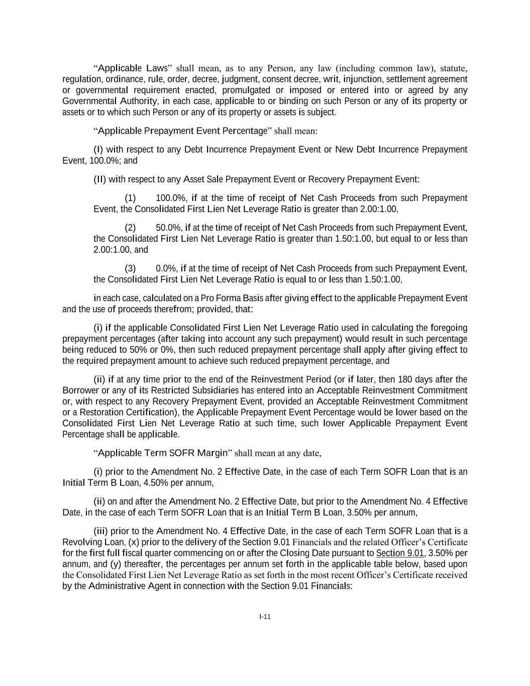 I-11 “Applicable Laws” shall mean, as to any Person, any law (including common law), statute, regulation, ordinance, rule, order, decree, judgment, consent decree, writ, injunction, settlement agreement or governmental requirement enacted, promulgated or imposed or entered into or agreed by any Governmental Authority, in each case, applicable to or binding on such Person or any of its property or assets or to which such Person or any of its property or assets is subject. “Applicable Prepayment Event Percentage” shall mean: (I) with respect to any Debt Incurrence Prepayment Event or New Debt Incurrence Prepayment Event, 100.0%; and (II) with respect to any Asset Sale Prepayment Event or Recovery Prepayment Event: (1) 100.0%, if at the time of receipt of Net Cash Proceeds from such Prepayment Event, the Consolidated First Lien Net Leverage Ratio is greater than 2.00:1.00, (2) 50.0%, if at the time of receipt of Net Cash Proceeds from such Prepayment Event, the Consolidated First Lien Net Leverage Ratio is greater than 1.50:1.00, but equal to or less than 2.00:1.00, and (3) 0.0%, if at the time of receipt of Net Cash Proceeds from such Prepayment Event, the Consolidated First Lien Net Leverage Ratio is equal to or less than 1.50:1.00, in each case, calculated on a Pro Forma Basis after giving effect to the applicable Prepayment Event and the use of proceeds therefrom; provided, that: (i) if the applicable Consolidated First Lien Net Leverage Ratio used in calculating the foregoing prepayment percentages (after taking into account any such prepayment) would result in such percentage being reduced to 50% or 0%, then such reduced prepayment percentage shall apply after giving effect to the required prepayment amount to achieve such reduced prepayment percentage, and (ii) if at any time prior to the end of the Reinvestment Period (or if later, then 180 days after the Borrower or any of its Restricted Subsidiaries has entered into an Acceptable Reinvestment Commitment or, with respect to any Recovery Prepayment Event, provided an Acceptable Reinvestment Commitment or a Restoration Certification), the Applicable Prepayment Event Percentage would be lower based on the Consolidated First Lien Net Leverage Ratio at such time, such lower Applicable Prepayment Event Percentage shall be applicable. “Applicable Term SOFR Margin” shall mean at any date, (i) prior to the Amendment No. 2 Effective Date, in the case of each Term SOFR Loan that is an Initial Term B Loan, 4.50% per annum, (ii) on and after the Amendment No. 2 Effective Date, but prior to the Amendment No. 4 Effective Date, in the case of each Term SOFR Loan that is an Initial Term B Loan, 3.50% per annum, (iii) prior to the Amendment No. 4 Effective Date, in the case of each Term SOFR Loan that is a Revolving Loan, (x) prior to the delivery of the Section 9.01 Financials and the related Officer’s Certificate for the first full fiscal quarter commencing on or after the Closing Date pursuant to Section 9.01, 3.50% per annum, and (y) thereafter, the percentages per annum set forth in the applicable table below, based upon the Consolidated First Lien Net Leverage Ratio as set forth in the most recent Officer’s Certificate received by the Administrative Agent in connection with the Section 9.01 Financials: