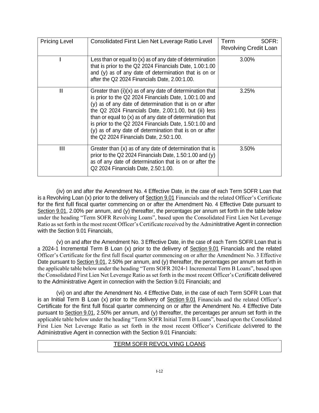 I-12 Pricing Level Consolidated First Lien Net Leverage Ratio Level Term SOFR: Revolving Credit Loan I Less than or equal to (x) as of any date of determination that is prior to the Q2 2024 Financials Date, 1.00:1.00 and (y) as of any date of determination that is on or after the Q2 2024 Financials Date, 2.00:1.00. 3.00% II Greater than (i)(x) as of any date of determination that is prior to the Q2 2024 Financials Date, 1.00:1.00 and (y) as of any date of determination that is on or after the Q2 2024 Financials Date, 2.00:1.00, but (ii) less than or equal to (x) as of any date of determination that is prior to the Q2 2024 Financials Date, 1.50:1.00 and (y) as of any date of determination that is on or after the Q2 2024 Financials Date, 2.50:1.00. 3.25% III Greater than (x) as of any date of determination that is prior to the Q2 2024 Financials Date, 1.50:1.00 and (y) as of any date of determination that is on or after the Q2 2024 Financials Date, 2.50:1.00. 3.50% (iv) on and after the Amendment No. 4 Effective Date, in the case of each Term SOFR Loan that is a Revolving Loan (x) prior to the delivery of Section 9.01 Financials and the related Officer’s Certificate for the first full fiscal quarter commencing on or after the Amendment No. 4 Effective Date pursuant to Section 9.01, 2.00% per annum, and (y) thereafter, the percentages per annum set forth in the table below under the heading “Term SOFR Revolving Loans”, based upon the Consolidated First Lien Net Leverage Ratio as set forth in the most recent Officer’s Certificate received by the Administrative Agent in connection with the Section 9.01 Financials, (v) on and after the Amendment No. 3 Effective Date, in the case of each Term SOFR Loan that is a 2024-1 Incremental Term B Loan (x) prior to the delivery of Section 9.01 Financials and the related Officer’s Certificate for the first full fiscal quarter commencing on or after the Amendment No. 3 Effective Date pursuant to Section 9.01, 2.50% per annum, and (y) thereafter, the percentages per annum set forth in the applicable table below under the heading “Term SOFR 2024-1 Incremental Term B Loans”, based upon the Consolidated First Lien Net Leverage Ratio as set forth in the most recent Officer’s Certificate delivered to the Administrative Agent in connection with the Section 9.01 Financials; and (vi) on and after the Amendment No. 4 Effective Date, in the case of each Term SOFR Loan that is an Initial Term B Loan (x) prior to the delivery of Section 9.01 Financials and the related Officer’s Certificate for the first full fiscal quarter commencing on or after the Amendment No. 4 Effective Date pursuant to Section 9.01, 2.50% per annum, and (y) thereafter, the percentages per annum set forth in the applicable table below under the heading “Term SOFR Initial Term B Loans”, based upon the Consolidated First Lien Net Leverage Ratio as set forth in the most recent Officer’s Certificate delivered to the Administrative Agent in connection with the Section 9.01 Financials: TERM SOFR REVOLVING LOANS