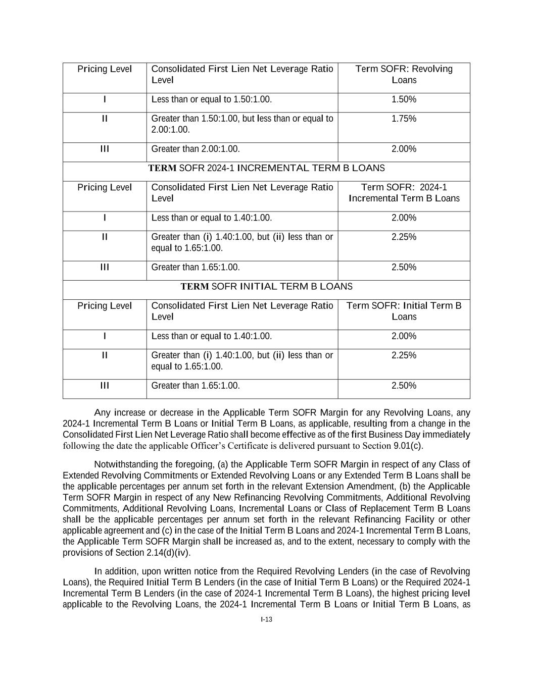 I-13 Pricing Level Consolidated First Lien Net Leverage Ratio Level Term SOFR: Revolving Loans I Less than or equal to 1.50:1.00. 1.50% II Greater than 1.50:1.00, but less than or equal to 2.00:1.00. 1.75% III Greater than 2.00:1.00. 2.00% TERM SOFR 2024-1 INCREMENTAL TERM B LOANS Pricing Level Consolidated First Lien Net Leverage Ratio Level Term SOFR: 2024-1 Incremental Term B Loans I Less than or equal to 1.40:1.00. 2.00% II Greater than (i) 1.40:1.00, but (ii) less than or equal to 1.65:1.00. 2.25% III Greater than 1.65:1.00. 2.50% TERM SOFR INITIAL TERM B LOANS Pricing Level Consolidated First Lien Net Leverage Ratio Level Term SOFR: Initial Term B Loans I Less than or equal to 1.40:1.00. 2.00% II Greater than (i) 1.40:1.00, but (ii) less than or equal to 1.65:1.00. 2.25% III Greater than 1.65:1.00. 2.50% Any increase or decrease in the Applicable Term SOFR Margin for any Revolving Loans, any 2024-1 Incremental Term B Loans or Initial Term B Loans, as applicable, resulting from a change in the Consolidated First Lien Net Leverage Ratio shall become effective as of the first Business Day immediately following the date the applicable Officer’s Certificate is delivered pursuant to Section 9.01(c). Notwithstanding the foregoing, (a) the Applicable Term SOFR Margin in respect of any Class of Extended Revolving Commitments or Extended Revolving Loans or any Extended Term B Loans shall be the applicable percentages per annum set forth in the relevant Extension Amendment, (b) the Applicable Term SOFR Margin in respect of any New Refinancing Revolving Commitments, Additional Revolving Commitments, Additional Revolving Loans, Incremental Loans or Class of Replacement Term B Loans shall be the applicable percentages per annum set forth in the relevant Refinancing Facility or other applicable agreement and (c) in the case of the Initial Term B Loans and 2024-1 Incremental Term B Loans, the Applicable Term SOFR Margin shall be increased as, and to the extent, necessary to comply with the provisions of Section 2.14(d)(iv). In addition, upon written notice from the Required Revolving Lenders (in the case of Revolving Loans), the Required Initial Term B Lenders (in the case of Initial Term B Loans) or the Required 2024-1 Incremental Term B Lenders (in the case of 2024-1 Incremental Term B Loans), the highest pricing level applicable to the Revolving Loans, the 2024-1 Incremental Term B Loans or Initial Term B Loans, as