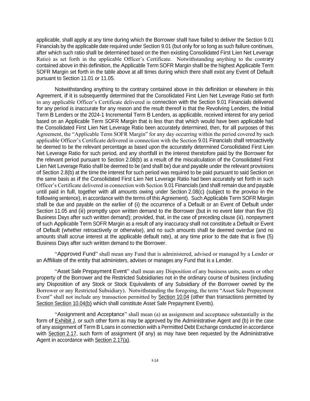 I-14 applicable, shall apply at any time during which the Borrower shall have failed to deliver the Section 9.01 Financials by the applicable date required under Section 9.01 (but only for so long as such failure continues, after which such ratio shall be determined based on the then existing Consolidated First Lien Net Leverage Ratio) as set forth in the applicable Officer’s Certificate. Notwithstanding anything to the contrary contained above in this definition, the Applicable Term SOFR Margin shall be the highest Applicable Term SOFR Margin set forth in the table above at all times during which there shall exist any Event of Default pursuant to Section 11.01 or 11.05. Notwithstanding anything to the contrary contained above in this definition or elsewhere in this Agreement, if it is subsequently determined that the Consolidated First Lien Net Leverage Ratio set forth in any applicable Officer’s Certificate delivered in connection with the Section 9.01 Financials delivered for any period is inaccurate for any reason and the result thereof is that the Revolving Lenders, the Initial Term B Lenders or the 2024-1 Incremental Term B Lenders, as applicable, received interest for any period based on an Applicable Term SOFR Margin that is less than that which would have been applicable had the Consolidated First Lien Net Leverage Ratio been accurately determined, then, for all purposes of this Agreement, the “Applicable Term SOFR Margin” for any day occurring within the period covered by such applicable Officer’s Certificate delivered in connection with the Section 9.01 Financials shall retroactively be deemed to be the relevant percentage as based upon the accurately determined Consolidated First Lien Net Leverage Ratio for such period, and any shortfall in the interest theretofore paid by the Borrower for the relevant period pursuant to Section 2.08(b) as a result of the miscalculation of the Consolidated First Lien Net Leverage Ratio shall be deemed to be (and shall be) due and payable under the relevant provisions of Section 2.8(b) at the time the interest for such period was required to be paid pursuant to said Section on the same basis as if the Consolidated First Lien Net Leverage Ratio had been accurately set forth in such Officer’s Certificate delivered in connection with Section 9.01 Financials (and shall remain due and payable until paid in full, together with all amounts owing under Section 2.08(c) (subject to the proviso in the following sentence), in accordance with the terms of this Agreement). Such Applicable Term SOFR Margin shall be due and payable on the earlier of (i) the occurrence of a Default or an Event of Default under Section 11.05 and (ii) promptly upon written demand to the Borrower (but in no event later than five (5) Business Days after such written demand); provided, that, in the case of preceding clause (ii), nonpayment of such Applicable Term SOFR Margin as a result of any inaccuracy shall not constitute a Default or Event of Default (whether retroactively or otherwise), and no such amounts shall be deemed overdue (and no amounts shall accrue interest at the applicable default rate), at any time prior to the date that is five (5) Business Days after such written demand to the Borrower. “Approved Fund” shall mean any Fund that is administered, advised or managed by a Lender or an Affiliate of the entity that administers, advises or manages any Fund that is a Lender. “Asset Sale Prepayment Event” shall mean any Disposition of any business units, assets or other property of the Borrower and the Restricted Subsidiaries not in the ordinary course of business (including any Disposition of any Stock or Stock Equivalents of any Subsidiary of the Borrower owned by the Borrower or any Restricted Subsidiary). Notwithstanding the foregoing, the term “Asset Sale Prepayment Event” shall not include any transaction permitted by Section 10.04 (other than transactions permitted by Section Section 10.04(b) which shall constitute Asset Sale Prepayment Events). “Assignment and Acceptance” shall mean (a) an assignment and acceptance substantially in the form of Exhibit J, or such other form as may be approved by the Administrative Agent and (b) in the case of any assignment of Term B Loans in connection with a Permitted Debt Exchange conducted in accordance with Section 2.17, such form of assignment (if any) as may have been requested by the Administrative Agent in accordance with Section 2.17(a).