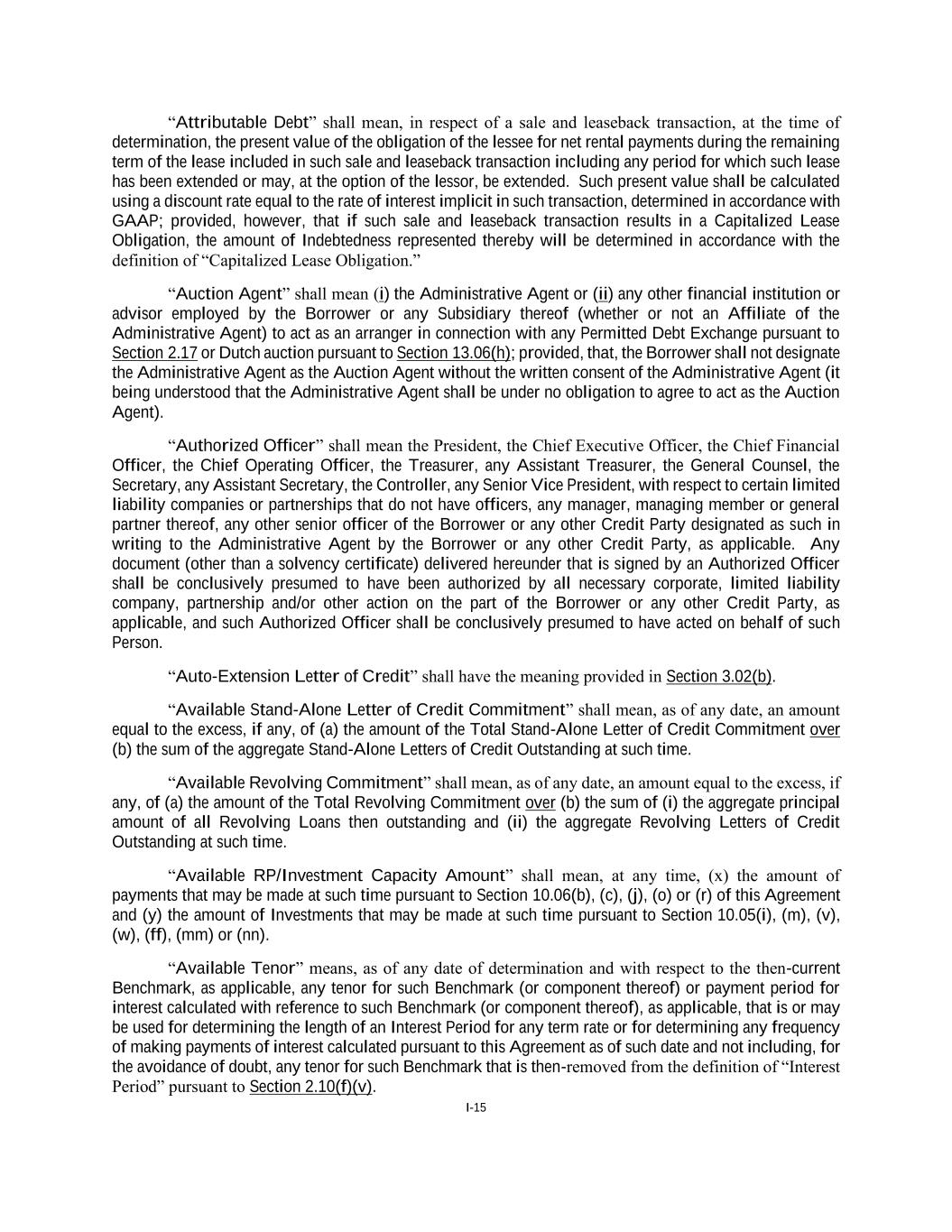 I-15 “Attributable Debt” shall mean, in respect of a sale and leaseback transaction, at the time of determination, the present value of the obligation of the lessee for net rental payments during the remaining term of the lease included in such sale and leaseback transaction including any period for which such lease has been extended or may, at the option of the lessor, be extended. Such present value shall be calculated using a discount rate equal to the rate of interest implicit in such transaction, determined in accordance with GAAP; provided, however, that if such sale and leaseback transaction results in a Capitalized Lease Obligation, the amount of Indebtedness represented thereby will be determined in accordance with the definition of “Capitalized Lease Obligation.” “Auction Agent” shall mean (i) the Administrative Agent or (ii) any other financial institution or advisor employed by the Borrower or any Subsidiary thereof (whether or not an Affiliate of the Administrative Agent) to act as an arranger in connection with any Permitted Debt Exchange pursuant to Section 2.17 or Dutch auction pursuant to Section 13.06(h); provided, that, the Borrower shall not designate the Administrative Agent as the Auction Agent without the written consent of the Administrative Agent (it being understood that the Administrative Agent shall be under no obligation to agree to act as the Auction Agent). “Authorized Officer” shall mean the President, the Chief Executive Officer, the Chief Financial Officer, the Chief Operating Officer, the Treasurer, any Assistant Treasurer, the General Counsel, the Secretary, any Assistant Secretary, the Controller, any Senior Vice President, with respect to certain limited liability companies or partnerships that do not have officers, any manager, managing member or general partner thereof, any other senior officer of the Borrower or any other Credit Party designated as such in writing to the Administrative Agent by the Borrower or any other Credit Party, as applicable. Any document (other than a solvency certificate) delivered hereunder that is signed by an Authorized Officer shall be conclusively presumed to have been authorized by all necessary corporate, limited liability company, partnership and/or other action on the part of the Borrower or any other Credit Party, as applicable, and such Authorized Officer shall be conclusively presumed to have acted on behalf of such Person. “Auto-Extension Letter of Credit” shall have the meaning provided in Section 3.02(b). “Available Stand-Alone Letter of Credit Commitment” shall mean, as of any date, an amount equal to the excess, if any, of (a) the amount of the Total Stand-Alone Letter of Credit Commitment over (b) the sum of the aggregate Stand-Alone Letters of Credit Outstanding at such time. “Available Revolving Commitment” shall mean, as of any date, an amount equal to the excess, if any, of (a) the amount of the Total Revolving Commitment over (b) the sum of (i) the aggregate principal amount of all Revolving Loans then outstanding and (ii) the aggregate Revolving Letters of Credit Outstanding at such time. “Available RP/Investment Capacity Amount” shall mean, at any time, (x) the amount of payments that may be made at such time pursuant to Section 10.06(b), (c), (j), (o) or (r) of this Agreement and (y) the amount of Investments that may be made at such time pursuant to Section 10.05(i), (m), (v), (w), (ff), (mm) or (nn). “Available Tenor” means, as of any date of determination and with respect to the then-current Benchmark, as applicable, any tenor for such Benchmark (or component thereof) or payment period for interest calculated with reference to such Benchmark (or component thereof), as applicable, that is or may be used for determining the length of an Interest Period for any term rate or for determining any frequency of making payments of interest calculated pursuant to this Agreement as of such date and not including, for the avoidance of doubt, any tenor for such Benchmark that is then-removed from the definition of “Interest Period” pursuant to Section 2.10(f)(v).
