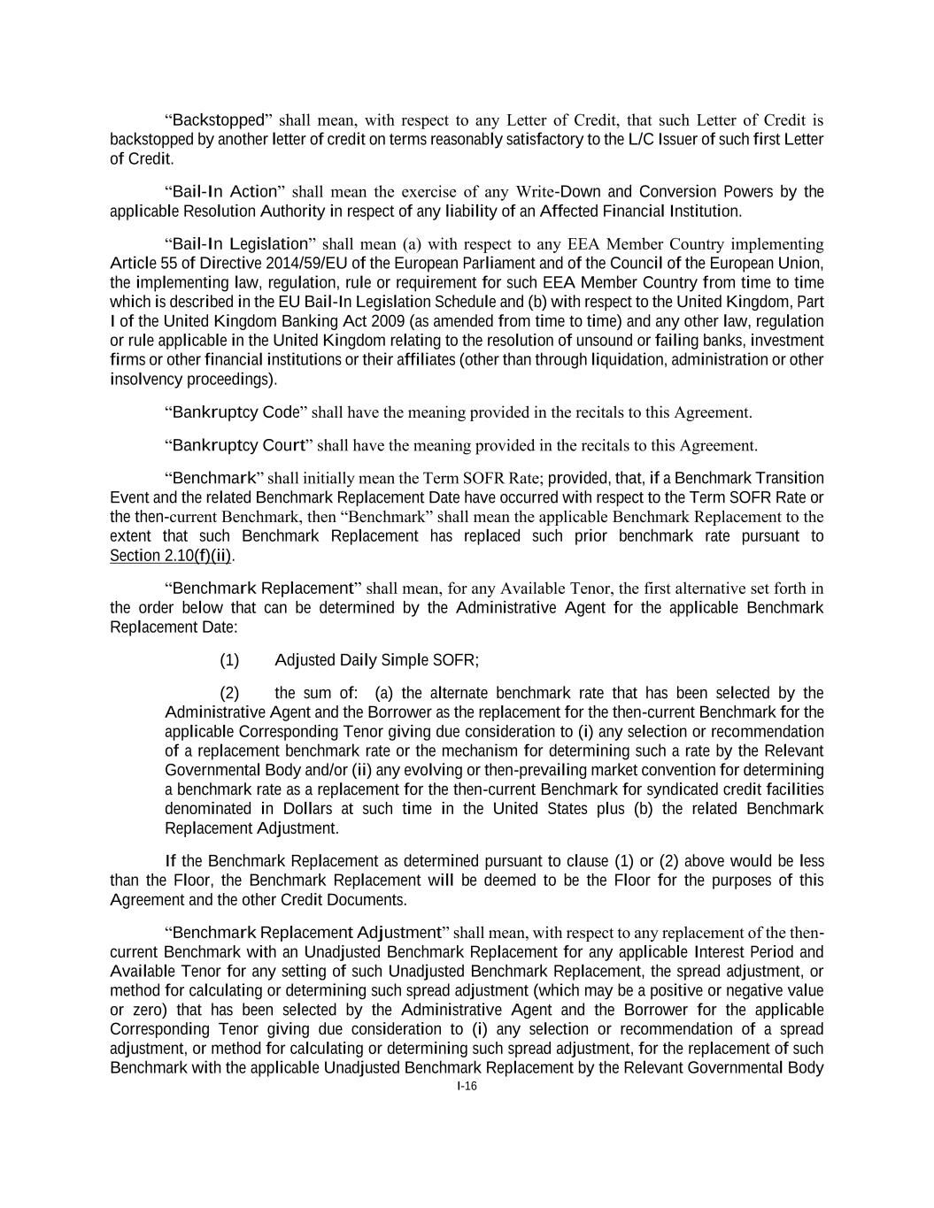 I-16 “Backstopped” shall mean, with respect to any Letter of Credit, that such Letter of Credit is backstopped by another letter of credit on terms reasonably satisfactory to the L/C Issuer of such first Letter of Credit. “Bail-In Action” shall mean the exercise of any Write-Down and Conversion Powers by the applicable Resolution Authority in respect of any liability of an Affected Financial Institution. “Bail-In Legislation” shall mean (a) with respect to any EEA Member Country implementing Article 55 of Directive 2014/59/EU of the European Parliament and of the Council of the European Union, the implementing law, regulation, rule or requirement for such EEA Member Country from time to time which is described in the EU Bail-In Legislation Schedule and (b) with respect to the United Kingdom, Part I of the United Kingdom Banking Act 2009 (as amended from time to time) and any other law, regulation or rule applicable in the United Kingdom relating to the resolution of unsound or failing banks, investment firms or other financial institutions or their affiliates (other than through liquidation, administration or other insolvency proceedings). “Bankruptcy Code” shall have the meaning provided in the recitals to this Agreement. “Bankruptcy Court” shall have the meaning provided in the recitals to this Agreement. “Benchmark” shall initially mean the Term SOFR Rate; provided, that, if a Benchmark Transition Event and the related Benchmark Replacement Date have occurred with respect to the Term SOFR Rate or the then-current Benchmark, then “Benchmark” shall mean the applicable Benchmark Replacement to the extent that such Benchmark Replacement has replaced such prior benchmark rate pursuant to Section 2.10(f)(ii). “Benchmark Replacement” shall mean, for any Available Tenor, the first alternative set forth in the order below that can be determined by the Administrative Agent for the applicable Benchmark Replacement Date: (1) Adjusted Daily Simple SOFR; (2) the sum of: (a) the alternate benchmark rate that has been selected by the Administrative Agent and the Borrower as the replacement for the then-current Benchmark for the applicable Corresponding Tenor giving due consideration to (i) any selection or recommendation of a replacement benchmark rate or the mechanism for determining such a rate by the Relevant Governmental Body and/or (ii) any evolving or then-prevailing market convention for determining a benchmark rate as a replacement for the then-current Benchmark for syndicated credit facilities denominated in Dollars at such time in the United States plus (b) the related Benchmark Replacement Adjustment. If the Benchmark Replacement as determined pursuant to clause (1) or (2) above would be less than the Floor, the Benchmark Replacement will be deemed to be the Floor for the purposes of this Agreement and the other Credit Documents. “Benchmark Replacement Adjustment” shall mean, with respect to any replacement of the then- current Benchmark with an Unadjusted Benchmark Replacement for any applicable Interest Period and Available Tenor for any setting of such Unadjusted Benchmark Replacement, the spread adjustment, or method for calculating or determining such spread adjustment (which may be a positive or negative value or zero) that has been selected by the Administrative Agent and the Borrower for the applicable Corresponding Tenor giving due consideration to (i) any selection or recommendation of a spread adjustment, or method for calculating or determining such spread adjustment, for the replacement of such Benchmark with the applicable Unadjusted Benchmark Replacement by the Relevant Governmental Body