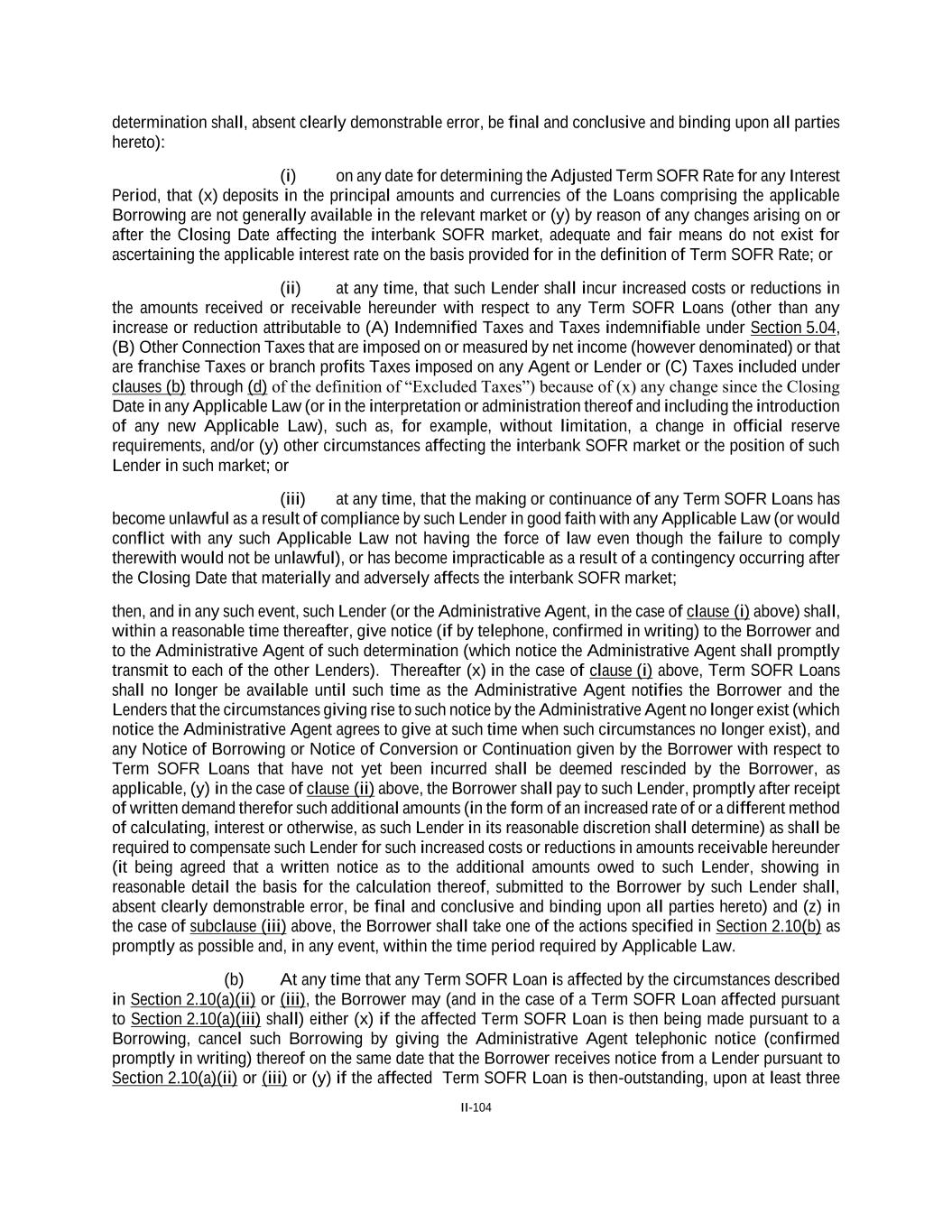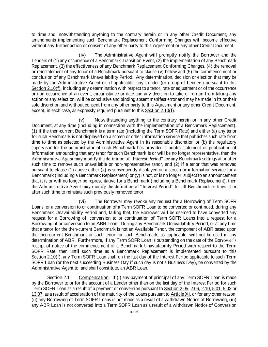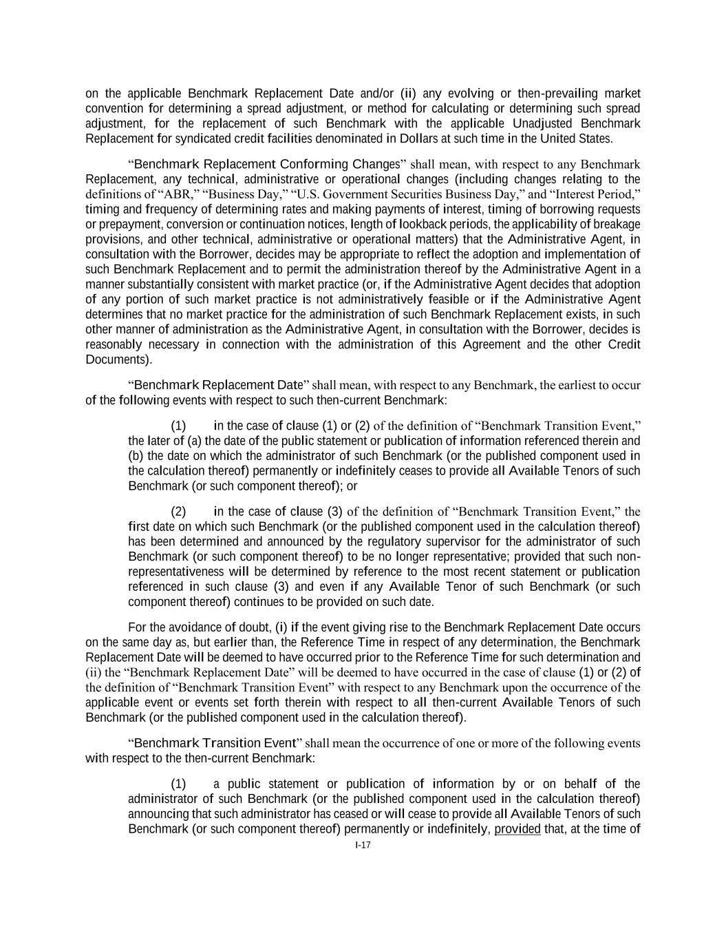 I-17 on the applicable Benchmark Replacement Date and/or (ii) any evolving or then-prevailing market convention for determining a spread adjustment, or method for calculating or determining such spread adjustment, for the replacement of such Benchmark with the applicable Unadjusted Benchmark Replacement for syndicated credit facilities denominated in Dollars at such time in the United States. “Benchmark Replacement Conforming Changes” shall mean, with respect to any Benchmark Replacement, any technical, administrative or operational changes (including changes relating to the definitions of “ABR,” “Business Day,” “U.S. Government Securities Business Day,” and “Interest Period,” timing and frequency of determining rates and making payments of interest, timing of borrowing requests or prepayment, conversion or continuation notices, length of lookback periods, the applicability of breakage provisions, and other technical, administrative or operational matters) that the Administrative Agent, in consultation with the Borrower, decides may be appropriate to reflect the adoption and implementation of such Benchmark Replacement and to permit the administration thereof by the Administrative Agent in a manner substantially consistent with market practice (or, if the Administrative Agent decides that adoption of any portion of such market practice is not administratively feasible or if the Administrative Agent determines that no market practice for the administration of such Benchmark Replacement exists, in such other manner of administration as the Administrative Agent, in consultation with the Borrower, decides is reasonably necessary in connection with the administration of this Agreement and the other Credit Documents). “Benchmark Replacement Date” shall mean, with respect to any Benchmark, the earliest to occur of the following events with respect to such then-current Benchmark: (1) in the case of clause (1) or (2) of the definition of “Benchmark Transition Event,” the later of (a) the date of the public statement or publication of information referenced therein and (b) the date on which the administrator of such Benchmark (or the published component used in the calculation thereof) permanently or indefinitely ceases to provide all Available Tenors of such Benchmark (or such component thereof); or (2) in the case of clause (3) of the definition of “Benchmark Transition Event,” the first date on which such Benchmark (or the published component used in the calculation thereof) has been determined and announced by the regulatory supervisor for the administrator of such Benchmark (or such component thereof) to be no longer representative; provided that such non- representativeness will be determined by reference to the most recent statement or publication referenced in such clause (3) and even if any Available Tenor of such Benchmark (or such component thereof) continues to be provided on such date. For the avoidance of doubt, (i) if the event giving rise to the Benchmark Replacement Date occurs on the same day as, but earlier than, the Reference Time in respect of any determination, the Benchmark Replacement Date will be deemed to have occurred prior to the Reference Time for such determination and (ii) the “Benchmark Replacement Date” will be deemed to have occurred in the case of clause (1) or (2) of the definition of “Benchmark Transition Event” with respect to any Benchmark upon the occurrence of the applicable event or events set forth therein with respect to all then-current Available Tenors of such Benchmark (or the published component used in the calculation thereof). “Benchmark Transition Event” shall mean the occurrence of one or more of the following events with respect to the then-current Benchmark: (1) a public statement or publication of information by or on behalf of the administrator of such Benchmark (or the published component used in the calculation thereof) announcing that such administrator has ceased or will cease to provide all Available Tenors of such Benchmark (or such component thereof) permanently or indefinitely, provided that, at the time of