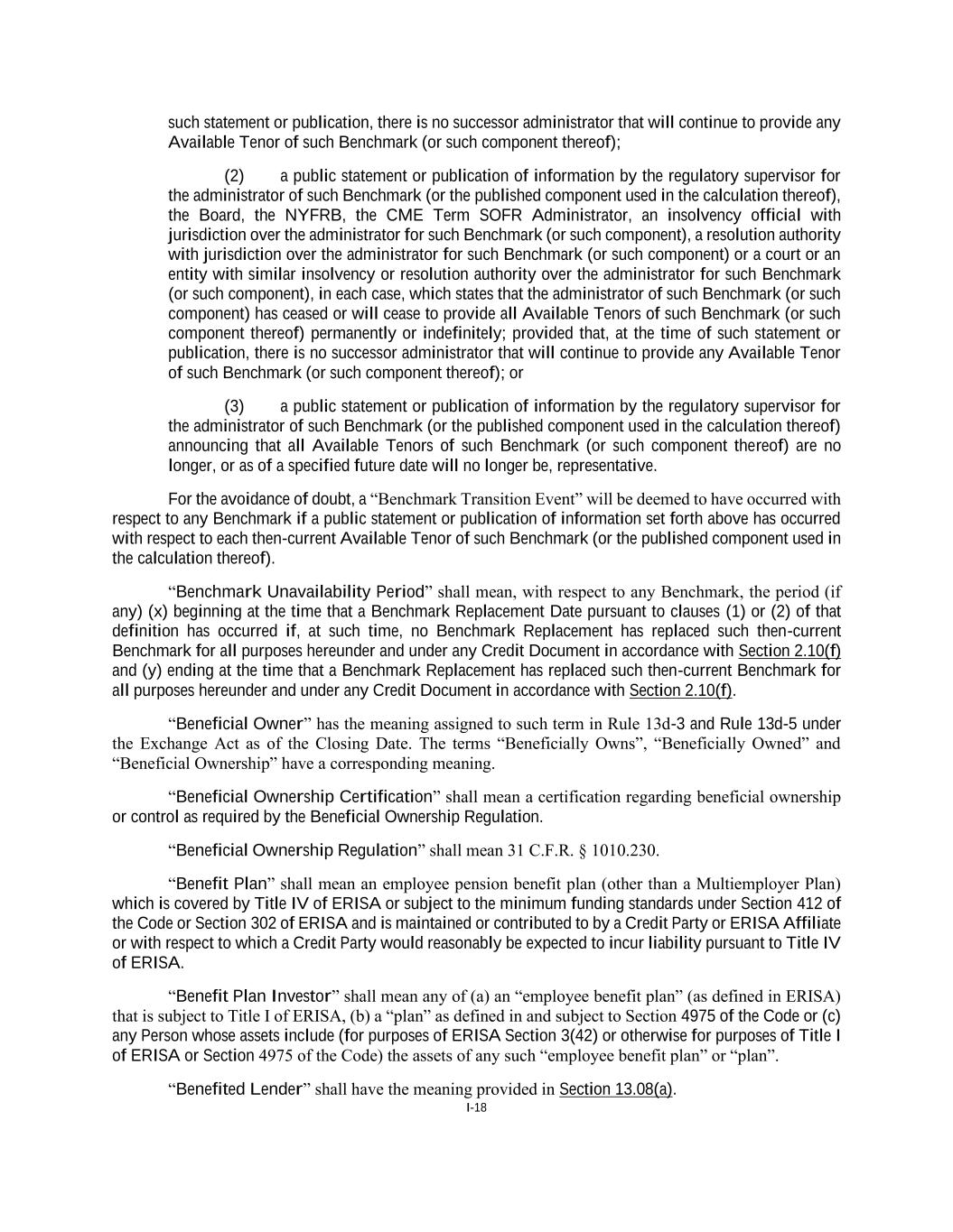 I-18 such statement or publication, there is no successor administrator that will continue to provide any Available Tenor of such Benchmark (or such component thereof); (2) a public statement or publication of information by the regulatory supervisor for the administrator of such Benchmark (or the published component used in the calculation thereof), the Board, the NYFRB, the CME Term SOFR Administrator, an insolvency official with jurisdiction over the administrator for such Benchmark (or such component), a resolution authority with jurisdiction over the administrator for such Benchmark (or such component) or a court or an entity with similar insolvency or resolution authority over the administrator for such Benchmark (or such component), in each case, which states that the administrator of such Benchmark (or such component) has ceased or will cease to provide all Available Tenors of such Benchmark (or such component thereof) permanently or indefinitely; provided that, at the time of such statement or publication, there is no successor administrator that will continue to provide any Available Tenor of such Benchmark (or such component thereof); or (3) a public statement or publication of information by the regulatory supervisor for the administrator of such Benchmark (or the published component used in the calculation thereof) announcing that all Available Tenors of such Benchmark (or such component thereof) are no longer, or as of a specified future date will no longer be, representative. For the avoidance of doubt, a “Benchmark Transition Event” will be deemed to have occurred with respect to any Benchmark if a public statement or publication of information set forth above has occurred with respect to each then-current Available Tenor of such Benchmark (or the published component used in the calculation thereof). “Benchmark Unavailability Period” shall mean, with respect to any Benchmark, the period (if any) (x) beginning at the time that a Benchmark Replacement Date pursuant to clauses (1) or (2) of that definition has occurred if, at such time, no Benchmark Replacement has replaced such then-current Benchmark for all purposes hereunder and under any Credit Document in accordance with Section 2.10(f) and (y) ending at the time that a Benchmark Replacement has replaced such then-current Benchmark for all purposes hereunder and under any Credit Document in accordance with Section 2.10(f). “Beneficial Owner” has the meaning assigned to such term in Rule 13d-3 and Rule 13d-5 under the Exchange Act as of the Closing Date. The terms “Beneficially Owns”, “Beneficially Owned” and “Beneficial Ownership” have a corresponding meaning. “Beneficial Ownership Certification” shall mean a certification regarding beneficial ownership or control as required by the Beneficial Ownership Regulation. “Beneficial Ownership Regulation” shall mean 31 C.F.R. § 1010.230. “Benefit Plan” shall mean an employee pension benefit plan (other than a Multiemployer Plan) which is covered by Title IV of ERISA or subject to the minimum funding standards under Section 412 of the Code or Section 302 of ERISA and is maintained or contributed to by a Credit Party or ERISA Affiliate or with respect to which a Credit Party would reasonably be expected to incur liability pursuant to Title IV of ERISA. “Benefit Plan Investor” shall mean any of (a) an “employee benefit plan” (as defined in ERISA) that is subject to Title I of ERISA, (b) a “plan” as defined in and subject to Section 4975 of the Code or (c) any Person whose assets include (for purposes of ERISA Section 3(42) or otherwise for purposes of Title I of ERISA or Section 4975 of the Code) the assets of any such “employee benefit plan” or “plan”. “Benefited Lender” shall have the meaning provided in Section 13.08(a).