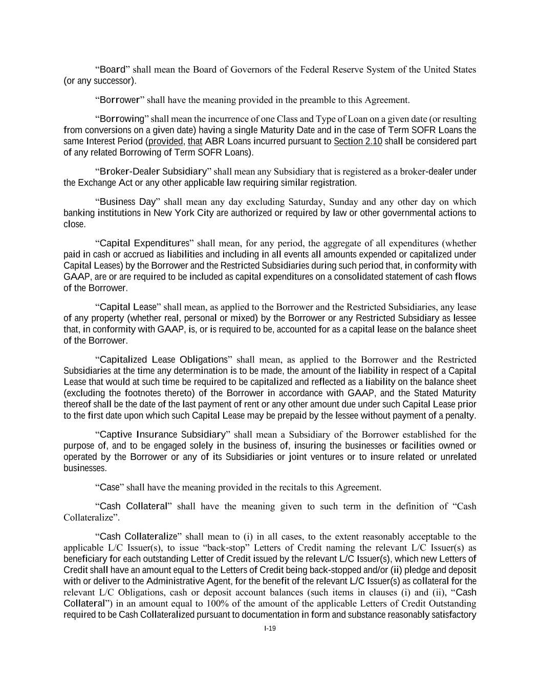 I-19 “Board” shall mean the Board of Governors of the Federal Reserve System of the United States (or any successor). “Borrower” shall have the meaning provided in the preamble to this Agreement. “Borrowing” shall mean the incurrence of one Class and Type of Loan on a given date (or resulting from conversions on a given date) having a single Maturity Date and in the case of Term SOFR Loans the same Interest Period (provided, that ABR Loans incurred pursuant to Section 2.10 shall be considered part of any related Borrowing of Term SOFR Loans). “Broker-Dealer Subsidiary” shall mean any Subsidiary that is registered as a broker-dealer under the Exchange Act or any other applicable law requiring similar registration. “Business Day” shall mean any day excluding Saturday, Sunday and any other day on which banking institutions in New York City are authorized or required by law or other governmental actions to close. “Capital Expenditures” shall mean, for any period, the aggregate of all expenditures (whether paid in cash or accrued as liabilities and including in all events all amounts expended or capitalized under Capital Leases) by the Borrower and the Restricted Subsidiaries during such period that, in conformity with GAAP, are or are required to be included as capital expenditures on a consolidated statement of cash flows of the Borrower. “Capital Lease” shall mean, as applied to the Borrower and the Restricted Subsidiaries, any lease of any property (whether real, personal or mixed) by the Borrower or any Restricted Subsidiary as lessee that, in conformity with GAAP, is, or is required to be, accounted for as a capital lease on the balance sheet of the Borrower. “Capitalized Lease Obligations” shall mean, as applied to the Borrower and the Restricted Subsidiaries at the time any determination is to be made, the amount of the liability in respect of a Capital Lease that would at such time be required to be capitalized and reflected as a liability on the balance sheet (excluding the footnotes thereto) of the Borrower in accordance with GAAP, and the Stated Maturity thereof shall be the date of the last payment of rent or any other amount due under such Capital Lease prior to the first date upon which such Capital Lease may be prepaid by the lessee without payment of a penalty. “Captive Insurance Subsidiary” shall mean a Subsidiary of the Borrower established for the purpose of, and to be engaged solely in the business of, insuring the businesses or facilities owned or operated by the Borrower or any of its Subsidiaries or joint ventures or to insure related or unrelated businesses. “Case” shall have the meaning provided in the recitals to this Agreement. “Cash Collateral” shall have the meaning given to such term in the definition of “Cash Collateralize”. “Cash Collateralize” shall mean to (i) in all cases, to the extent reasonably acceptable to the applicable L/C Issuer(s), to issue “back-stop” Letters of Credit naming the relevant L/C Issuer(s) as beneficiary for each outstanding Letter of Credit issued by the relevant L/C Issuer(s), which new Letters of Credit shall have an amount equal to the Letters of Credit being back-stopped and/or (ii) pledge and deposit with or deliver to the Administrative Agent, for the benefit of the relevant L/C Issuer(s) as collateral for the relevant L/C Obligations, cash or deposit account balances (such items in clauses (i) and (ii), “Cash Collateral”) in an amount equal to 100% of the amount of the applicable Letters of Credit Outstanding required to be Cash Collateralized pursuant to documentation in form and substance reasonably satisfactory