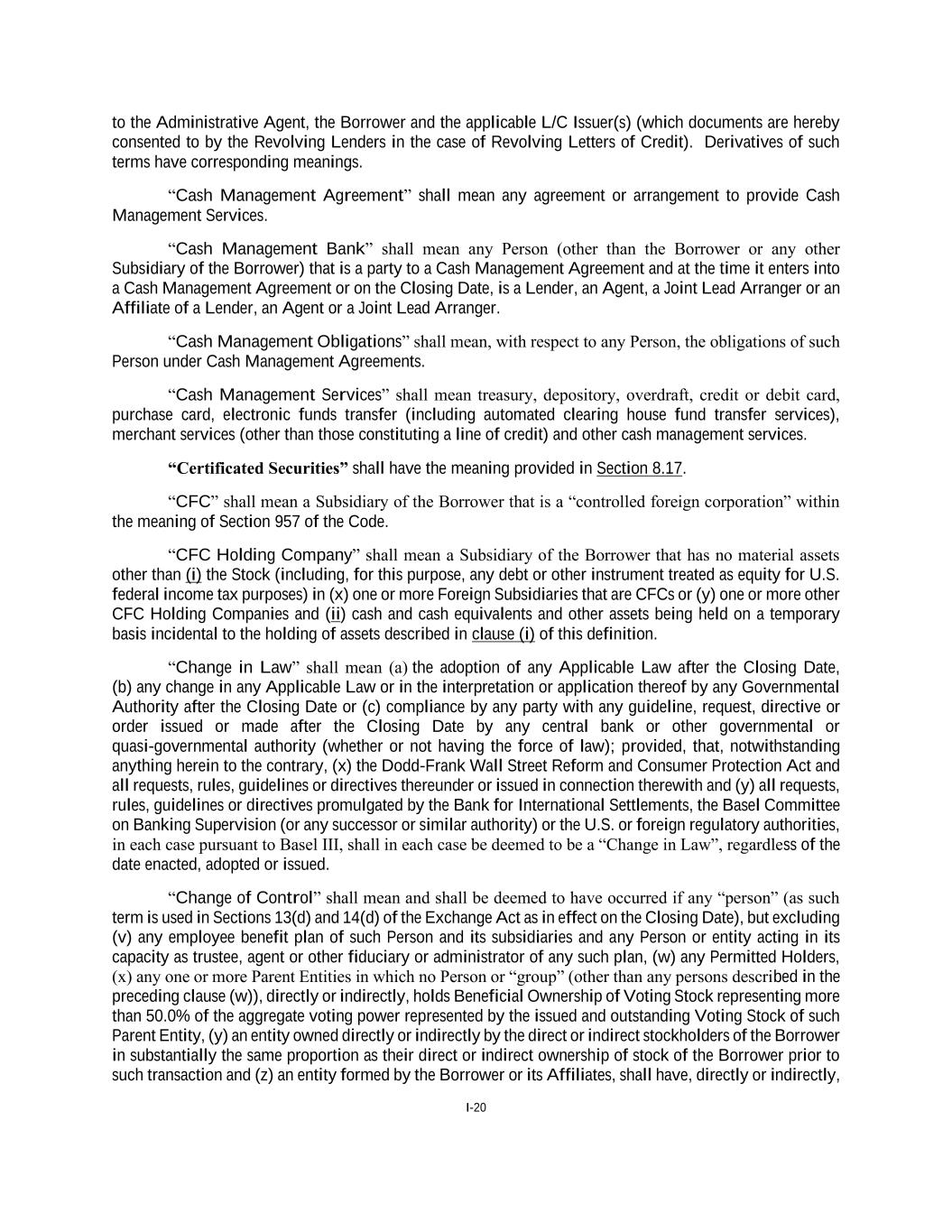 I-20 to the Administrative Agent, the Borrower and the applicable L/C Issuer(s) (which documents are hereby consented to by the Revolving Lenders in the case of Revolving Letters of Credit). Derivatives of such terms have corresponding meanings. “Cash Management Agreement” shall mean any agreement or arrangement to provide Cash Management Services. “Cash Management Bank” shall mean any Person (other than the Borrower or any other Subsidiary of the Borrower) that is a party to a Cash Management Agreement and at the time it enters into a Cash Management Agreement or on the Closing Date, is a Lender, an Agent, a Joint Lead Arranger or an Affiliate of a Lender, an Agent or a Joint Lead Arranger. “Cash Management Obligations” shall mean, with respect to any Person, the obligations of such Person under Cash Management Agreements. “Cash Management Services” shall mean treasury, depository, overdraft, credit or debit card, purchase card, electronic funds transfer (including automated clearing house fund transfer services), merchant services (other than those constituting a line of credit) and other cash management services. “Certificated Securities” shall have the meaning provided in Section 8.17. “CFC” shall mean a Subsidiary of the Borrower that is a “controlled foreign corporation” within the meaning of Section 957 of the Code. “CFC Holding Company” shall mean a Subsidiary of the Borrower that has no material assets other than (i) the Stock (including, for this purpose, any debt or other instrument treated as equity for U.S. federal income tax purposes) in (x) one or more Foreign Subsidiaries that are CFCs or (y) one or more other CFC Holding Companies and (ii) cash and cash equivalents and other assets being held on a temporary basis incidental to the holding of assets described in clause (i) of this definition. “Change in Law” shall mean (a) the adoption of any Applicable Law after the Closing Date, (b) any change in any Applicable Law or in the interpretation or application thereof by any Governmental Authority after the Closing Date or (c) compliance by any party with any guideline, request, directive or order issued or made after the Closing Date by any central bank or other governmental or quasi-governmental authority (whether or not having the force of law); provided, that, notwithstanding anything herein to the contrary, (x) the Dodd-Frank Wall Street Reform and Consumer Protection Act and all requests, rules, guidelines or directives thereunder or issued in connection therewith and (y) all requests, rules, guidelines or directives promulgated by the Bank for International Settlements, the Basel Committee on Banking Supervision (or any successor or similar authority) or the U.S. or foreign regulatory authorities, in each case pursuant to Basel III, shall in each case be deemed to be a “Change in Law”, regardless of the date enacted, adopted or issued. “Change of Control” shall mean and shall be deemed to have occurred if any “person” (as such term is used in Sections 13(d) and 14(d) of the Exchange Act as in effect on the Closing Date), but excluding (v) any employee benefit plan of such Person and its subsidiaries and any Person or entity acting in its capacity as trustee, agent or other fiduciary or administrator of any such plan, (w) any Permitted Holders, (x) any one or more Parent Entities in which no Person or “group” (other than any persons described in the preceding clause (w)), directly or indirectly, holds Beneficial Ownership of Voting Stock representing more than 50.0% of the aggregate voting power represented by the issued and outstanding Voting Stock of such Parent Entity, (y) an entity owned directly or indirectly by the direct or indirect stockholders of the Borrower in substantially the same proportion as their direct or indirect ownership of stock of the Borrower prior to such transaction and (z) an entity formed by the Borrower or its Affiliates, shall have, directly or indirectly,
