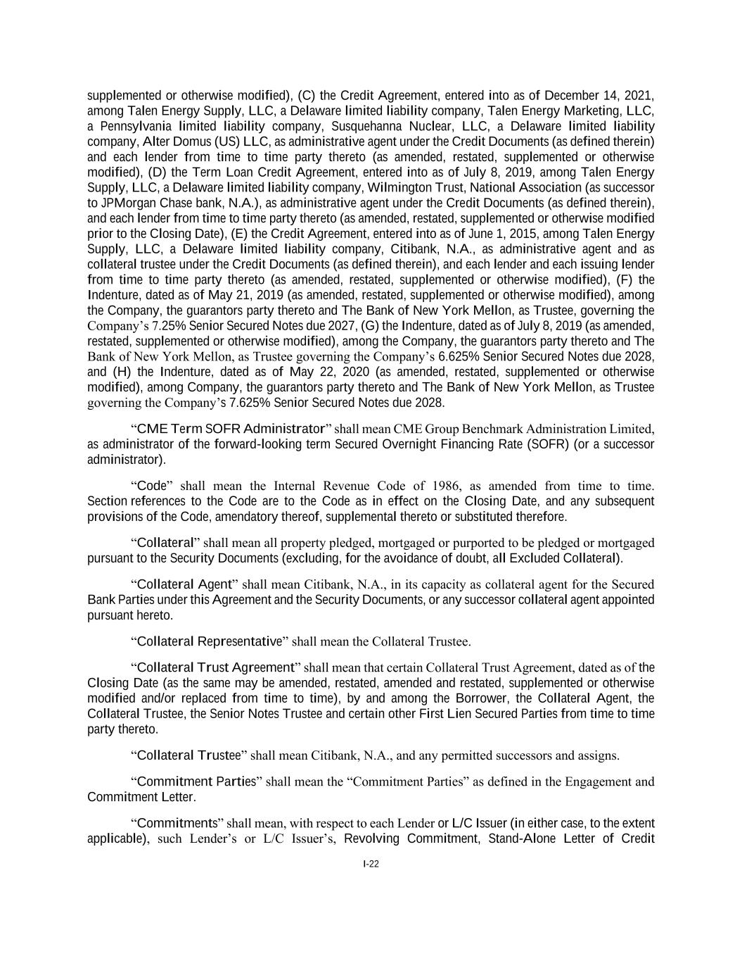 I-22 supplemented or otherwise modified), (C) the Credit Agreement, entered into as of December 14, 2021, among Talen Energy Supply, LLC, a Delaware limited liability company, Talen Energy Marketing, LLC, a Pennsylvania limited liability company, Susquehanna Nuclear, LLC, a Delaware limited liability company, Alter Domus (US) LLC, as administrative agent under the Credit Documents (as defined therein) and each lender from time to time party thereto (as amended, restated, supplemented or otherwise modified), (D) the Term Loan Credit Agreement, entered into as of July 8, 2019, among Talen Energy Supply, LLC, a Delaware limited liability company, Wilmington Trust, National Association (as successor to JPMorgan Chase bank, N.A.), as administrative agent under the Credit Documents (as defined therein), and each lender from time to time party thereto (as amended, restated, supplemented or otherwise modified prior to the Closing Date), (E) the Credit Agreement, entered into as of June 1, 2015, among Talen Energy Supply, LLC, a Delaware limited liability company, Citibank, N.A., as administrative agent and as collateral trustee under the Credit Documents (as defined therein), and each lender and each issuing lender from time to time party thereto (as amended, restated, supplemented or otherwise modified), (F) the Indenture, dated as of May 21, 2019 (as amended, restated, supplemented or otherwise modified), among the Company, the guarantors party thereto and The Bank of New York Mellon, as Trustee, governing the Company’s 7.25% Senior Secured Notes due 2027, (G) the Indenture, dated as of July 8, 2019 (as amended, restated, supplemented or otherwise modified), among the Company, the guarantors party thereto and The Bank of New York Mellon, as Trustee governing the Company’s 6.625% Senior Secured Notes due 2028, and (H) the Indenture, dated as of May 22, 2020 (as amended, restated, supplemented or otherwise modified), among Company, the guarantors party thereto and The Bank of New York Mellon, as Trustee governing the Company’s 7.625% Senior Secured Notes due 2028. “CME Term SOFR Administrator” shall mean CME Group Benchmark Administration Limited, as administrator of the forward-looking term Secured Overnight Financing Rate (SOFR) (or a successor administrator). “Code” shall mean the Internal Revenue Code of 1986, as amended from time to time. Section references to the Code are to the Code as in effect on the Closing Date, and any subsequent provisions of the Code, amendatory thereof, supplemental thereto or substituted therefore. “Collateral” shall mean all property pledged, mortgaged or purported to be pledged or mortgaged pursuant to the Security Documents (excluding, for the avoidance of doubt, all Excluded Collateral). “Collateral Agent” shall mean Citibank, N.A., in its capacity as collateral agent for the Secured Bank Parties under this Agreement and the Security Documents, or any successor collateral agent appointed pursuant hereto. “Collateral Representative” shall mean the Collateral Trustee. “Collateral Trust Agreement” shall mean that certain Collateral Trust Agreement, dated as of the Closing Date (as the same may be amended, restated, amended and restated, supplemented or otherwise modified and/or replaced from time to time), by and among the Borrower, the Collateral Agent, the Collateral Trustee, the Senior Notes Trustee and certain other First Lien Secured Parties from time to time party thereto. “Collateral Trustee” shall mean Citibank, N.A., and any permitted successors and assigns. “Commitment Parties” shall mean the “Commitment Parties” as defined in the Engagement and Commitment Letter. “Commitments” shall mean, with respect to each Lender or L/C Issuer (in either case, to the extent applicable), such Lender’s or L/C Issuer’s, Revolving Commitment, Stand-Alone Letter of Credit