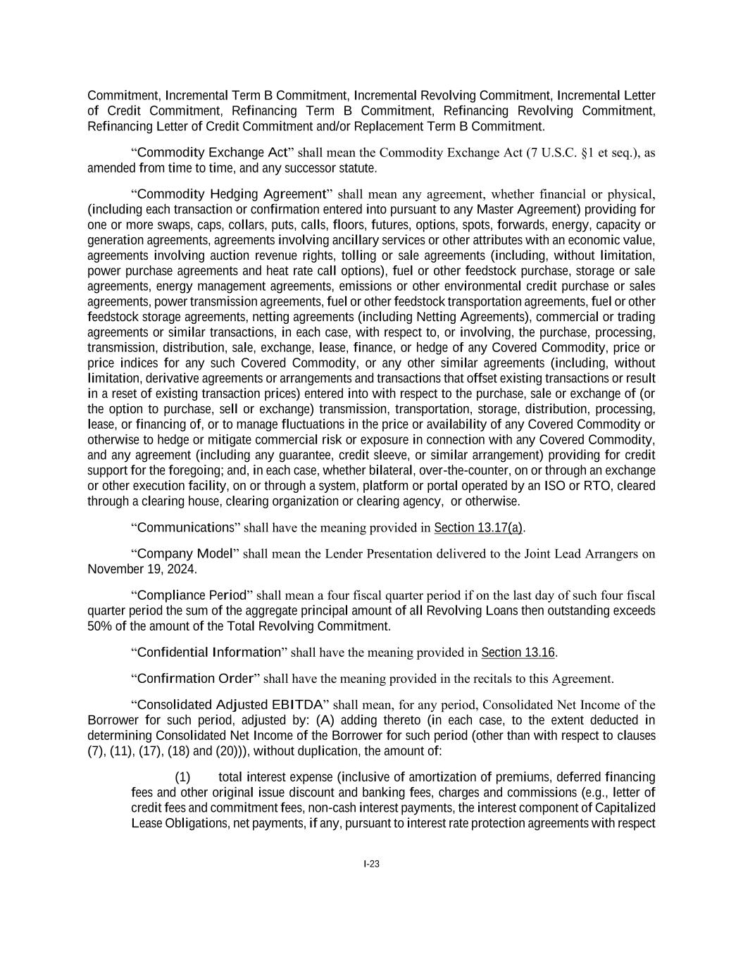 I-23 Commitment, Incremental Term B Commitment, Incremental Revolving Commitment, Incremental Letter of Credit Commitment, Refinancing Term B Commitment, Refinancing Revolving Commitment, Refinancing Letter of Credit Commitment and/or Replacement Term B Commitment. “Commodity Exchange Act” shall mean the Commodity Exchange Act (7 U.S.C. §1 et seq.), as amended from time to time, and any successor statute. “Commodity Hedging Agreement” shall mean any agreement, whether financial or physical, (including each transaction or confirmation entered into pursuant to any Master Agreement) providing for one or more swaps, caps, collars, puts, calls, floors, futures, options, spots, forwards, energy, capacity or generation agreements, agreements involving ancillary services or other attributes with an economic value, agreements involving auction revenue rights, tolling or sale agreements (including, without limitation, power purchase agreements and heat rate call options), fuel or other feedstock purchase, storage or sale agreements, energy management agreements, emissions or other environmental credit purchase or sales agreements, power transmission agreements, fuel or other feedstock transportation agreements, fuel or other feedstock storage agreements, netting agreements (including Netting Agreements), commercial or trading agreements or similar transactions, in each case, with respect to, or involving, the purchase, processing, transmission, distribution, sale, exchange, lease, finance, or hedge of any Covered Commodity, price or price indices for any such Covered Commodity, or any other similar agreements (including, without limitation, derivative agreements or arrangements and transactions that offset existing transactions or result in a reset of existing transaction prices) entered into with respect to the purchase, sale or exchange of (or the option to purchase, sell or exchange) transmission, transportation, storage, distribution, processing, lease, or financing of, or to manage fluctuations in the price or availability of any Covered Commodity or otherwise to hedge or mitigate commercial risk or exposure in connection with any Covered Commodity, and any agreement (including any guarantee, credit sleeve, or similar arrangement) providing for credit support for the foregoing; and, in each case, whether bilateral, over-the-counter, on or through an exchange or other execution facility, on or through a system, platform or portal operated by an ISO or RTO, cleared through a clearing house, clearing organization or clearing agency, or otherwise. “Communications” shall have the meaning provided in Section 13.17(a). “Company Model” shall mean the Lender Presentation delivered to the Joint Lead Arrangers on November 19, 2024. “Compliance Period” shall mean a four fiscal quarter period if on the last day of such four fiscal quarter period the sum of the aggregate principal amount of all Revolving Loans then outstanding exceeds 50% of the amount of the Total Revolving Commitment. “Confidential Information” shall have the meaning provided in Section 13.16. “Confirmation Order” shall have the meaning provided in the recitals to this Agreement. “Consolidated Adjusted EBITDA” shall mean, for any period, Consolidated Net Income of the Borrower for such period, adjusted by: (A) adding thereto (in each case, to the extent deducted in determining Consolidated Net Income of the Borrower for such period (other than with respect to clauses (7), (11), (17), (18) and (20))), without duplication, the amount of: (1) total interest expense (inclusive of amortization of premiums, deferred financing fees and other original issue discount and banking fees, charges and commissions (e.g., letter of credit fees and commitment fees, non-cash interest payments, the interest component of Capitalized Lease Obligations, net payments, if any, pursuant to interest rate protection agreements with respect