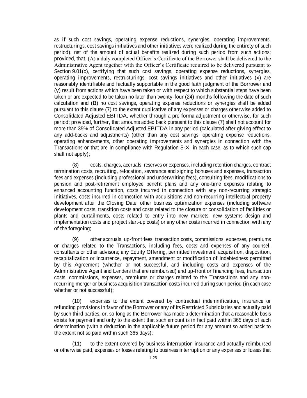 I-25 as if such cost savings, operating expense reductions, synergies, operating improvements, restructurings, cost savings initiatives and other initiatives were realized during the entirety of such period), net of the amount of actual benefits realized during such period from such actions; provided, that, (A) a duly completed Officer’s Certificate of the Borrower shall be delivered to the Administrative Agent together with the Officer’s Certificate required to be delivered pursuant to Section 9.01(c), certifying that such cost savings, operating expense reductions, synergies, operating improvements, restructurings, cost savings initiatives and other initiatives (x) are reasonably identifiable and factually supportable in the good faith judgment of the Borrower and (y) result from actions which have been taken or with respect to which substantial steps have been taken or are expected to be taken no later than twenty-four (24) months following the date of such calculation and (B) no cost savings, operating expense reductions or synergies shall be added pursuant to this clause (7) to the extent duplicative of any expenses or charges otherwise added to Consolidated Adjusted EBITDA, whether through a pro forma adjustment or otherwise, for such period; provided, further, that amounts added back pursuant to this clause (7) shall not account for more than 35% of Consolidated Adjusted EBITDA in any period (calculated after giving effect to any add-backs and adjustments) (other than any cost savings, operating expense reductions, operating enhancements, other operating improvements and synergies in connection with the Transactions or that are in compliance with Regulation S-X, in each case, as to which such cap shall not apply); (8) costs, charges, accruals, reserves or expenses, including retention charges, contract termination costs, recruiting, relocation, severance and signing bonuses and expenses, transaction fees and expenses (including professional and underwriting fees), consulting fees, modifications to pension and post-retirement employee benefit plans and any one-time expenses relating to enhanced accounting function, costs incurred in connection with any non-recurring strategic initiatives, costs incurred in connection with acquisitions and non-recurring intellectual property development after the Closing Date, other business optimization expenses (including software development costs, transition costs and costs related to the closure or consolidation of facilities or plants and curtailments, costs related to entry into new markets, new systems design and implementation costs and project start-up costs) or any other costs incurred in connection with any of the foregoing; (9) other accruals, up-front fees, transaction costs, commissions, expenses, premiums or charges related to the Transactions, including fees, costs and expenses of any counsel, consultants or other advisors; any Equity Offering, permitted investment, acquisition, disposition, recapitalization or incurrence, repayment, amendment or modification of Indebtedness permitted by this Agreement (whether or not successful, and including costs and expenses of the Administrative Agent and Lenders that are reimbursed) and up-front or financing fees, transaction costs, commissions, expenses, premiums or charges related to the Transactions and any non- recurring merger or business acquisition transaction costs incurred during such period (in each case whether or not successful); (10) expenses to the extent covered by contractual indemnification, insurance or refunding provisions in favor of the Borrower or any of its Restricted Subsidiaries and actually paid by such third parties, or, so long as the Borrower has made a determination that a reasonable basis exists for payment and only to the extent that such amount is in fact paid within 365 days of such determination (with a deduction in the applicable future period for any amount so added back to the extent not so paid within such 365 days); (11) to the extent covered by business interruption insurance and actually reimbursed or otherwise paid, expenses or losses relating to business interruption or any expenses or losses that