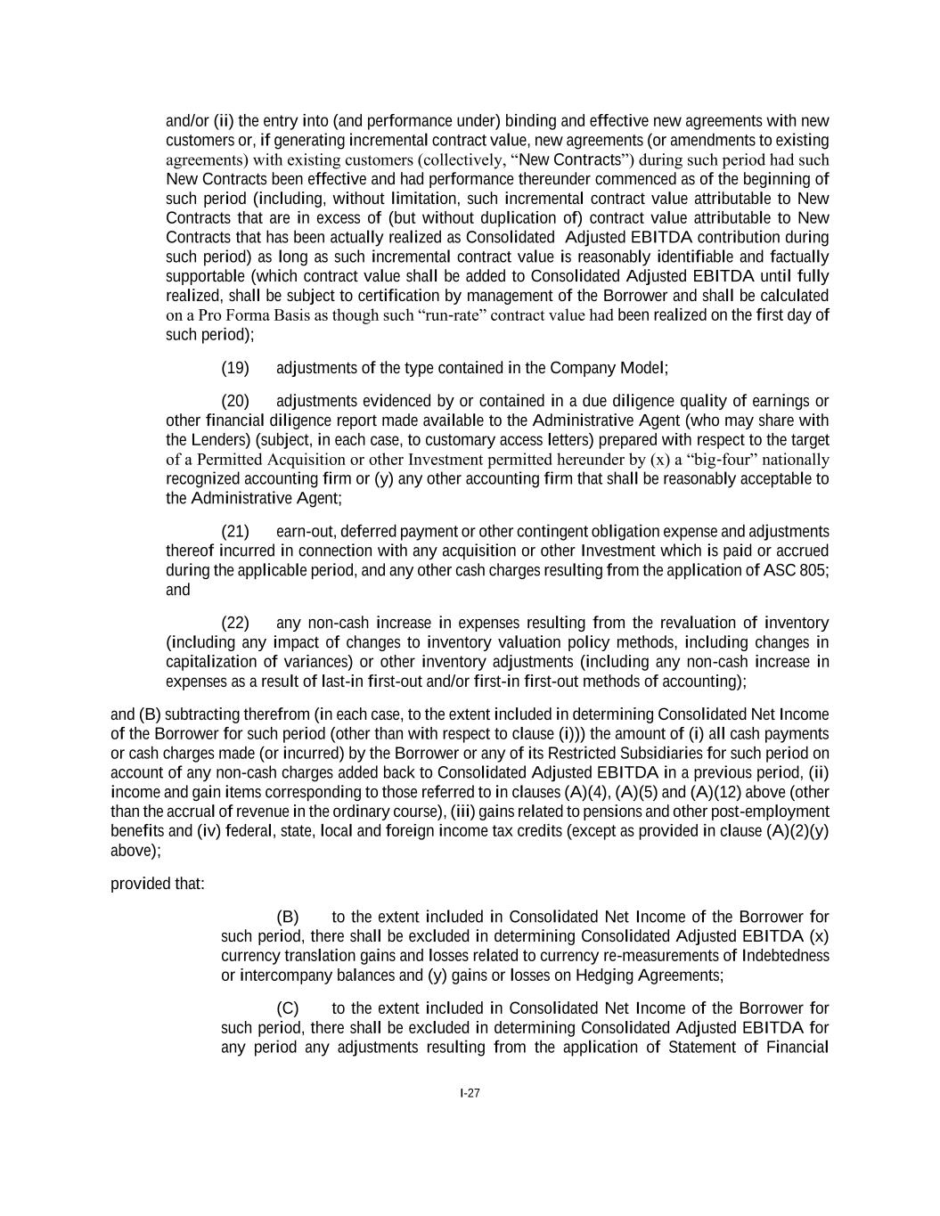 I-27 and/or (ii) the entry into (and performance under) binding and effective new agreements with new customers or, if generating incremental contract value, new agreements (or amendments to existing agreements) with existing customers (collectively, “New Contracts”) during such period had such New Contracts been effective and had performance thereunder commenced as of the beginning of such period (including, without limitation, such incremental contract value attributable to New Contracts that are in excess of (but without duplication of) contract value attributable to New Contracts that has been actually realized as Consolidated Adjusted EBITDA contribution during such period) as long as such incremental contract value is reasonably identifiable and factually supportable (which contract value shall be added to Consolidated Adjusted EBITDA until fully realized, shall be subject to certification by management of the Borrower and shall be calculated on a Pro Forma Basis as though such “run-rate” contract value had been realized on the first day of such period); (19) adjustments of the type contained in the Company Model; (20) adjustments evidenced by or contained in a due diligence quality of earnings or other financial diligence report made available to the Administrative Agent (who may share with the Lenders) (subject, in each case, to customary access letters) prepared with respect to the target of a Permitted Acquisition or other Investment permitted hereunder by (x) a “big-four” nationally recognized accounting firm or (y) any other accounting firm that shall be reasonably acceptable to the Administrative Agent; (21) earn-out, deferred payment or other contingent obligation expense and adjustments thereof incurred in connection with any acquisition or other Investment which is paid or accrued during the applicable period, and any other cash charges resulting from the application of ASC 805; and (22) any non-cash increase in expenses resulting from the revaluation of inventory (including any impact of changes to inventory valuation policy methods, including changes in capitalization of variances) or other inventory adjustments (including any non-cash increase in expenses as a result of last-in first-out and/or first-in first-out methods of accounting); and (B) subtracting therefrom (in each case, to the extent included in determining Consolidated Net Income of the Borrower for such period (other than with respect to clause (i))) the amount of (i) all cash payments or cash charges made (or incurred) by the Borrower or any of its Restricted Subsidiaries for such period on account of any non-cash charges added back to Consolidated Adjusted EBITDA in a previous period, (ii) income and gain items corresponding to those referred to in clauses (A)(4), (A)(5) and (A)(12) above (other than the accrual of revenue in the ordinary course), (iii) gains related to pensions and other post-employment benefits and (iv) federal, state, local and foreign income tax credits (except as provided in clause (A)(2)(y) above); provided that: (B) to the extent included in Consolidated Net Income of the Borrower for such period, there shall be excluded in determining Consolidated Adjusted EBITDA (x) currency translation gains and losses related to currency re-measurements of Indebtedness or intercompany balances and (y) gains or losses on Hedging Agreements; (C) to the extent included in Consolidated Net Income of the Borrower for such period, there shall be excluded in determining Consolidated Adjusted EBITDA for any period any adjustments resulting from the application of Statement of Financial