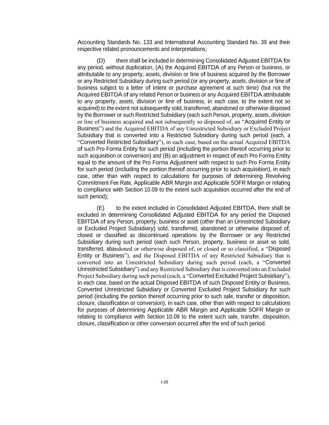 I-28 Accounting Standards No. 133 and International Accounting Standard No. 39 and their respective related pronouncements and interpretations; (D) there shall be included in determining Consolidated Adjusted EBITDA for any period, without duplication, (A) the Acquired EBITDA of any Person or business, or attributable to any property, assets, division or line of business acquired by the Borrower or any Restricted Subsidiary during such period (or any property, assets, division or line of business subject to a letter of intent or purchase agreement at such time) (but not the Acquired EBITDA of any related Person or business or any Acquired EBITDA attributable to any property, assets, division or line of business, in each case, to the extent not so acquired) to the extent not subsequently sold, transferred, abandoned or otherwise disposed by the Borrower or such Restricted Subsidiary (each such Person, property, assets, division or line of business acquired and not subsequently so disposed of, an “Acquired Entity or Business”) and the Acquired EBITDA of any Unrestricted Subsidiary or Excluded Project Subsidiary that is converted into a Restricted Subsidiary during such period (each, a “Converted Restricted Subsidiary”), in each case, based on the actual Acquired EBITDA of such Pro Forma Entity for such period (including the portion thereof occurring prior to such acquisition or conversion) and (B) an adjustment in respect of each Pro Forma Entity equal to the amount of the Pro Forma Adjustment with respect to such Pro Forma Entity for such period (including the portion thereof occurring prior to such acquisition), in each case, other than with respect to calculations for purposes of determining Revolving Commitment Fee Rate, Applicable ABR Margin and Applicable SOFR Margin or relating to compliance with Section 10.09 to the extent such acquisition occurred after the end of such period); (E) to the extent included in Consolidated Adjusted EBITDA, there shall be excluded in determining Consolidated Adjusted EBITDA for any period the Disposed EBITDA of any Person, property, business or asset (other than an Unrestricted Subsidiary or Excluded Project Subsidiary) sold, transferred, abandoned or otherwise disposed of, closed or classified as discontinued operations by the Borrower or any Restricted Subsidiary during such period (each such Person, property, business or asset so sold, transferred, abandoned or otherwise disposed of, or closed or so classified, a “Disposed Entity or Business”), and the Disposed EBITDA of any Restricted Subsidiary that is converted into an Unrestricted Subsidiary during such period (each, a “Converted Unrestricted Subsidiary”) and any Restricted Subsidiary that is converted into an Excluded Project Subsidiary during such period (each, a “Converted Excluded Project Subsidiary”), in each case, based on the actual Disposed EBITDA of such Disposed Entity or Business, Converted Unrestricted Subsidiary or Converted Excluded Project Subsidiary for such period (including the portion thereof occurring prior to such sale, transfer or disposition, closure, classification or conversion), in each case, other than with respect to calculations for purposes of determining Applicable ABR Margin and Applicable SOFR Margin or relating to compliance with Section 10.09 to the extent such sale, transfer, disposition, closure, classification or other conversion occurred after the end of such period.