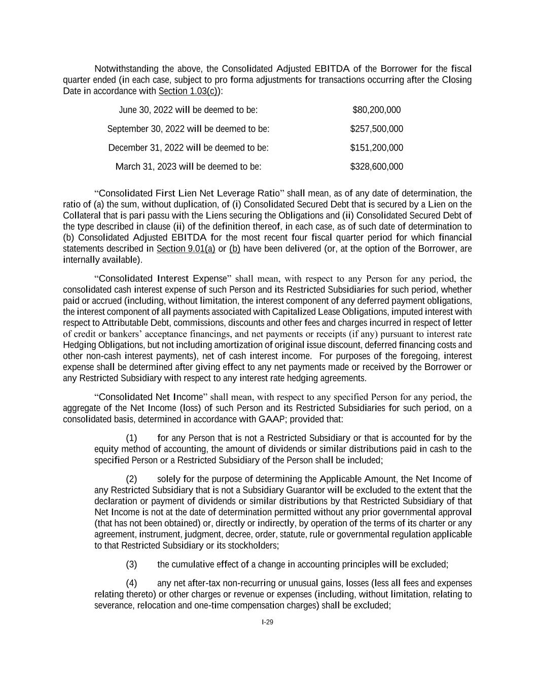 I-29 Notwithstanding the above, the Consolidated Adjusted EBITDA of the Borrower for the fiscal quarter ended (in each case, subject to pro forma adjustments for transactions occurring after the Closing Date in accordance with Section 1.03(c)): June 30, 2022 will be deemed to be: $80,200,000 September 30, 2022 will be deemed to be: $257,500,000 December 31, 2022 will be deemed to be: $151,200,000 March 31, 2023 will be deemed to be: $328,600,000 “Consolidated First Lien Net Leverage Ratio” shall mean, as of any date of determination, the ratio of (a) the sum, without duplication, of (i) Consolidated Secured Debt that is secured by a Lien on the Collateral that is pari passu with the Liens securing the Obligations and (ii) Consolidated Secured Debt of the type described in clause (ii) of the definition thereof, in each case, as of such date of determination to (b) Consolidated Adjusted EBITDA for the most recent four fiscal quarter period for which financial statements described in Section 9.01(a) or (b) have been delivered (or, at the option of the Borrower, are internally available). “Consolidated Interest Expense” shall mean, with respect to any Person for any period, the consolidated cash interest expense of such Person and its Restricted Subsidiaries for such period, whether paid or accrued (including, without limitation, the interest component of any deferred payment obligations, the interest component of all payments associated with Capitalized Lease Obligations, imputed interest with respect to Attributable Debt, commissions, discounts and other fees and charges incurred in respect of letter of credit or bankers’ acceptance financings, and net payments or receipts (if any) pursuant to interest rate Hedging Obligations, but not including amortization of original issue discount, deferred financing costs and other non-cash interest payments), net of cash interest income. For purposes of the foregoing, interest expense shall be determined after giving effect to any net payments made or received by the Borrower or any Restricted Subsidiary with respect to any interest rate hedging agreements. “Consolidated Net Income” shall mean, with respect to any specified Person for any period, the aggregate of the Net Income (loss) of such Person and its Restricted Subsidiaries for such period, on a consolidated basis, determined in accordance with GAAP; provided that: (1) for any Person that is not a Restricted Subsidiary or that is accounted for by the equity method of accounting, the amount of dividends or similar distributions paid in cash to the specified Person or a Restricted Subsidiary of the Person shall be included; (2) solely for the purpose of determining the Applicable Amount, the Net Income of any Restricted Subsidiary that is not a Subsidiary Guarantor will be excluded to the extent that the declaration or payment of dividends or similar distributions by that Restricted Subsidiary of that Net Income is not at the date of determination permitted without any prior governmental approval (that has not been obtained) or, directly or indirectly, by operation of the terms of its charter or any agreement, instrument, judgment, decree, order, statute, rule or governmental regulation applicable to that Restricted Subsidiary or its stockholders; (3) the cumulative effect of a change in accounting principles will be excluded; (4) any net after-tax non-recurring or unusual gains, losses (less all fees and expenses relating thereto) or other charges or revenue or expenses (including, without limitation, relating to severance, relocation and one-time compensation charges) shall be excluded;
