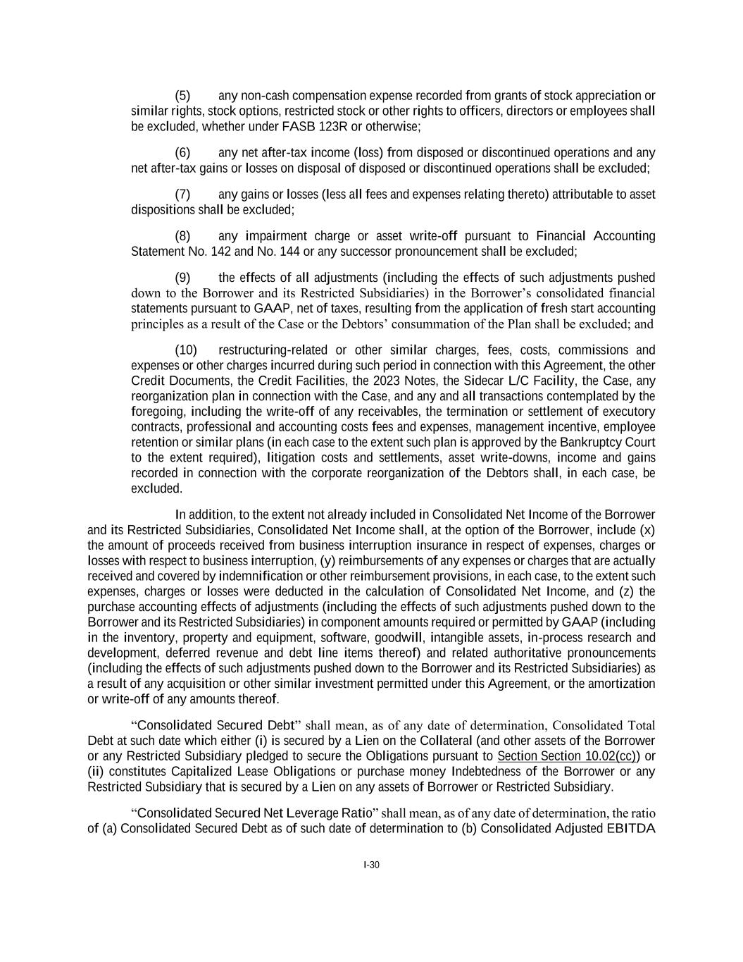I-30 (5) any non-cash compensation expense recorded from grants of stock appreciation or similar rights, stock options, restricted stock or other rights to officers, directors or employees shall be excluded, whether under FASB 123R or otherwise; (6) any net after-tax income (loss) from disposed or discontinued operations and any net after-tax gains or losses on disposal of disposed or discontinued operations shall be excluded; (7) any gains or losses (less all fees and expenses relating thereto) attributable to asset dispositions shall be excluded; (8) any impairment charge or asset write-off pursuant to Financial Accounting Statement No. 142 and No. 144 or any successor pronouncement shall be excluded; (9) the effects of all adjustments (including the effects of such adjustments pushed down to the Borrower and its Restricted Subsidiaries) in the Borrower’s consolidated financial statements pursuant to GAAP, net of taxes, resulting from the application of fresh start accounting principles as a result of the Case or the Debtors’ consummation of the Plan shall be excluded; and (10) restructuring-related or other similar charges, fees, costs, commissions and expenses or other charges incurred during such period in connection with this Agreement, the other Credit Documents, the Credit Facilities, the 2023 Notes, the Sidecar L/C Facility, the Case, any reorganization plan in connection with the Case, and any and all transactions contemplated by the foregoing, including the write-off of any receivables, the termination or settlement of executory contracts, professional and accounting costs fees and expenses, management incentive, employee retention or similar plans (in each case to the extent such plan is approved by the Bankruptcy Court to the extent required), litigation costs and settlements, asset write-downs, income and gains recorded in connection with the corporate reorganization of the Debtors shall, in each case, be excluded. In addition, to the extent not already included in Consolidated Net Income of the Borrower and its Restricted Subsidiaries, Consolidated Net Income shall, at the option of the Borrower, include (x) the amount of proceeds received from business interruption insurance in respect of expenses, charges or losses with respect to business interruption, (y) reimbursements of any expenses or charges that are actually received and covered by indemnification or other reimbursement provisions, in each case, to the extent such expenses, charges or losses were deducted in the calculation of Consolidated Net Income, and (z) the purchase accounting effects of adjustments (including the effects of such adjustments pushed down to the Borrower and its Restricted Subsidiaries) in component amounts required or permitted by GAAP (including in the inventory, property and equipment, software, goodwill, intangible assets, in-process research and development, deferred revenue and debt line items thereof) and related authoritative pronouncements (including the effects of such adjustments pushed down to the Borrower and its Restricted Subsidiaries) as a result of any acquisition or other similar investment permitted under this Agreement, or the amortization or write-off of any amounts thereof. “Consolidated Secured Debt” shall mean, as of any date of determination, Consolidated Total Debt at such date which either (i) is secured by a Lien on the Collateral (and other assets of the Borrower or any Restricted Subsidiary pledged to secure the Obligations pursuant to Section Section 10.02(cc)) or (ii) constitutes Capitalized Lease Obligations or purchase money Indebtedness of the Borrower or any Restricted Subsidiary that is secured by a Lien on any assets of Borrower or Restricted Subsidiary. “Consolidated Secured Net Leverage Ratio” shall mean, as of any date of determination, the ratio of (a) Consolidated Secured Debt as of such date of determination to (b) Consolidated Adjusted EBITDA