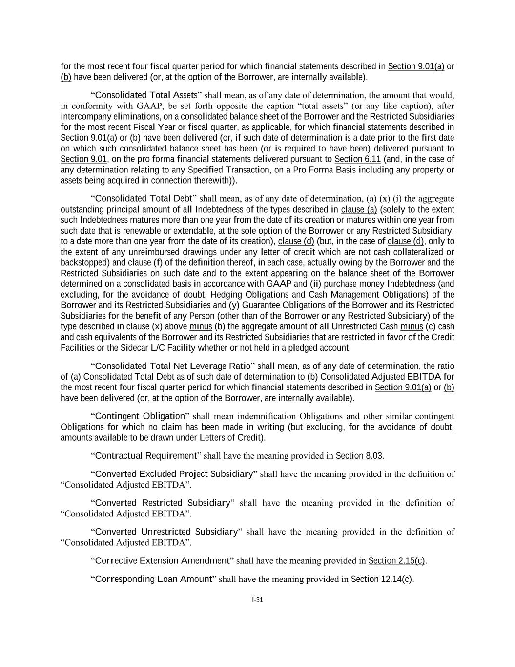 I-31 for the most recent four fiscal quarter period for which financial statements described in Section 9.01(a) or (b) have been delivered (or, at the option of the Borrower, are internally available). “Consolidated Total Assets” shall mean, as of any date of determination, the amount that would, in conformity with GAAP, be set forth opposite the caption “total assets” (or any like caption), after intercompany eliminations, on a consolidated balance sheet of the Borrower and the Restricted Subsidiaries for the most recent Fiscal Year or fiscal quarter, as applicable, for which financial statements described in Section 9.01(a) or (b) have been delivered (or, if such date of determination is a date prior to the first date on which such consolidated balance sheet has been (or is required to have been) delivered pursuant to Section 9.01, on the pro forma financial statements delivered pursuant to Section 6.11 (and, in the case of any determination relating to any Specified Transaction, on a Pro Forma Basis including any property or assets being acquired in connection therewith)). “Consolidated Total Debt” shall mean, as of any date of determination, (a) (x) (i) the aggregate outstanding principal amount of all Indebtedness of the types described in clause (a) (solely to the extent such Indebtedness matures more than one year from the date of its creation or matures within one year from such date that is renewable or extendable, at the sole option of the Borrower or any Restricted Subsidiary, to a date more than one year from the date of its creation), clause (d) (but, in the case of clause (d), only to the extent of any unreimbursed drawings under any letter of credit which are not cash collateralized or backstopped) and clause (f) of the definition thereof, in each case, actually owing by the Borrower and the Restricted Subsidiaries on such date and to the extent appearing on the balance sheet of the Borrower determined on a consolidated basis in accordance with GAAP and (ii) purchase money Indebtedness (and excluding, for the avoidance of doubt, Hedging Obligations and Cash Management Obligations) of the Borrower and its Restricted Subsidiaries and (y) Guarantee Obligations of the Borrower and its Restricted Subsidiaries for the benefit of any Person (other than of the Borrower or any Restricted Subsidiary) of the type described in clause (x) above minus (b) the aggregate amount of all Unrestricted Cash minus (c) cash and cash equivalents of the Borrower and its Restricted Subsidiaries that are restricted in favor of the Credit Facilities or the Sidecar L/C Facility whether or not held in a pledged account. “Consolidated Total Net Leverage Ratio” shall mean, as of any date of determination, the ratio of (a) Consolidated Total Debt as of such date of determination to (b) Consolidated Adjusted EBITDA for the most recent four fiscal quarter period for which financial statements described in Section 9.01(a) or (b) have been delivered (or, at the option of the Borrower, are internally available). “Contingent Obligation” shall mean indemnification Obligations and other similar contingent Obligations for which no claim has been made in writing (but excluding, for the avoidance of doubt, amounts available to be drawn under Letters of Credit). “Contractual Requirement” shall have the meaning provided in Section 8.03. “Converted Excluded Project Subsidiary” shall have the meaning provided in the definition of “Consolidated Adjusted EBITDA”. “Converted Restricted Subsidiary” shall have the meaning provided in the definition of “Consolidated Adjusted EBITDA”. “Converted Unrestricted Subsidiary” shall have the meaning provided in the definition of “Consolidated Adjusted EBITDA”. “Corrective Extension Amendment” shall have the meaning provided in Section 2.15(c). “Corresponding Loan Amount” shall have the meaning provided in Section 12.14(c).