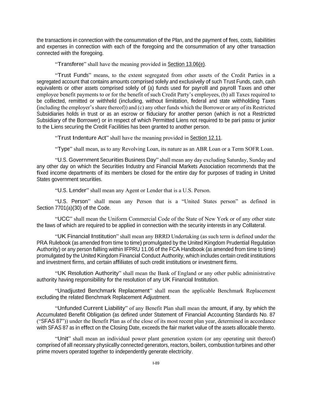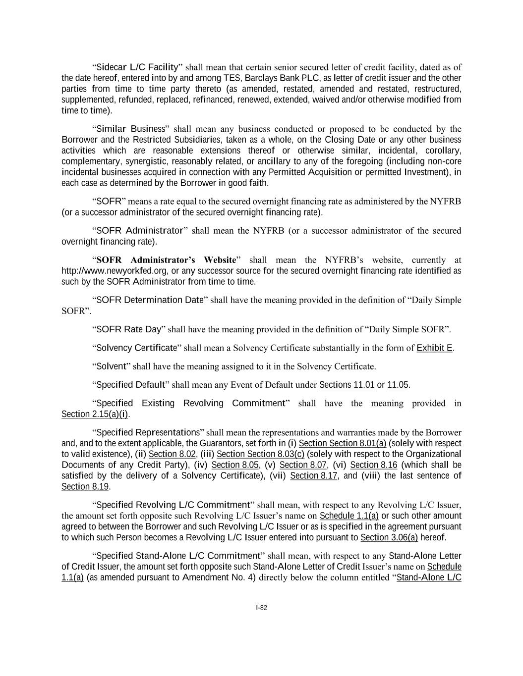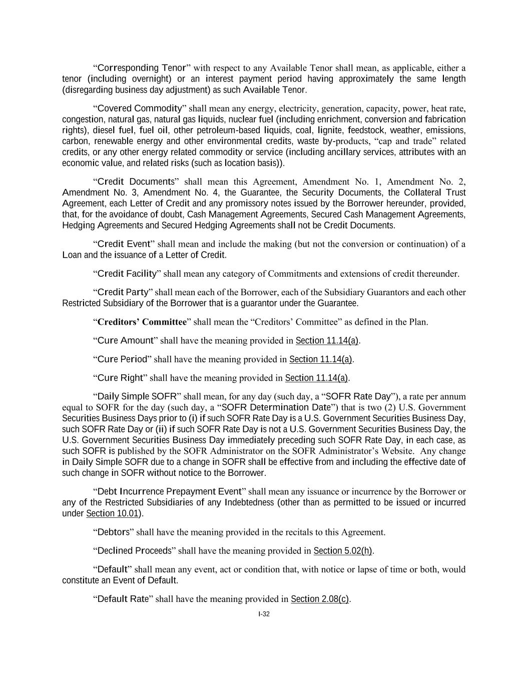 I-32 “Corresponding Tenor” with respect to any Available Tenor shall mean, as applicable, either a tenor (including overnight) or an interest payment period having approximately the same length (disregarding business day adjustment) as such Available Tenor. “Covered Commodity” shall mean any energy, electricity, generation, capacity, power, heat rate, congestion, natural gas, natural gas liquids, nuclear fuel (including enrichment, conversion and fabrication rights), diesel fuel, fuel oil, other petroleum-based liquids, coal, lignite, feedstock, weather, emissions, carbon, renewable energy and other environmental credits, waste by-products, “cap and trade” related credits, or any other energy related commodity or service (including ancillary services, attributes with an economic value, and related risks (such as location basis)). “Credit Documents” shall mean this Agreement, Amendment No. 1, Amendment No. 2, Amendment No. 3, Amendment No. 4, the Guarantee, the Security Documents, the Collateral Trust Agreement, each Letter of Credit and any promissory notes issued by the Borrower hereunder, provided, that, for the avoidance of doubt, Cash Management Agreements, Secured Cash Management Agreements, Hedging Agreements and Secured Hedging Agreements shall not be Credit Documents. “Credit Event” shall mean and include the making (but not the conversion or continuation) of a Loan and the issuance of a Letter of Credit. “Credit Facility” shall mean any category of Commitments and extensions of credit thereunder. “Credit Party” shall mean each of the Borrower, each of the Subsidiary Guarantors and each other Restricted Subsidiary of the Borrower that is a guarantor under the Guarantee. “Creditors’ Committee” shall mean the “Creditors’ Committee” as defined in the Plan. “Cure Amount” shall have the meaning provided in Section 11.14(a). “Cure Period” shall have the meaning provided in Section 11.14(a). “Cure Right” shall have the meaning provided in Section 11.14(a). “Daily Simple SOFR” shall mean, for any day (such day, a “SOFR Rate Day”), a rate per annum equal to SOFR for the day (such day, a “SOFR Determination Date”) that is two (2) U.S. Government Securities Business Days prior to (i) if such SOFR Rate Day is a U.S. Government Securities Business Day, such SOFR Rate Day or (ii) if such SOFR Rate Day is not a U.S. Government Securities Business Day, the U.S. Government Securities Business Day immediately preceding such SOFR Rate Day, in each case, as such SOFR is published by the SOFR Administrator on the SOFR Administrator’s Website. Any change in Daily Simple SOFR due to a change in SOFR shall be effective from and including the effective date of such change in SOFR without notice to the Borrower. “Debt Incurrence Prepayment Event” shall mean any issuance or incurrence by the Borrower or any of the Restricted Subsidiaries of any Indebtedness (other than as permitted to be issued or incurred under Section 10.01). “Debtors” shall have the meaning provided in the recitals to this Agreement. “Declined Proceeds” shall have the meaning provided in Section 5.02(h). “Default” shall mean any event, act or condition that, with notice or lapse of time or both, would constitute an Event of Default. “Default Rate” shall have the meaning provided in Section 2.08(c).